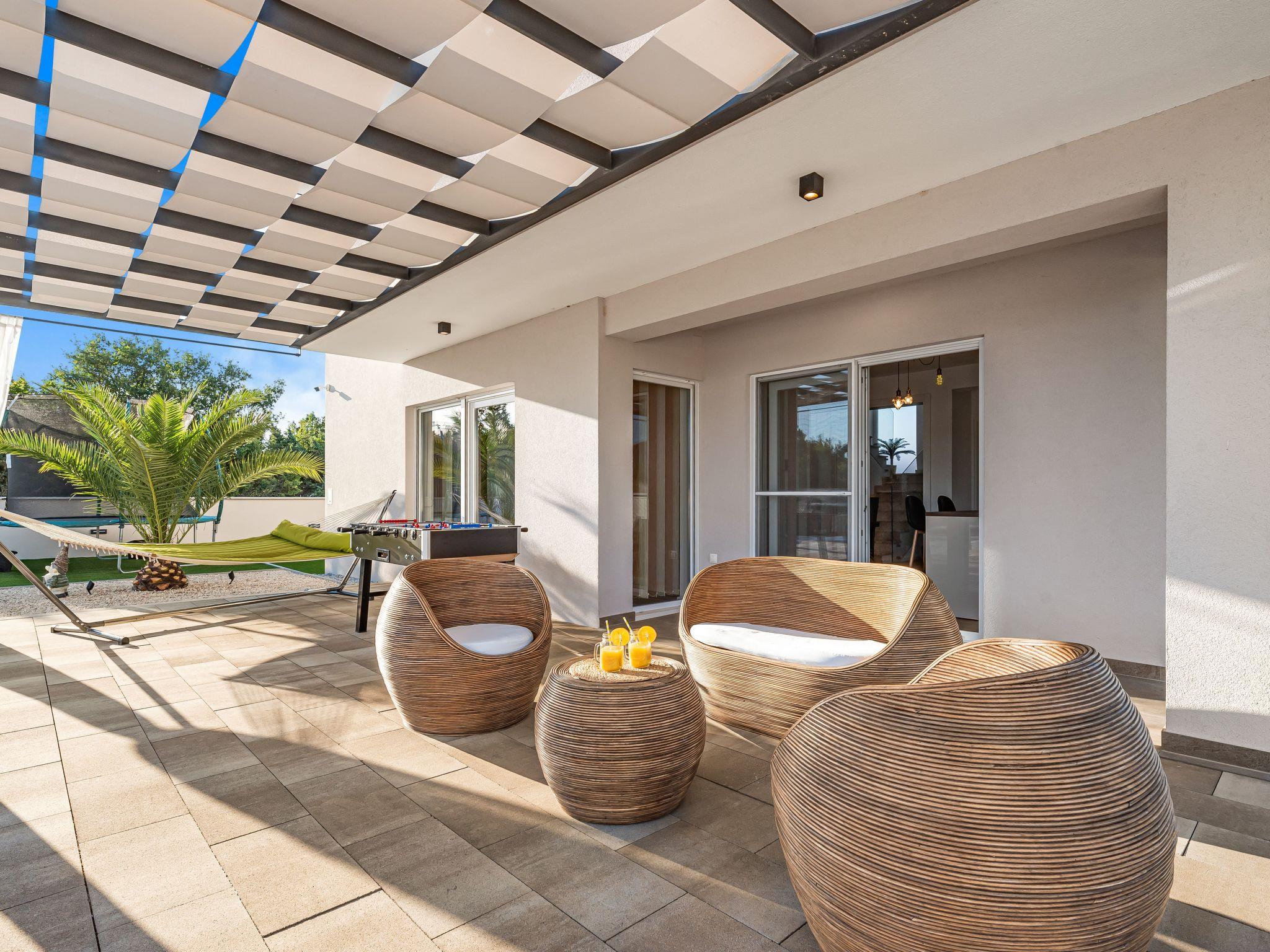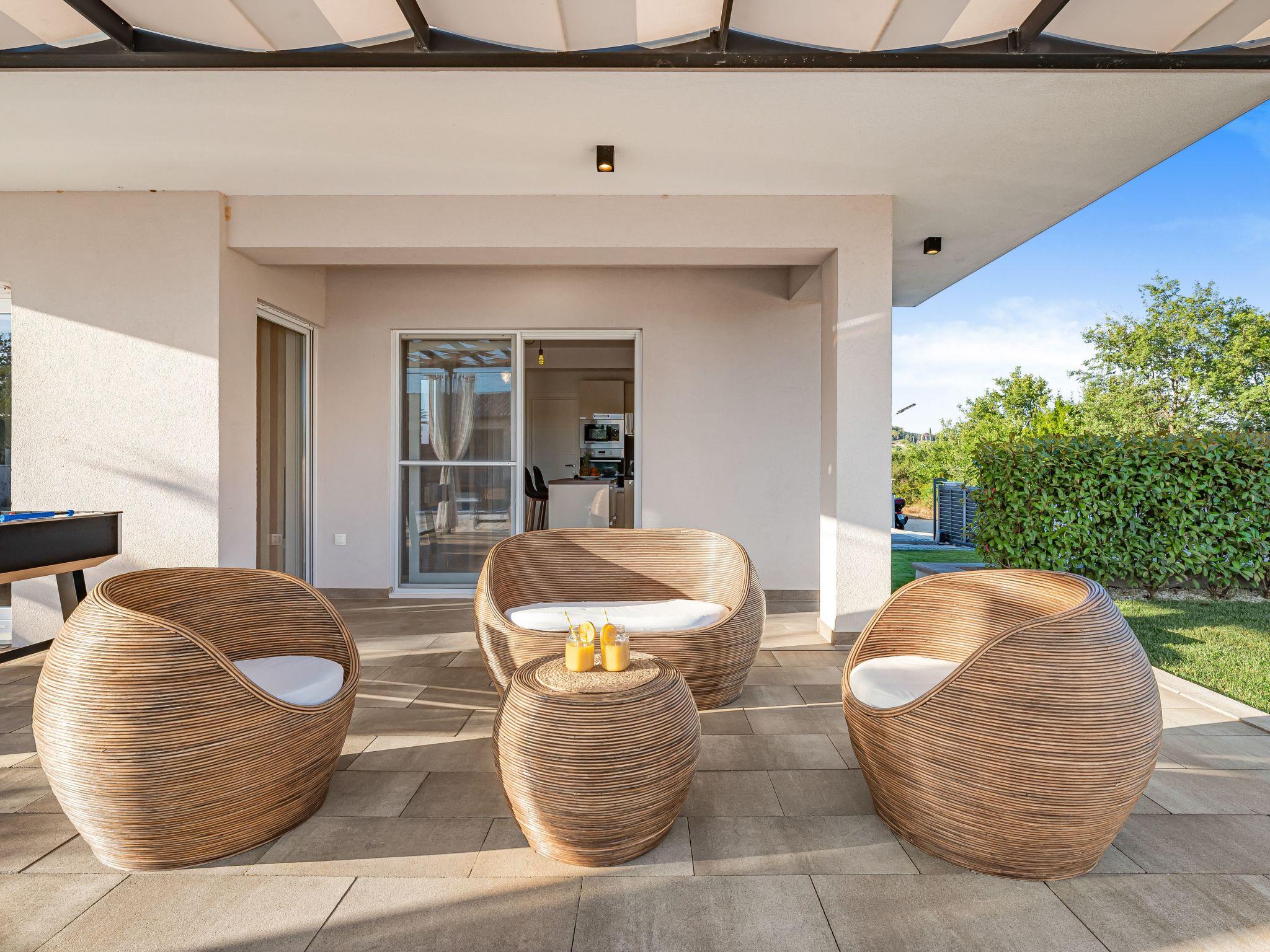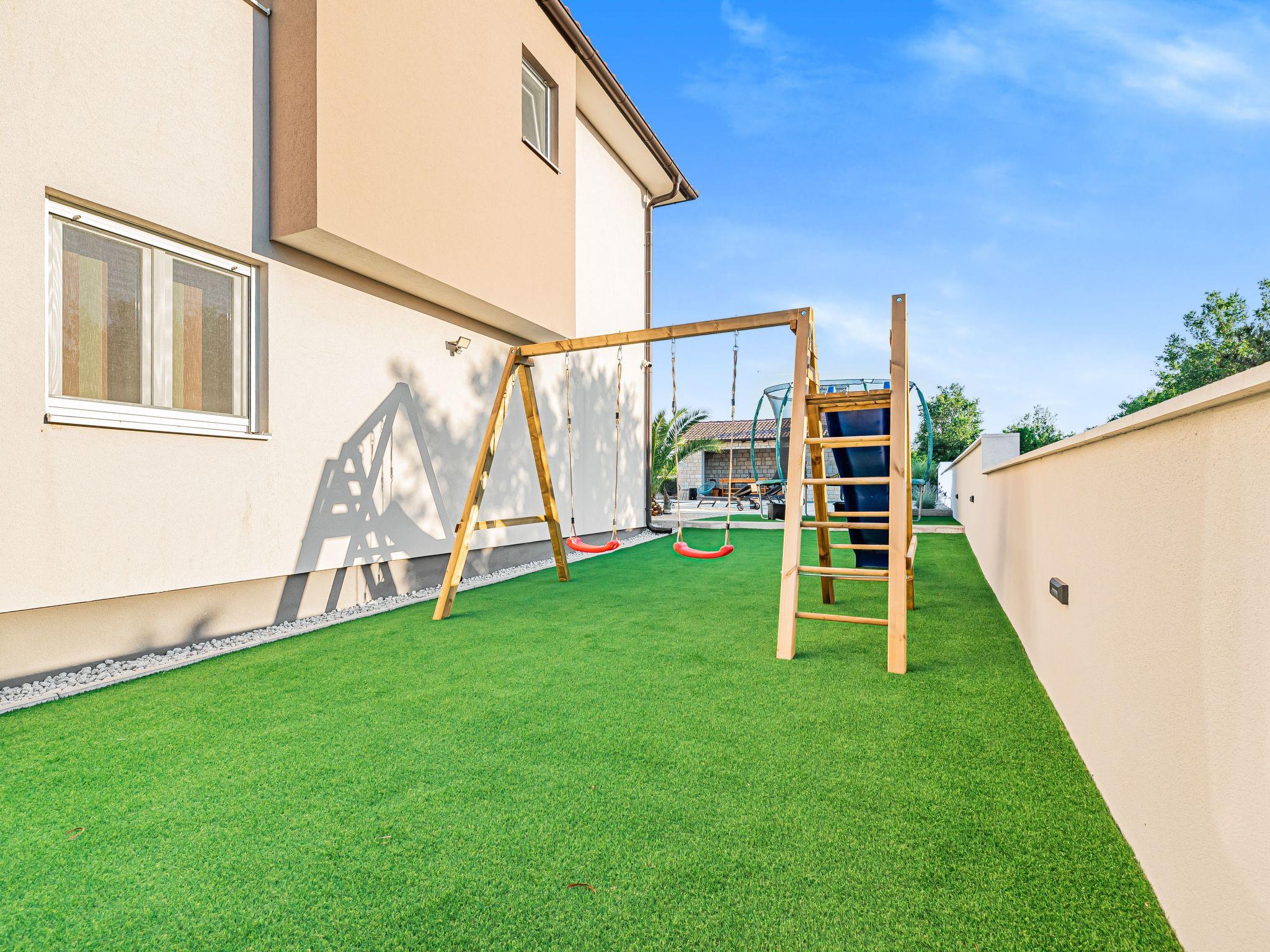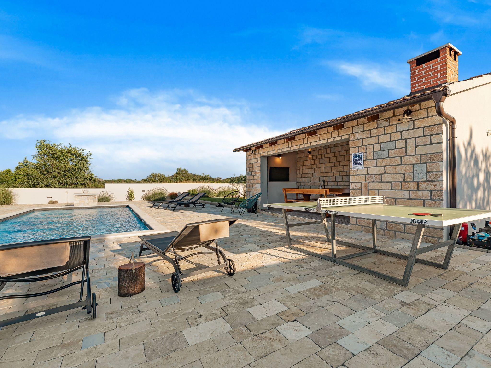 The exterior space of this holiday house is equally inviting. The private garden is a serene backdrop for mornings filled with leisurely breakfasts or evenings of relaxation. The highlight, without doubt, is the swimming pool, reserved solely for your use, perfect for refreshing dips or lounging under the sun. Furthermore, the property boasts facilities that cater to a variety of interests; from a trampoline and children's playground ensuring young ones are entertained, to a table tennis setup for spirited games among friends or family.