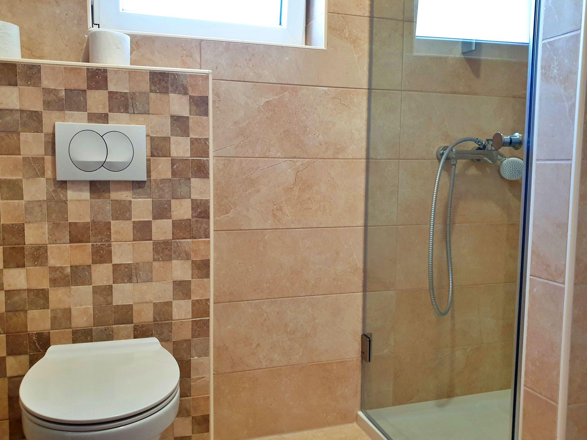 This lovely apartment spans the ground and first floor, featuring two bedrooms with queen beds and sea views. The ground floor includes a 15 m2 roofed terrace with a dining table and sea views. The kitchen is fully equipped with a ceramic stove, microwave, fridge with freezer, dishwasher, coffee machine, kettle, and dining table. The living room offers air conditioning, satellite TV, a sofa, and terrace access. The apartment has a bathroom with a shower, toilet, and hairdryer, plus an additional toilet. Guests enjoy free Wi-Fi, private parking, a gas BBQ, and a shared yard with a children's playground. Located just 160 m from a concrete and pebble beach, the house also features floor cooling and heating for year-round comfort.