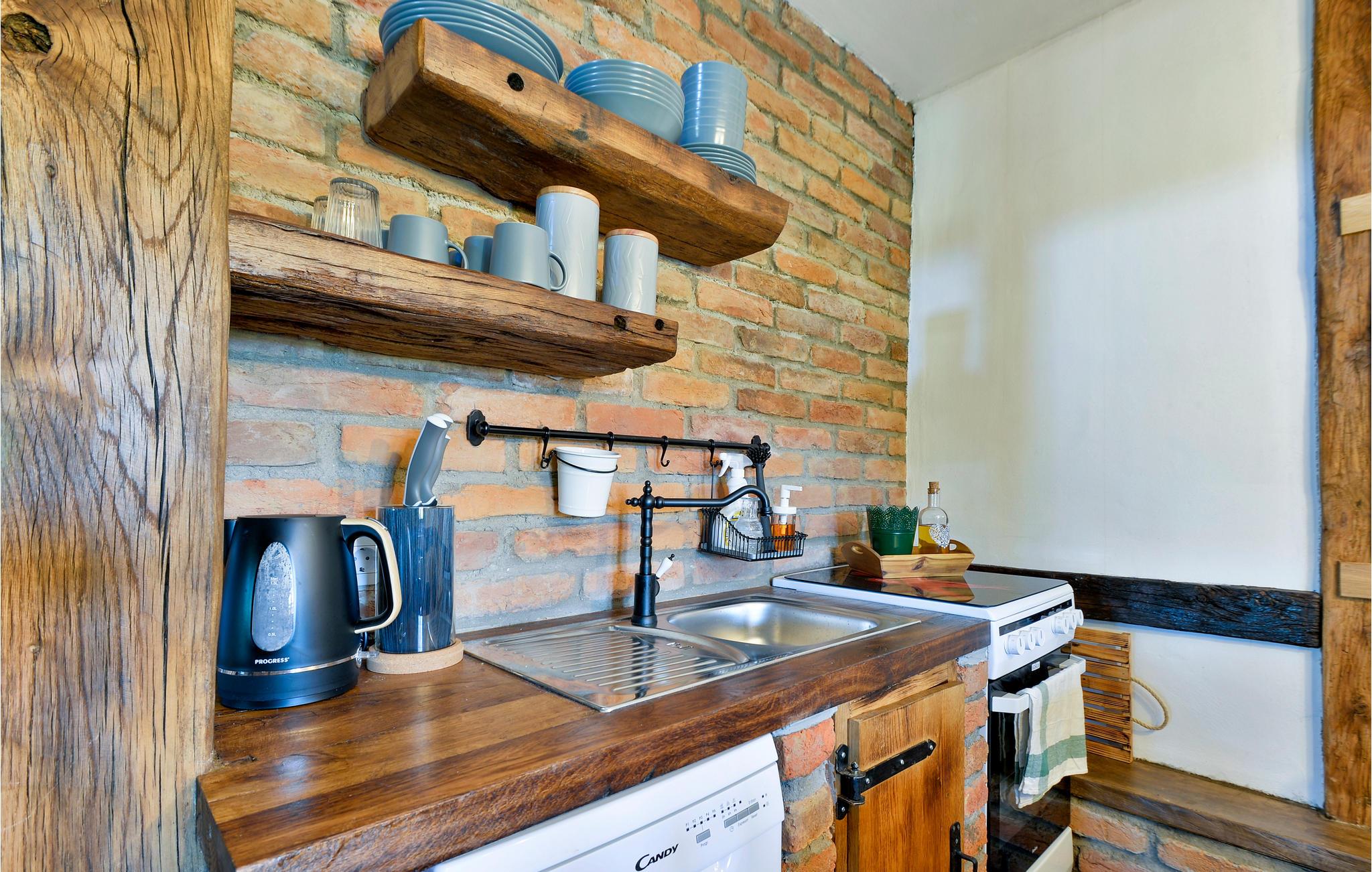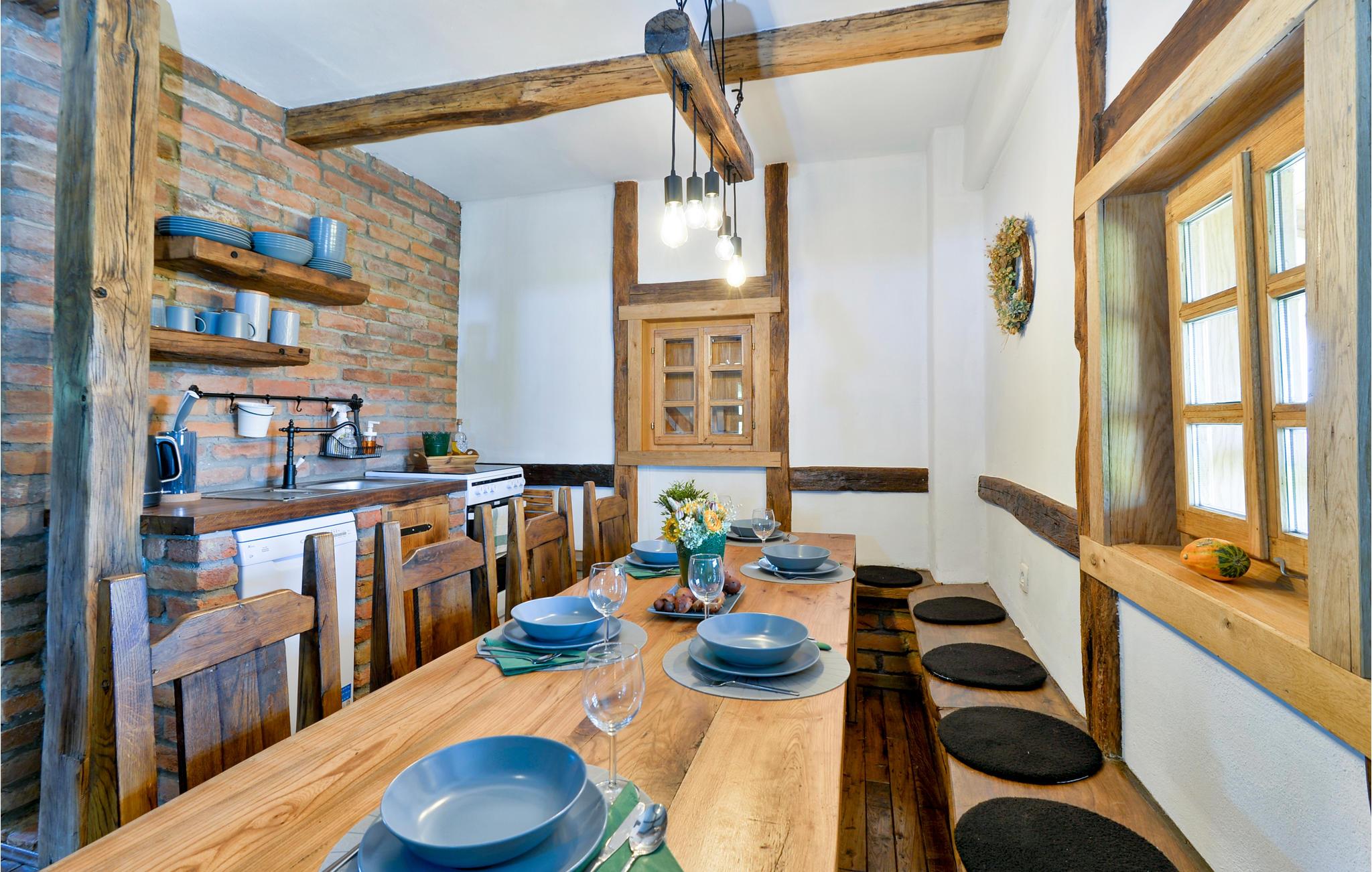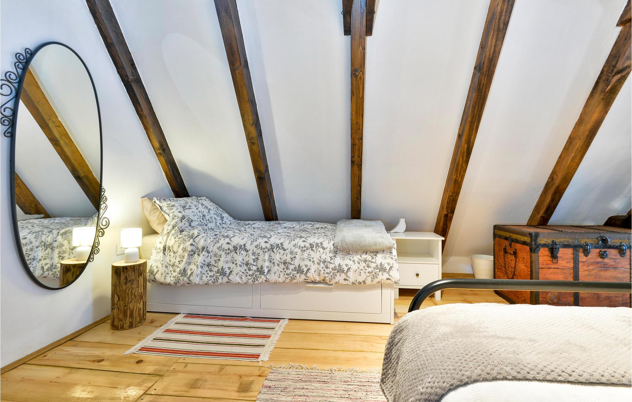 Huset har et åbent design, og traditionelle elementer er kombineret med moderne. De synlige træbjælker sikrer en masse hygge. Det åbne køkken med spiseplads danner centrum af huset, hvor I kan spise og lave mad sammen. Efter middagen samles i den hyggelige stue på sofaen og ser en spændende film med familien. I kommer til soveværelserne via den imponerende trætrappe. Bemærk, at soveværelserne kun er opdelt med gardiner. Nogle steder er der lav lofthøjde. Der er en dobbeltseng i soveværelse 3, som ligger i gården og har egen indgang.