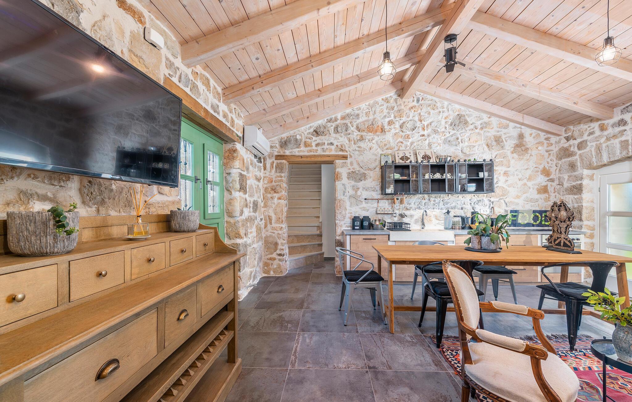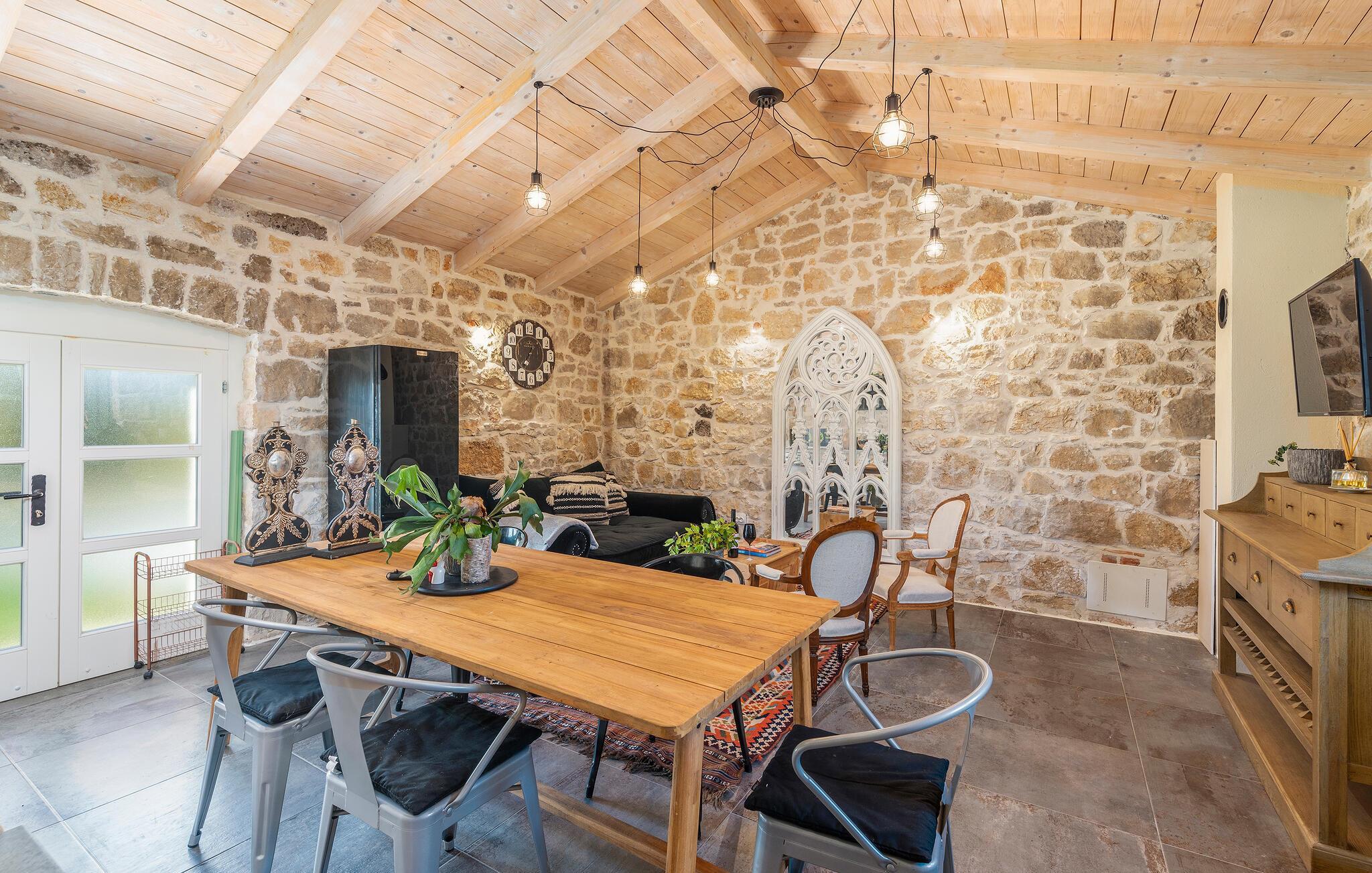 Rustik charme møder moderne komfort i dette indbydende og rummelige feriehus. Gør lækre kroatiske retter klar i det åbne, fuldt udstyrede køkken, og tag plads ved det stilfulde træbord. Fordyb jer i den hyggelige atmosfære i stuen, slap af i den behagelige sofa med en god bog, som I ikke finder tid til i hverdagen, eller brug tiden sammen til en spilleaften.