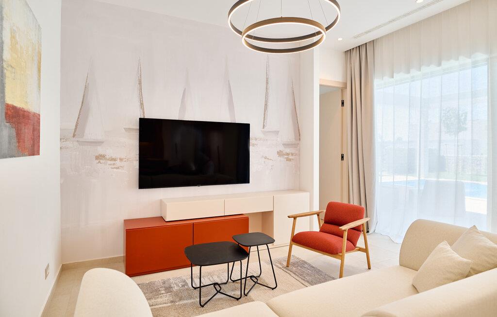 Interiøret lægger vægt på varme og funktionalitet, karakteriseret ved minimalistisk design og materialer af høj kvalitet. Læn jer tilbage i den åbne stue med en behagelig sofa, moderne møbler og store panoramavinduer. Brug den elegante spiseplads til fælles måltider eller tilbered kulinariske lækkerier i det smukke køkken.