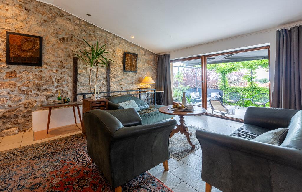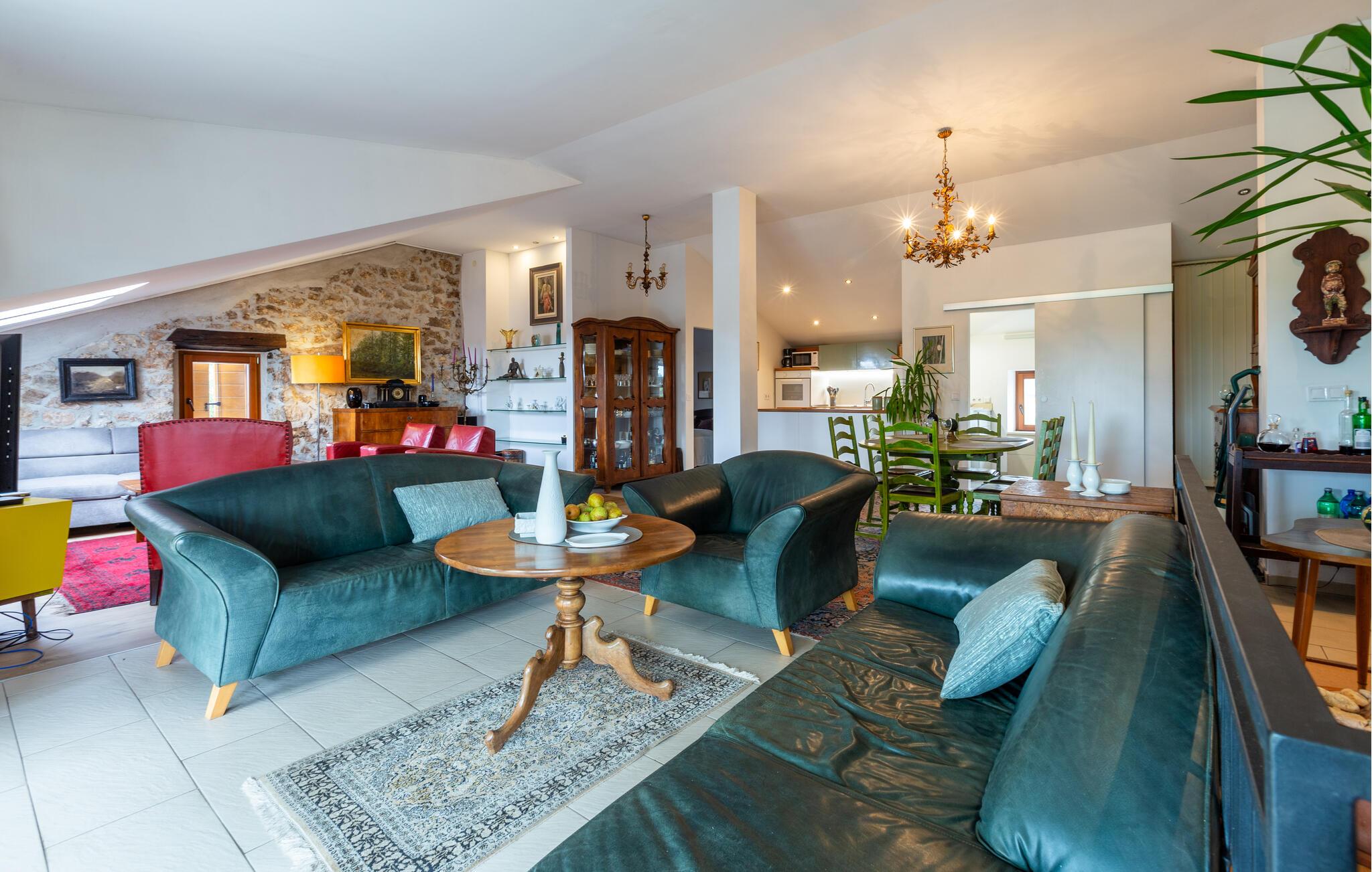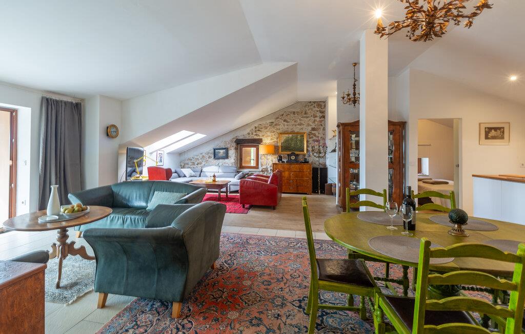 Velkommen til denne skønne lejlighed, som byder sine gæster velkommen med stilfuldt møblerede rum og varme farver i en historisk bygning, hvor elementer som det synlige murværk vidner om husets historie. Slå jer ned med familien og nyd komforten og den smagfulde atmosfære. Flere siddegrupper indbyder til afslapning.