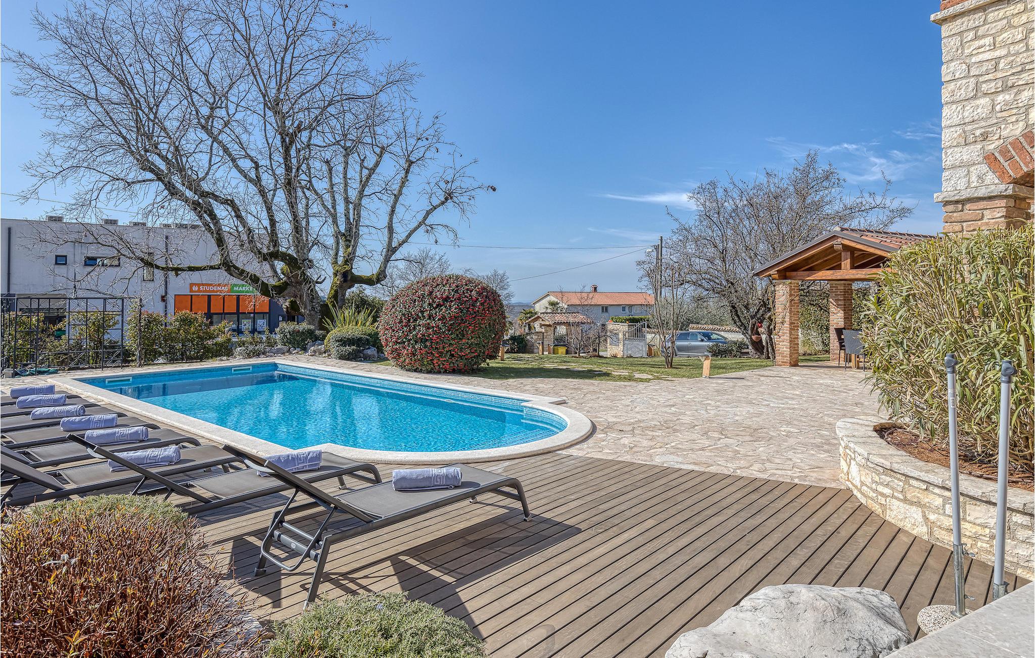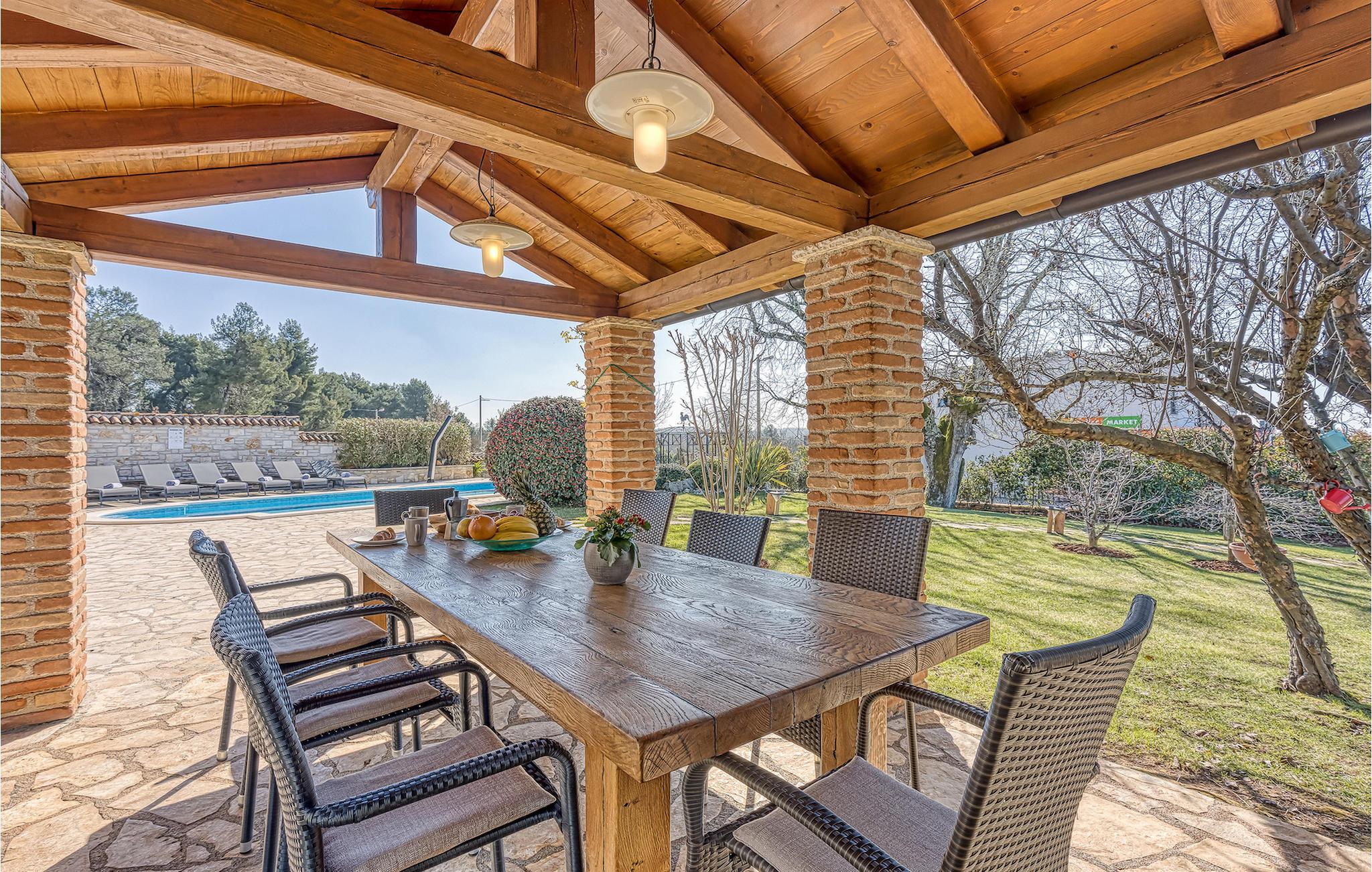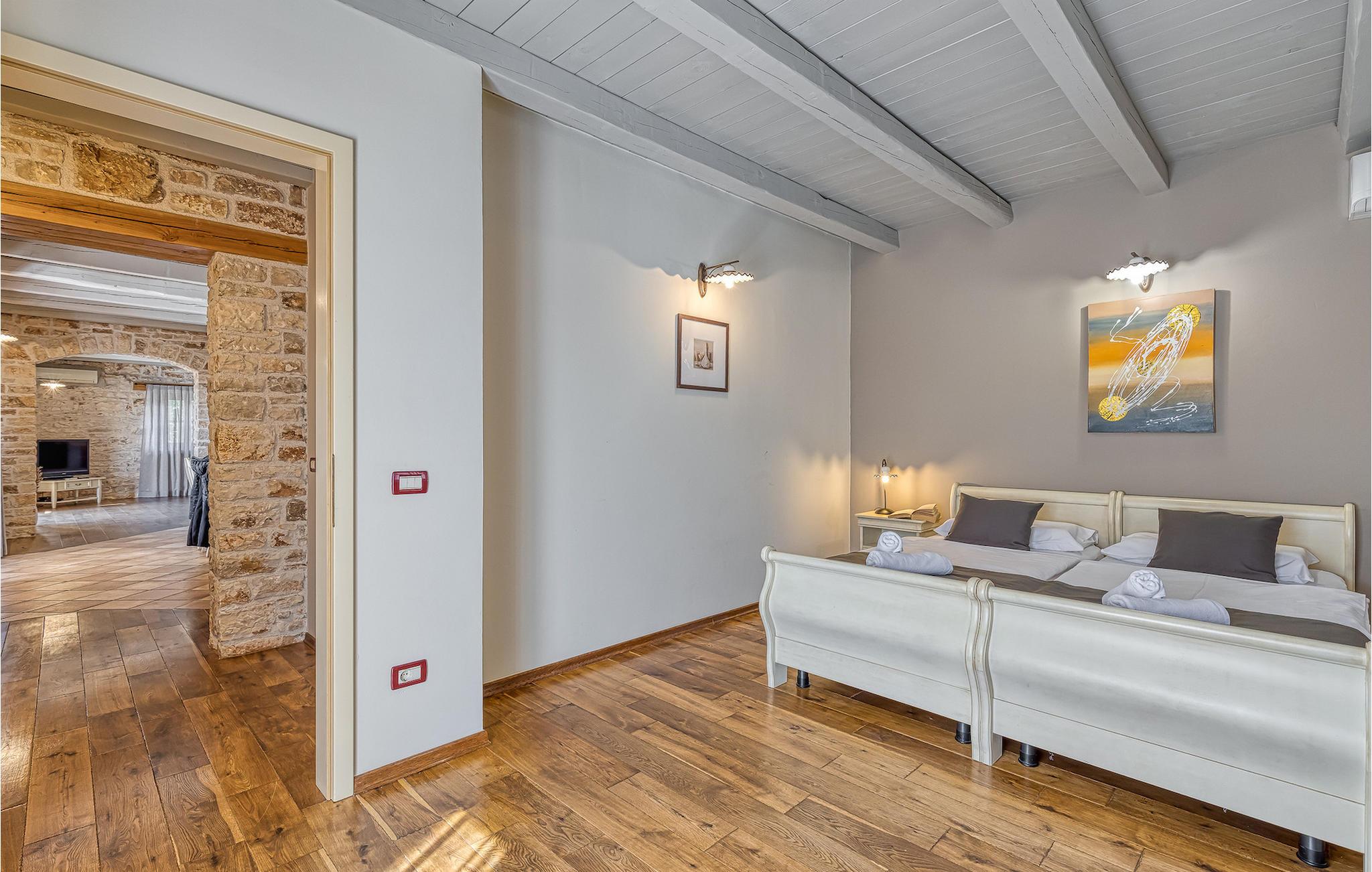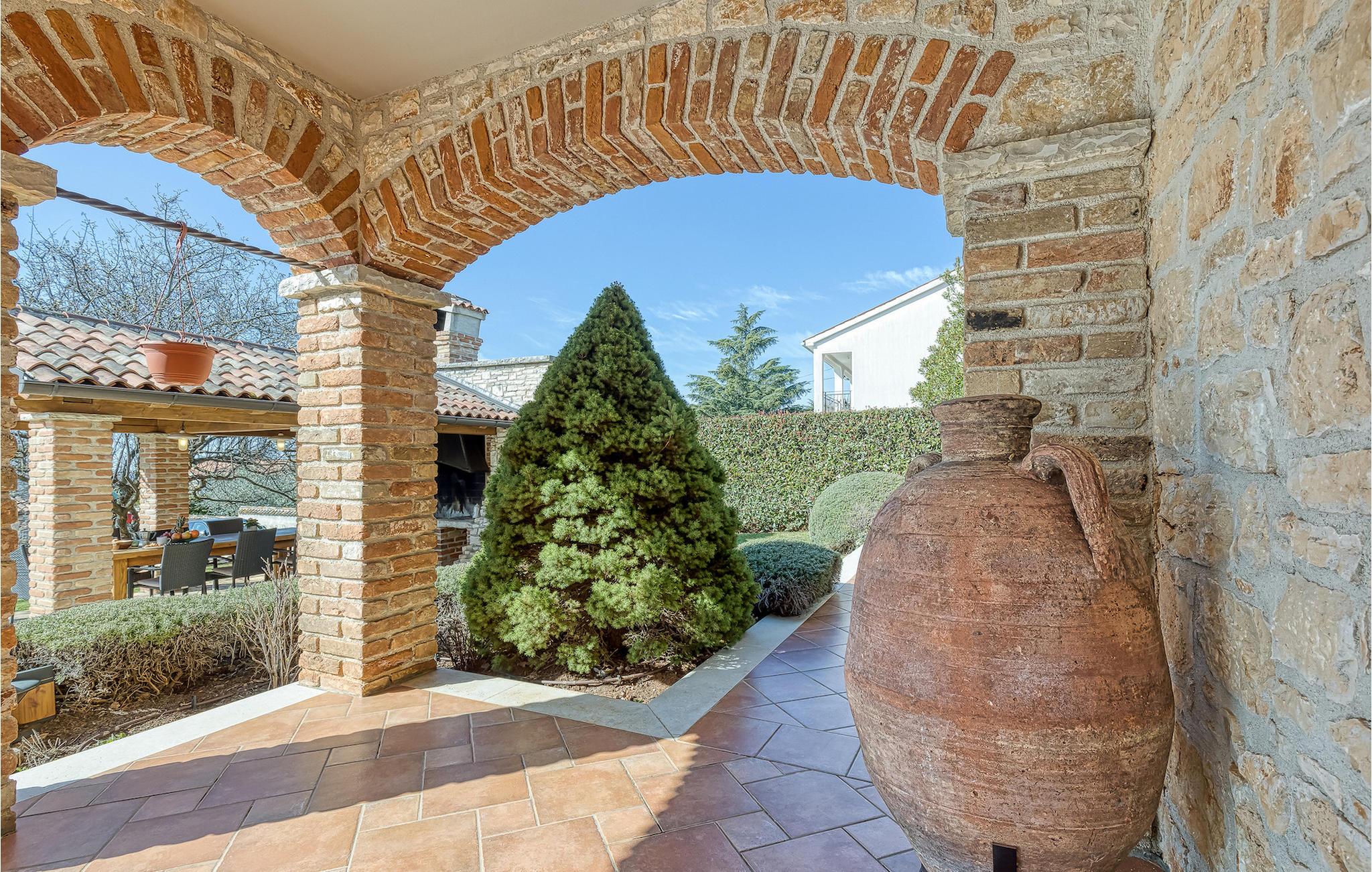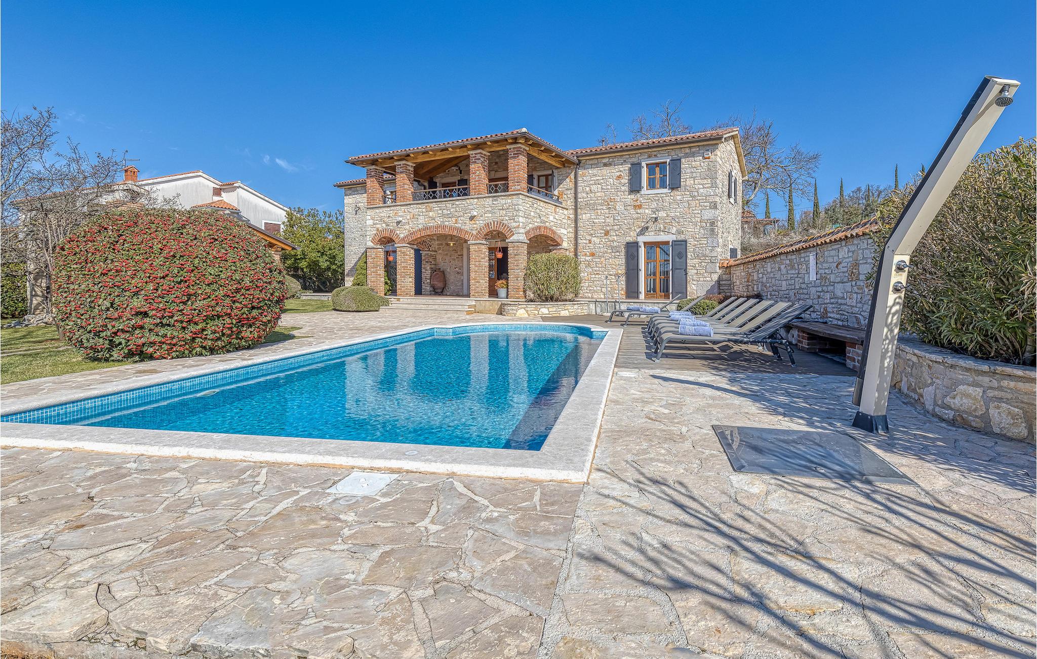 Villa Graziella er en traditionel istrisk ædelsten beliggende i landsbyen Baderna nær Porec. Huset er bygget i 1905 og totalrenoveret i 2008, uden at miste sin karakter. Du vil blive imponeret over det ydre med en omhyggeligt plejet have og den store pool. Et perfekt landskab til at få en kølig drink, ligge på en af solsengene og se børnene lege. Den overdækkede udendørs spiseplads med grill får dig straks til at drømme om frisklavede lækre måltider. Men lad os gå indenfor... Stueetagen har en hyggelig stue med pejs og et køkken med spiseplads til op til 8 gæster. Alt er holdt i en meget varm og rustik stil - giver dig en følelse af hjem. På samme etage finder du et soveværelse med eget badeværelse. Trætrapper fører til de 3 hyggelige soveværelser med moderne ensuite badeværelser på første sal. Et af soveværelserne har udgang til den smukke altan, hvor du kan nyde en stille morgenkaffe eller blot slappe af, mens du læser din yndlingsbog. Baderna er en charmerende istrisk, malerisk landsby nær byen Porec, Adriaterhavets berømte og prisbelønnede mesterperle. Baderna ligger 10 kilometer fra havet, isoleret fra byernes sus, samtidig med at det er strategisk beliggende nær krydset mellem de vigtigste turistruter i Istrien. Alt hvad du behøver er der: posthus, en købmand, en tankstation og et par restauranter. Istriske turistperler: Opatija, Rovinj, Pula, Trieste, Koper, Piran, Portoroz, Umag og Novigrad er mindre end en time væk, så du skal kun vælge, om du vil slappe af omgivet af olivenlunde og vinmarker, nyde den istriske eno-gastronomi delikatesser, eller gå på opdagelse i omgivelserne. Huset er perfekt for familier til at nyde en fantastisk ferie i et roligt sted, men ikke for langt væk fra seværdigheder, strande og attraktioner. En bil anbefales.