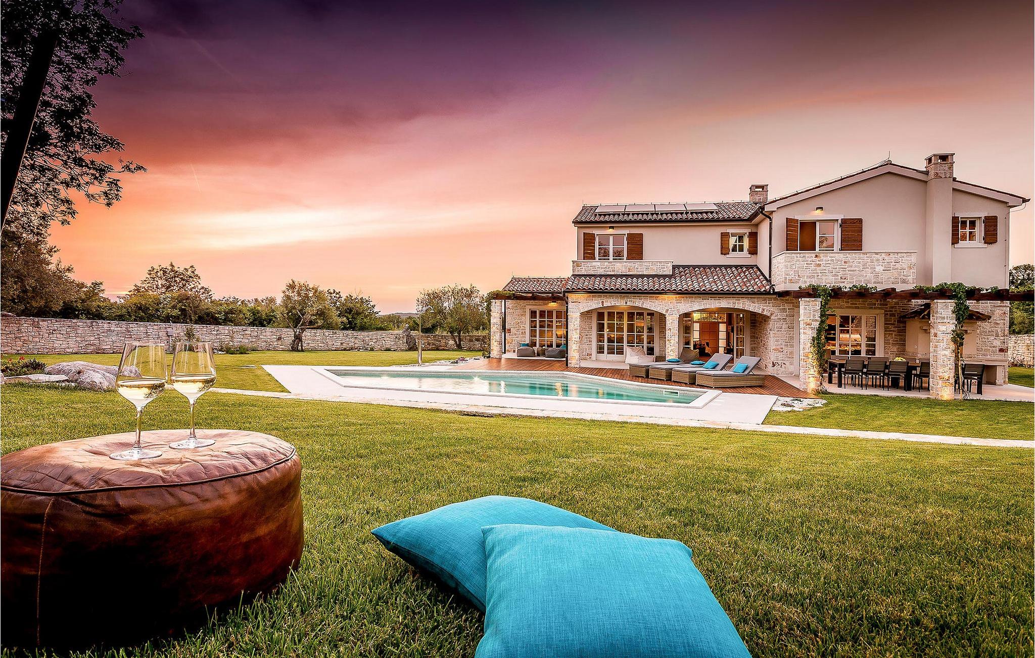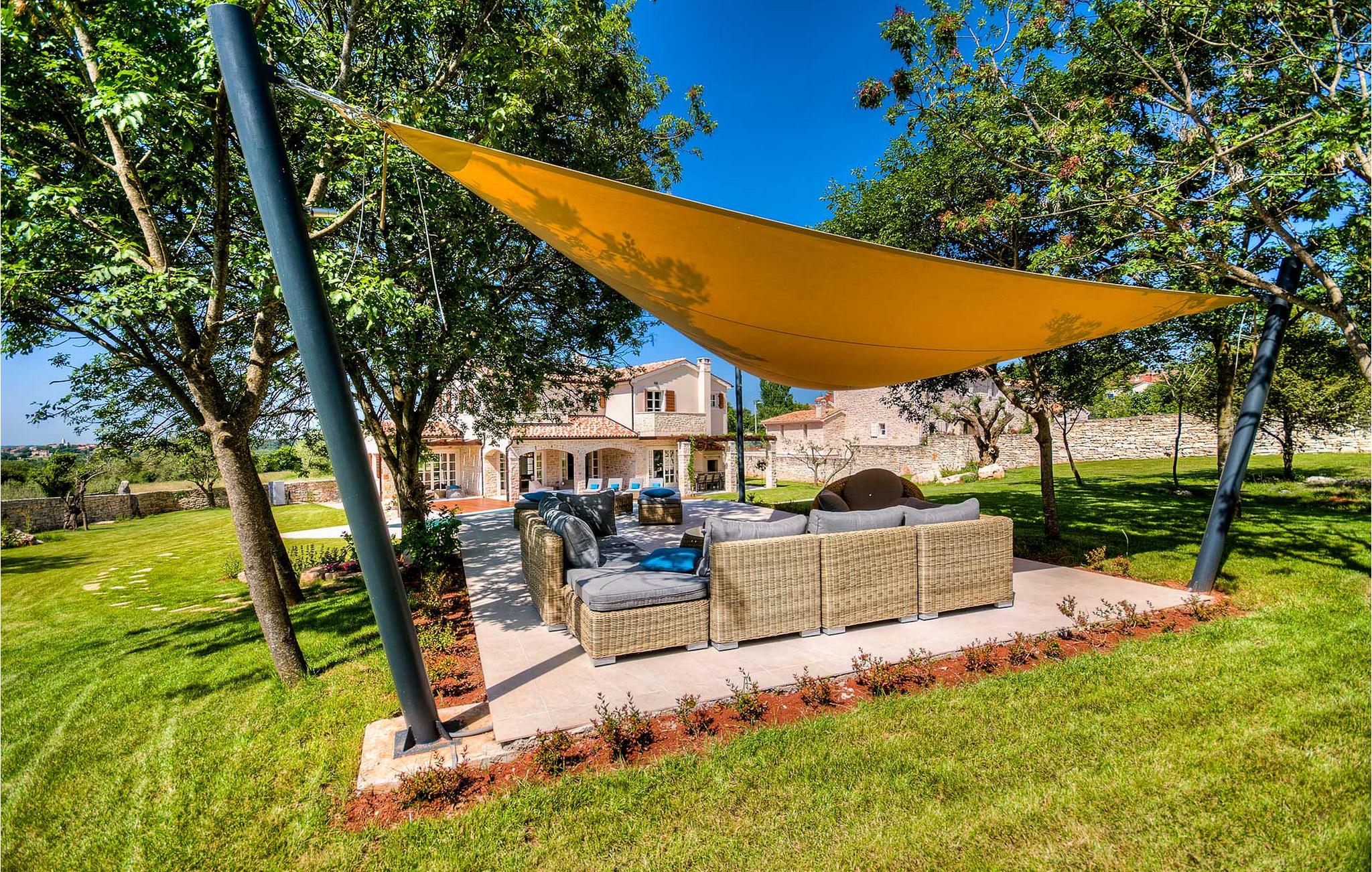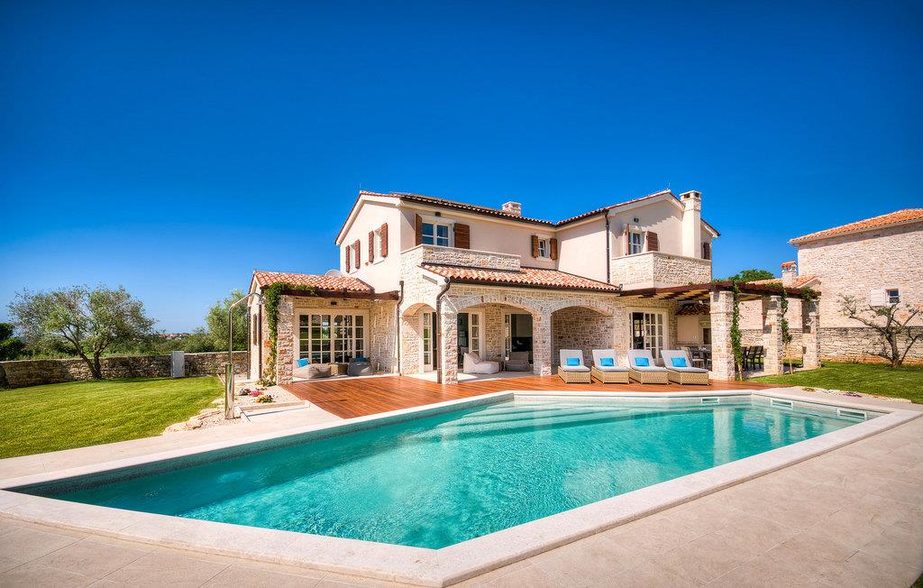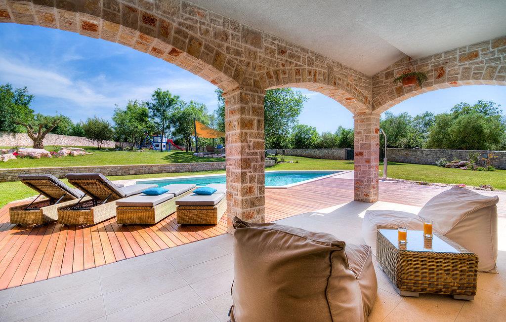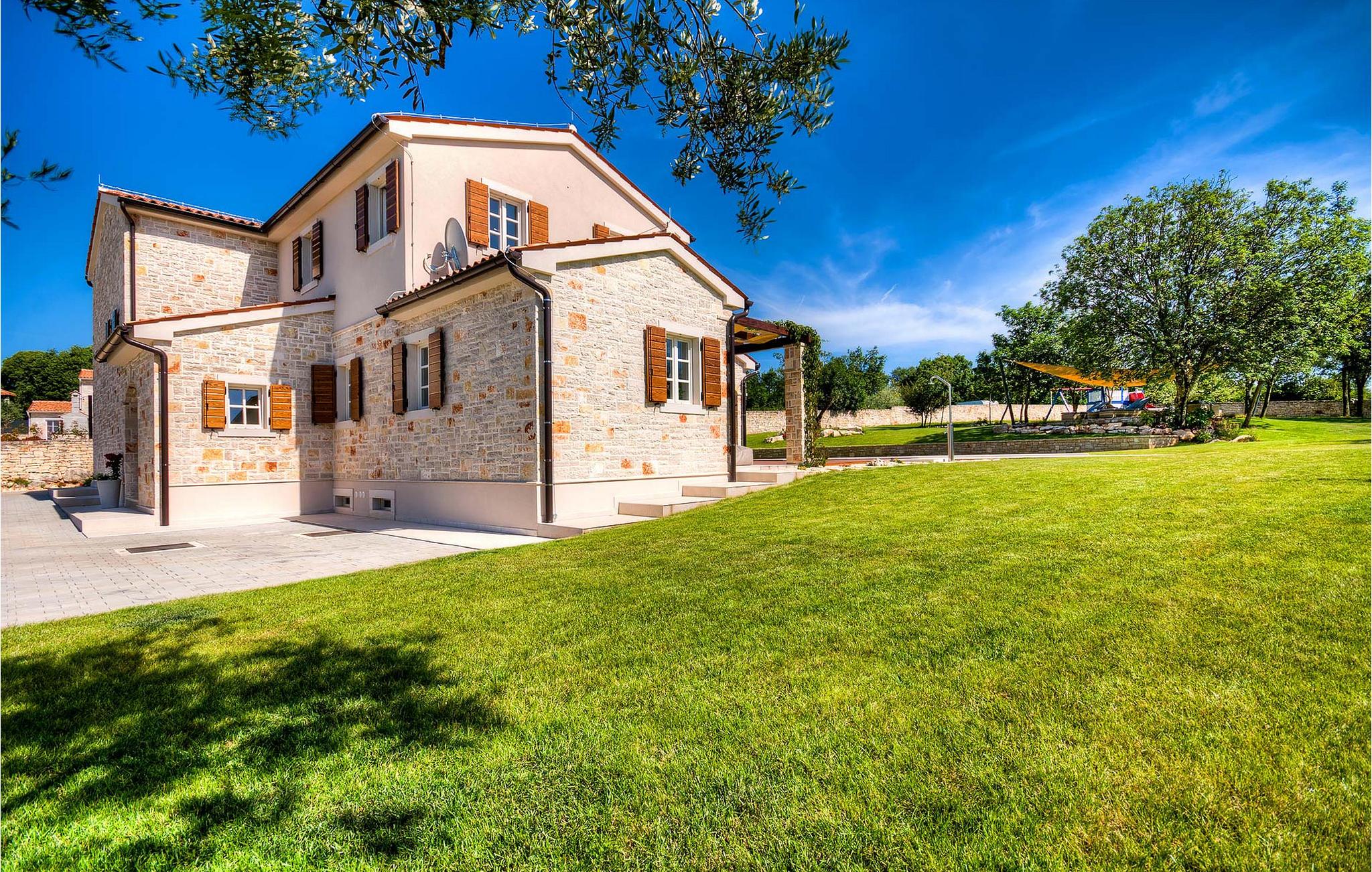 Denne charmerende nybyggede villa er det sidste hus i en lille traditionel stenhuslandsby nær Porec. Haven er stor og fuldstændig omgivet af mure og indhegnet for dit privatliv. Det har en dejlig pool, et loungeområde med udsigt over huset og en legeplads. Indgangen til poolen har brede trin, og teak terrassen er et meget behageligt område at nyde solen. Masser af naturlig skygge også fra de modne træer spredt ud i haven. Udendørsbelysningen skaber en rigtig hyggelig stemning om aftenen på den udendørs spiseplads med stort bord til 12 gæster og grill. Indenfor finder du en meget rummelig opholdsstue med åbent rum med en stor åben pejs. Fire store dobbeltdøre i glas forbinder interiøret med poolområdet udenfor. Hele huset er omhyggeligt indrettet med stor sans for detaljer og et strejf af industrielt design. Blandt andre funktioner er der de flotte træbjælker og de vintage udseende pærer. Alle de 5 soveværelser har aircondition/varme med separate kontroller. De har alle satellit-tv og eget badeværelse. To af soveværelserne kan udstyres med ekstra senge til børn, og det største har en sovesofa til to børn. I køkkenet finder du alt det moderne udstyr og masser af fint porcelænsservice og bestik. Kælderen har et poolbord og et ekstra køleskab. Wi-Fi er tilgængeligt, og du kan streame din musik til det udendørs højttalersystem fra din telefon. Plænevandingssystemet vil holde græsset pænt og grønt. Bagved er der en stor parkeringsplads med automatiserede porte, og du kan gå til en dejlig restaurant meget nærliggende.