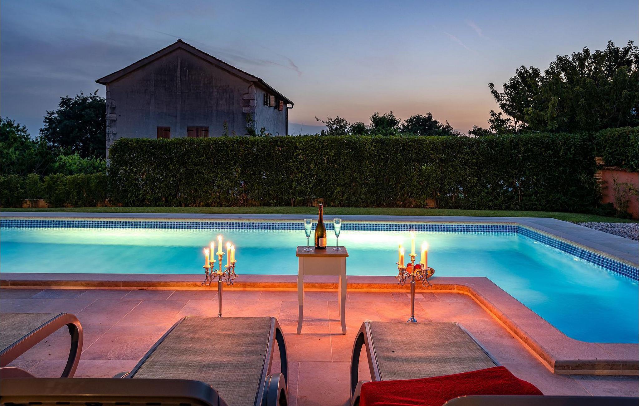 Diese elegante Villa, in der Nähe von Porec gelegen, besteht aus vier Licht-durchflutenden Schlafzimmern mit jeweils Klimaanlage und eigenem Badezimmer und ist die ideale Ferienunterkunft für bis zu 8 Personen. Die Liegestühle neben den geräumigen privaten Pool warten nur darauf, dass Sie sich entspannen und die Sonne einfach genießen. Nur ein paar Schritte vom Pool, befindet sich ein schöner Essbereich im Freien, wo Sie Ihre Grillgerichte genießen können. Der Innenbereich der Villa ist stilvoll eingerichtet, sehr hell und luftig. Das Erdgeschoss besteht aus einem der vier Schlafzimmer, einem separaten Badezimmer und einem offen gestalteten Raum, der in eine völlig ausgestattete Küche und den Ess- und Wohnbereich unterteilt ist. Die restlichen drei Schlafzimmer befinden sich auf der oberen Etage, wo Sie auch einen gemütlichen Balkon finden - den perfekten Ort, um einen Morgenkaffee zu genießen und dabei den von Palmen umgebenen Pool zu betrachten.Die Lage der Villa Cvita Domenica ist perfekt, denn sie ist nur einen kurzen Spaziergang vom nächsten Restaurant, Bar und Supermarkt entfernt, und ein paar Kilometer von der Altstadt von Porec, entfernt - dem touristischen Hotspot der Umgebung mit all seinen Sportmöglichkeiten und gastronomischen und Entertainment- Annehmlichkeiten. Die atemberaubende Euphrasius-Basilika ist das Symbol dieser Küstenstadt. Auch Sonnenuntergänge in Porec sind sehenswert. Der nächste Strand ist ca. 10 km von der Villa entfernt. Da die Küste leicht mit dem Auto erreichbar ist, haben Sie viele verschiedene Strände zu entdecken. Das Inland dieses Teils von Istrien bietet viele Wander- und Radwege sowie viele Möglichkeiten, die kleinen Städte Istriens und ihre kulturellen und gastronomischen Besonderheiten zu entdecken.