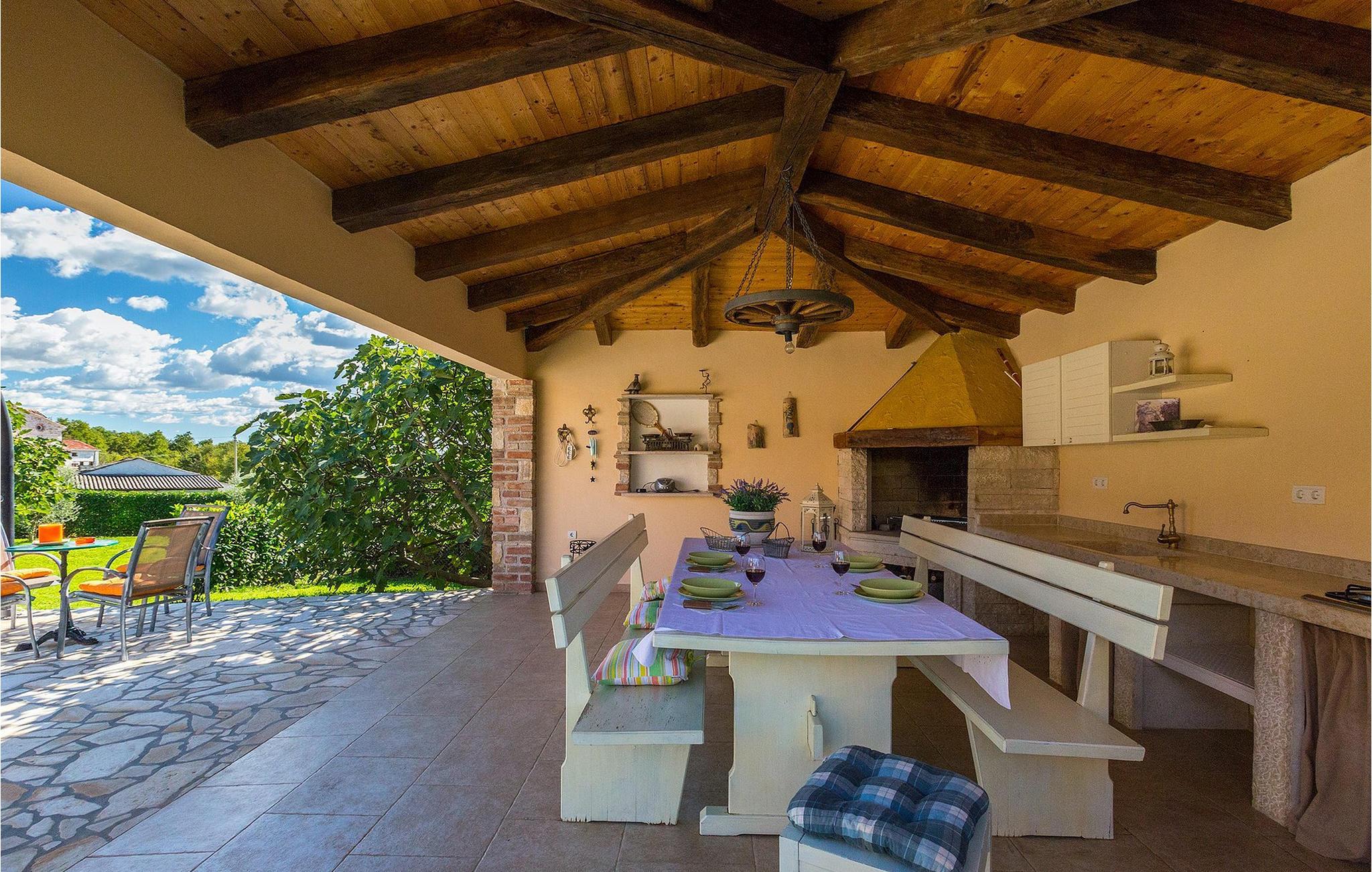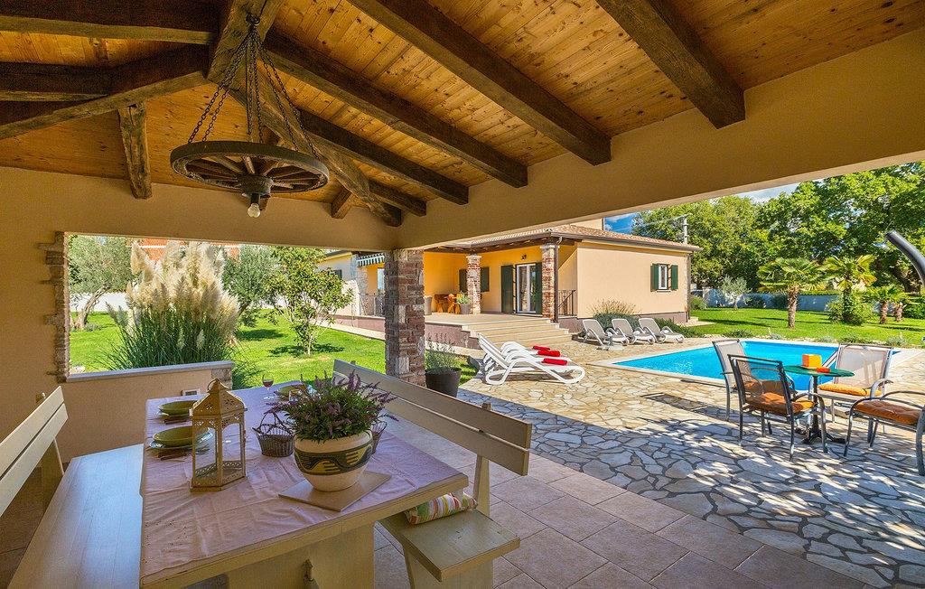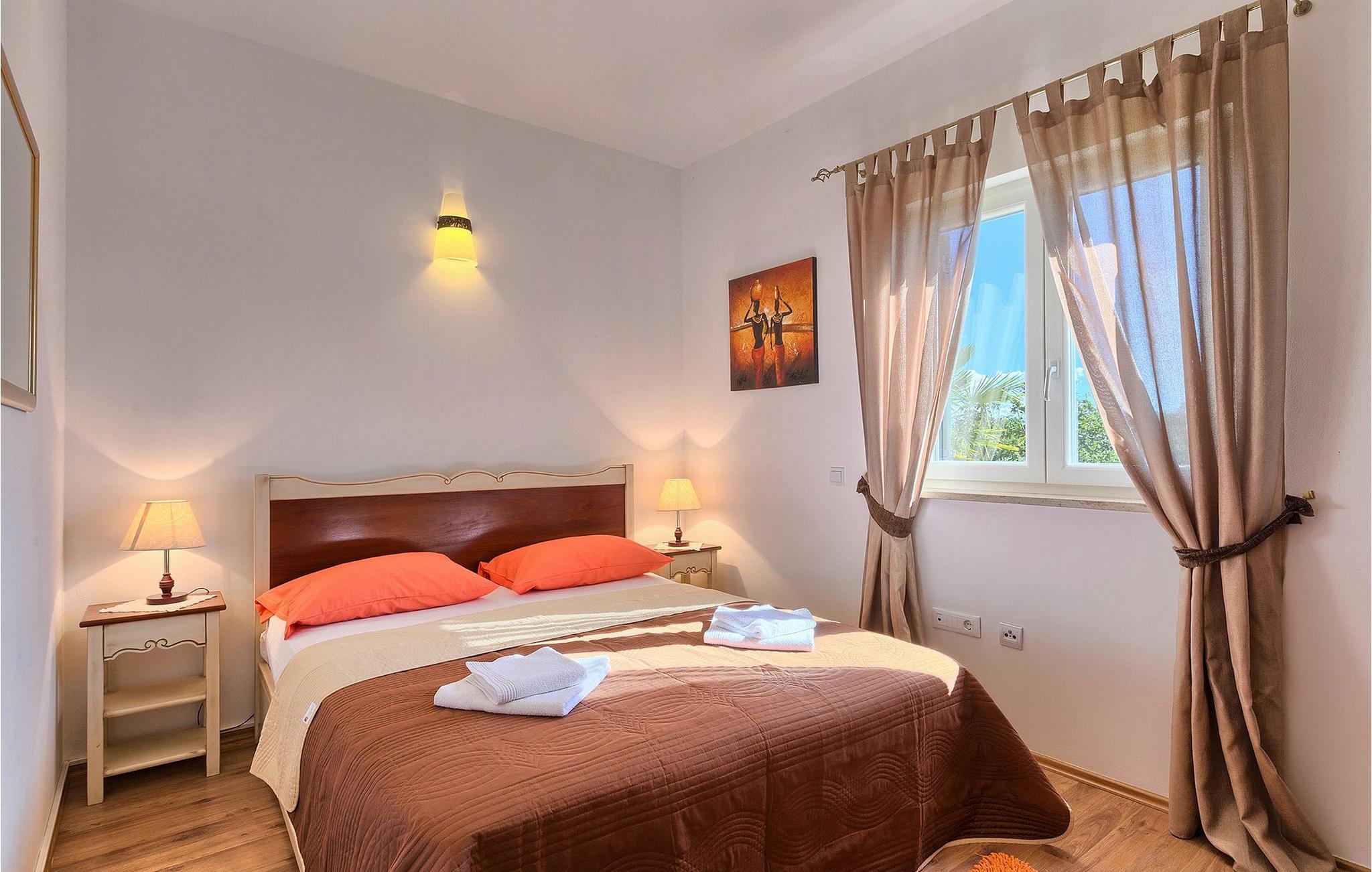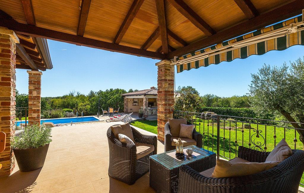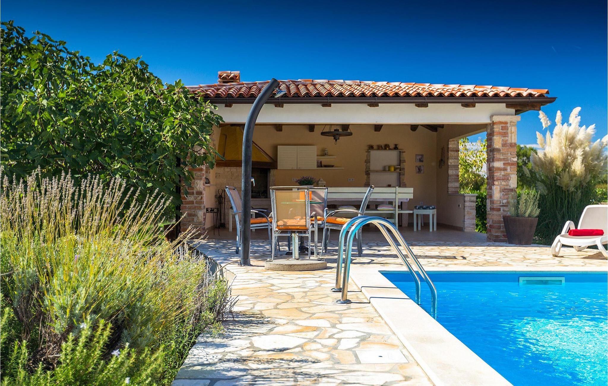 Denne ferielejlighed nær Porec ligger på første sal. Lejligheden byder på en hyggelig åben stue og spisestue med et fuldt udstyret køkken. Fra opholdsstuen har I direkte adgang til den smukke, store, grønne have, hvor I kan slappe af på en liggestol. Foran lejligheden er der en indbydende privat pool, hvor I kan forfriske jer på varme sommerdage. Udendørsområdet byder også på et veludstyret sommerkøkken med en kulgrill og en spiseplads.