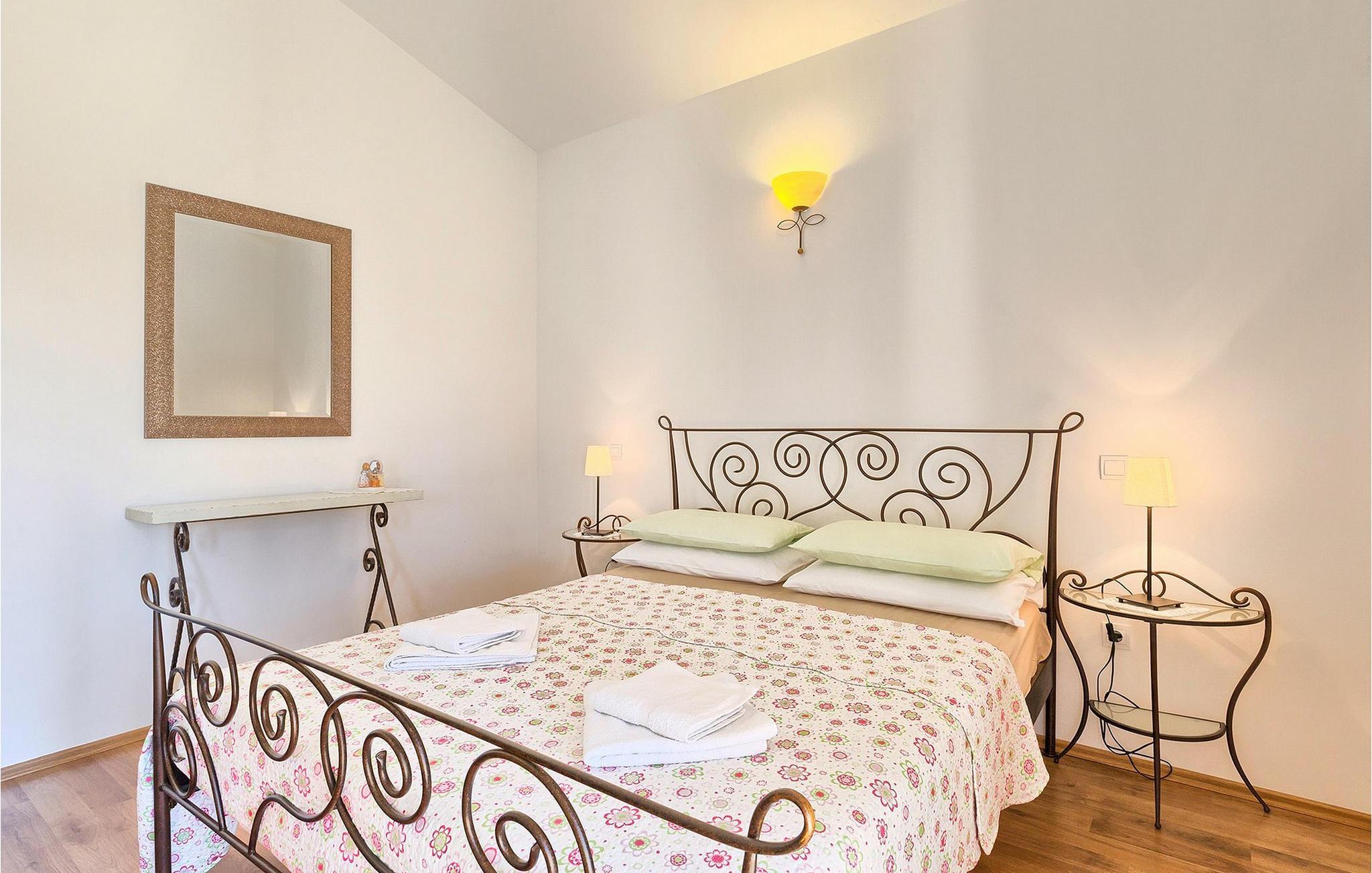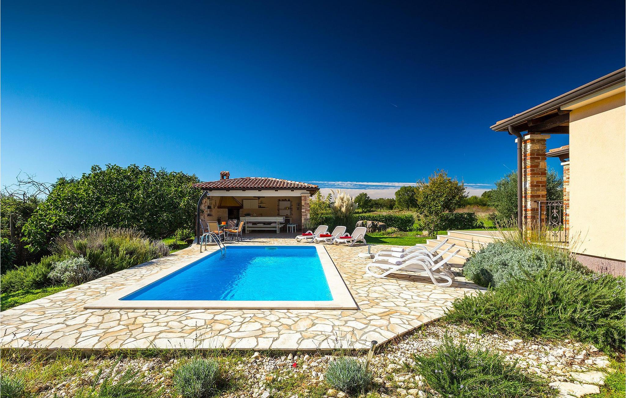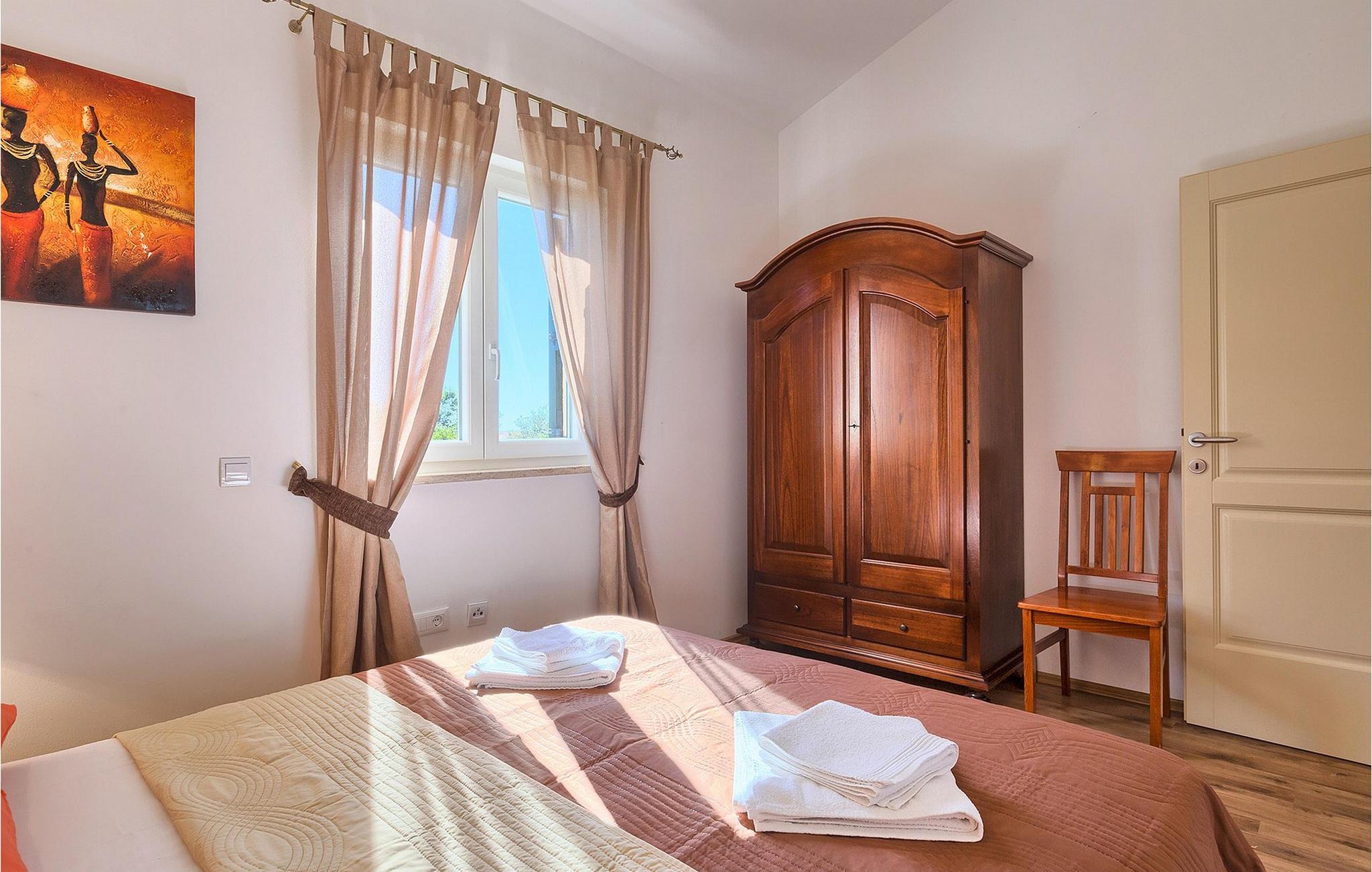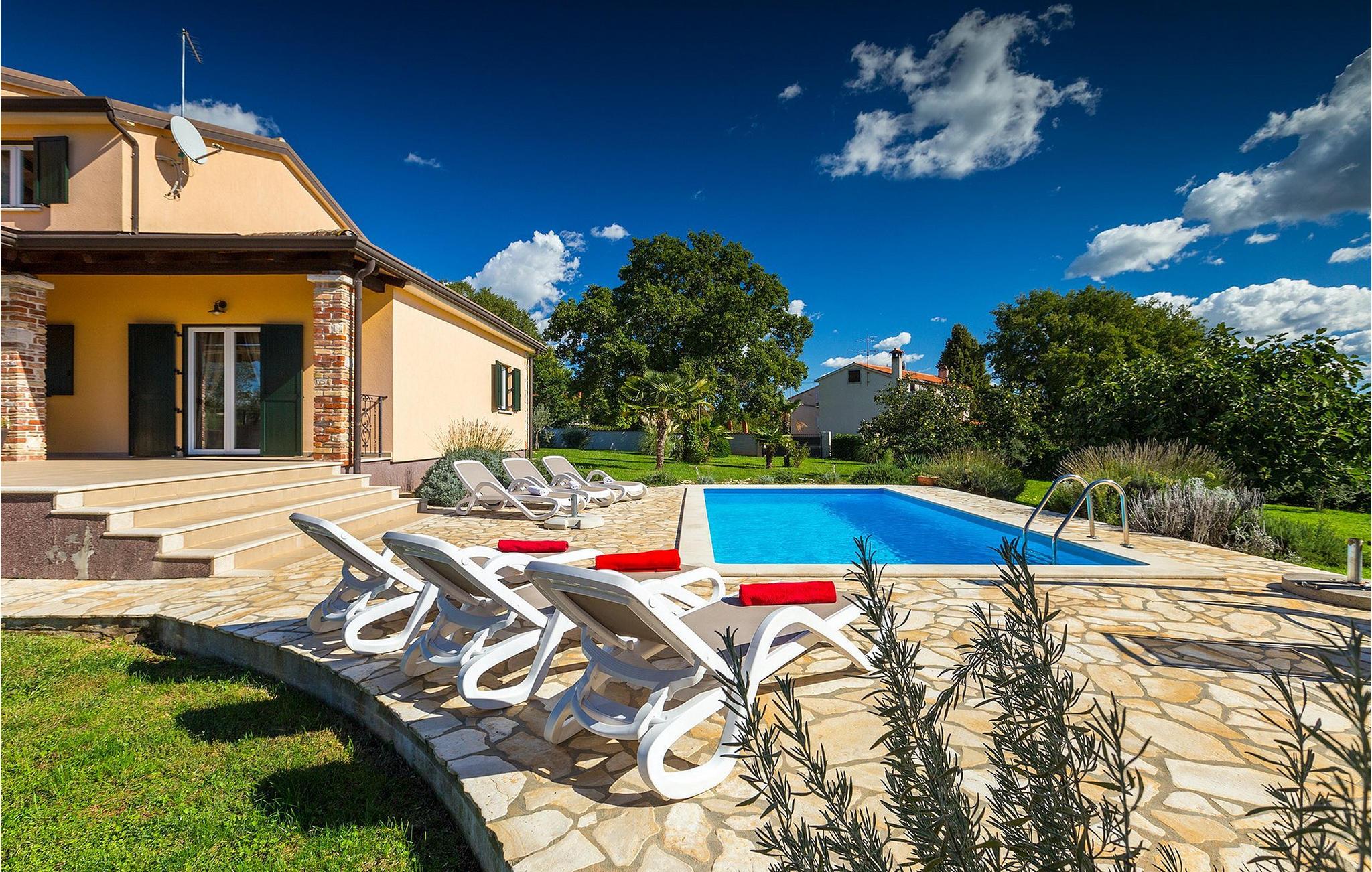 Denne ferielejlighed nær Porec ligger på første sal. Lejligheden byder på en hyggelig åben stue og spisestue med et fuldt udstyret køkken. Fra opholdsstuen har I direkte adgang til den smukke, store, grønne have, hvor I kan slappe af på en liggestol. Foran lejligheden er der en indbydende privat pool, hvor I kan forfriske jer på varme sommerdage. Udendørsområdet byder også på et veludstyret sommerkøkken med en kulgrill og en spiseplads.