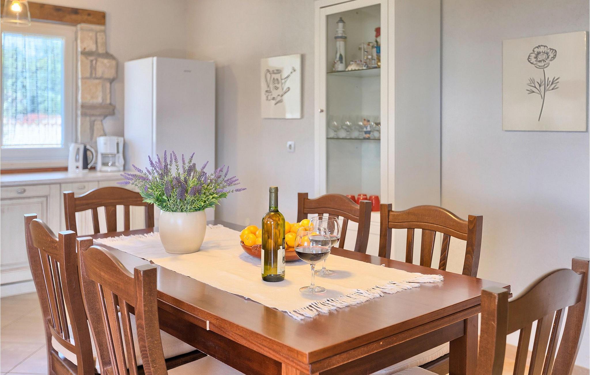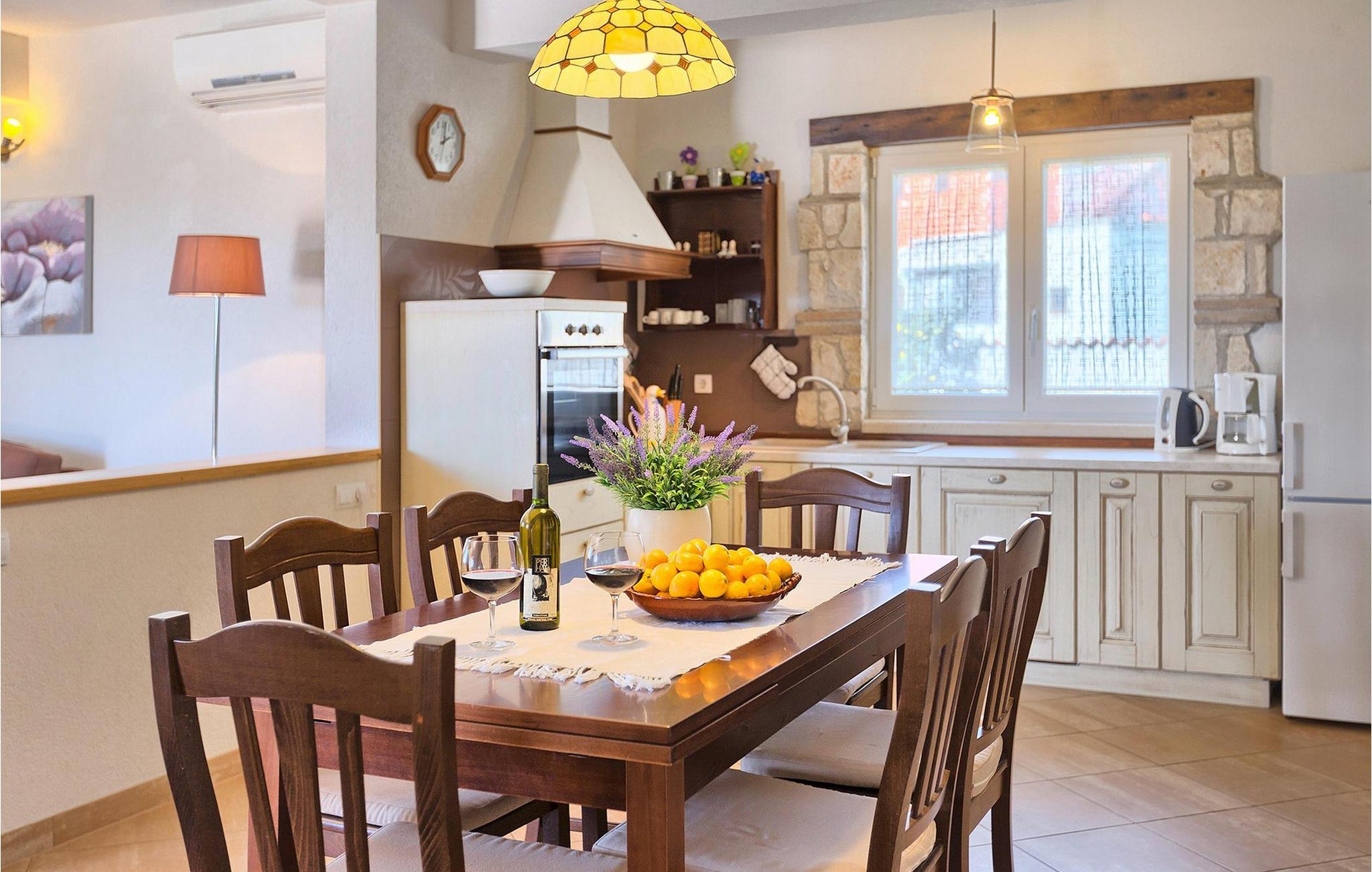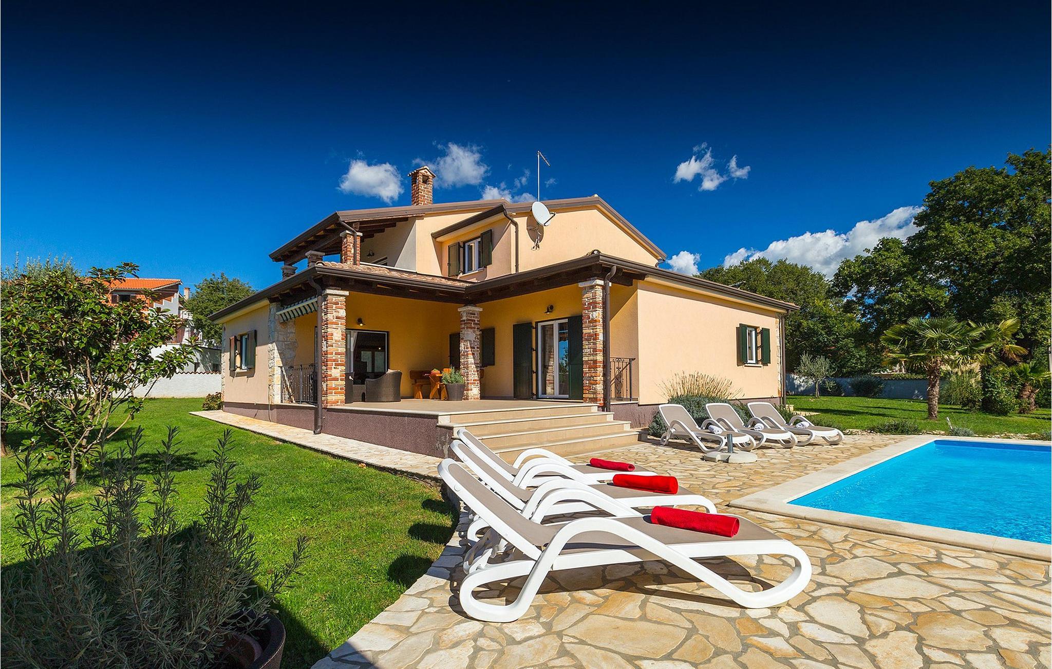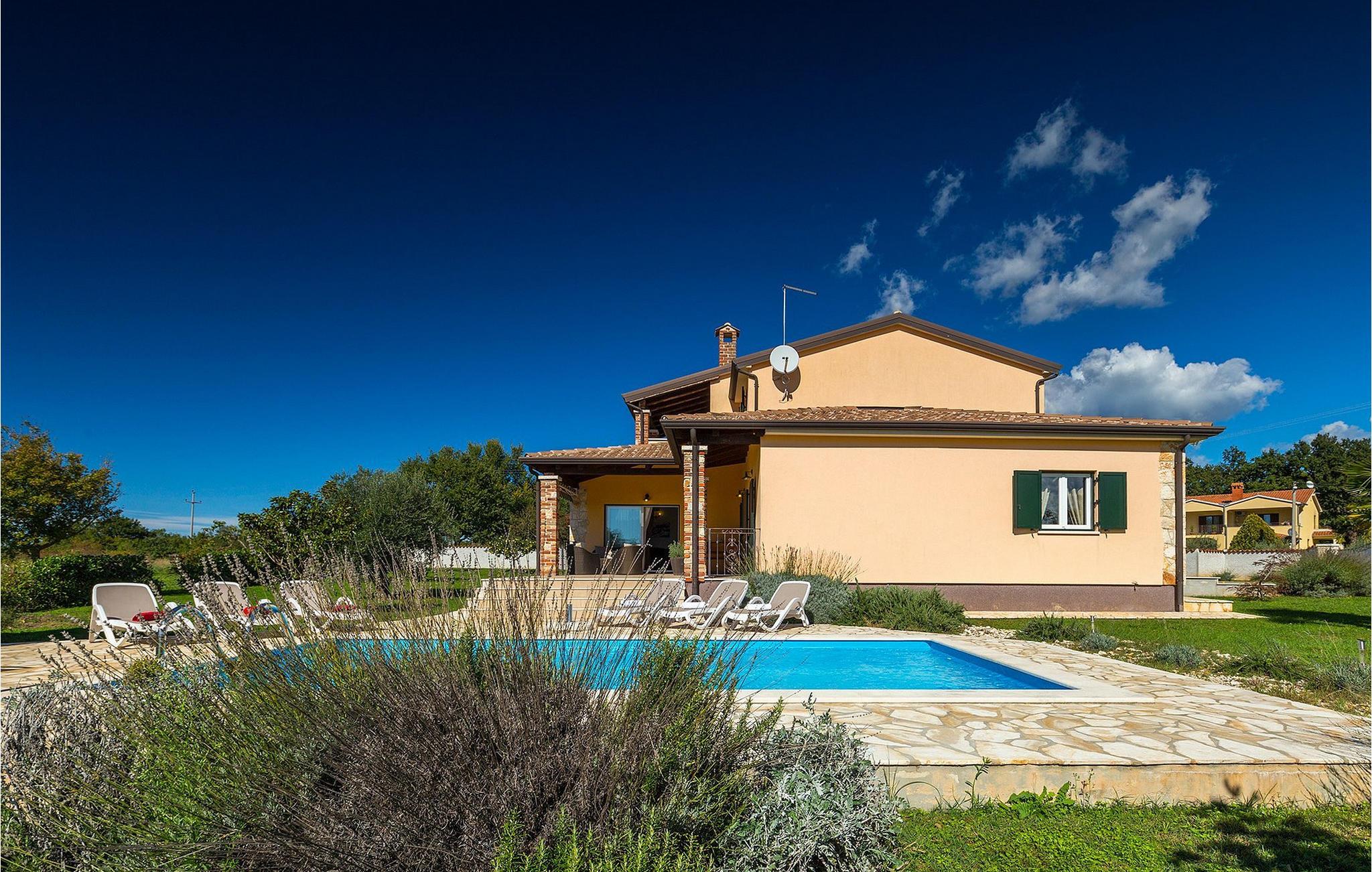 Denne ferielejlighed nær Porec ligger på første sal. Lejligheden byder på en hyggelig åben stue og spisestue med et fuldt udstyret køkken. Fra opholdsstuen har I direkte adgang til den smukke, store, grønne have, hvor I kan slappe af på en liggestol. Foran lejligheden er der en indbydende privat pool, hvor I kan forfriske jer på varme sommerdage. Udendørsområdet byder også på et veludstyret sommerkøkken med en kulgrill og en spiseplads.
