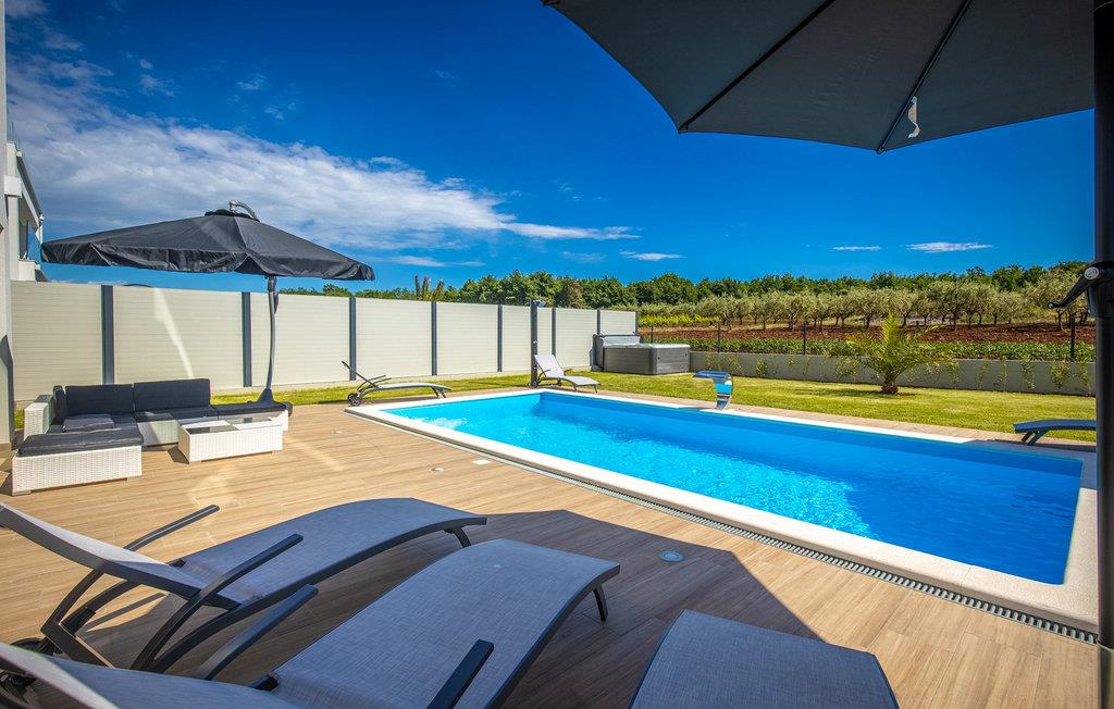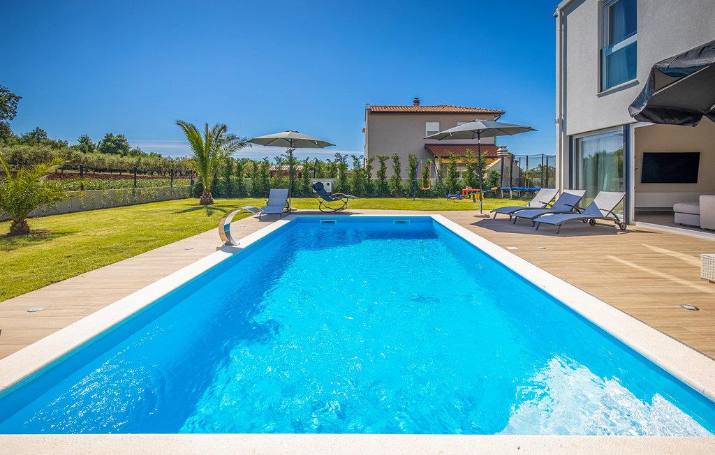 den lille istriske by Mihatovici, kun en kilometer fra Nova Vasa og fem kilometer fra Porec, ligger den smukke Villa Eni. Et ophold i Mihatovici er ideelt for gæster, der ønsker et roligt miljø og stadig ønsker at være tæt nok på havet, strandene og verdenskendte byer i Istrien. Denne moderne villa med et areal på 261,28 m2 kan rumme maksimalt 12 gæster, som vil nyde villaens behagelige interiør, præget af enkelhed og en perfekt kombination af pastelfarver, der løber gennem alle villaens rum. Der er i alt seks soveværelser i villaen, hvoraf de fire har dobbelte boxmadrasser på 210 x 180 og to også har dobbelte boxmadrasser, men med mulighed for at dele dem op i separate senge på 210 x 80. Alle værelser har en smuk udsigt over det eventyrlige istriske landskab, olivenlunde og de fortryllende grønne områder i de istriske bakker. Derudover er der fire komfortable og harmonisk indrettede badeværelser, hvoraf det ene er udstyret med badekar og de tre andre med brusekabiner og separat toilet. I stueetagen af villaen er der et smukt moderne køkken udstyret med alt hvad du kan få brug for under dit ophold og en stue til at slappe af med din familie og venner. Fra den stilfuldt indrettede stue åbner store glasskydedøre interiøret til en skøn gårdhave på 800 m2, som er detaljeret dekoreret med middelhavsplanter. I gården er der også en 26,5 m² stor swimmingpool med mulighed for opvarmning, massagepumper og et vandfald, samt ni liggestole ideelle til solbadning. I din fritid tilbyder denne villa dig en lang række underholdningsmuligheder: jacuzzi, sauna, fitnessudstyr, gynger, legetøj til børn, der er bestemt noget for enhver smag. Villaen har aircondition og har WiFi til ubekymret internetsurfing fra alle værelser. Ud over selve villaen er der fire private parkeringspladser. Gå ikke glip af muligheden for at besøge det nærliggende Porec, en by med kultur og turisme, underholdning og sport, der hvert år besøges af tusindvis af mennesker fra hele verden for sine naturlige og kulturelle attraktioner. Istrien tilbyder dig et rigt turisttilbud - vinveje, olivenolieveje, cykelstier, vandrestier, forlystelsesparker for børn, forskellige festivaler, middelalderbyer, kulturelle begivenheder og monumenter - det er blot nogle af de ting, du kan nyde på din ferie. Kæledyr er tilladt på denne ejendom efter ejerens skøn eller mod et gebyr.