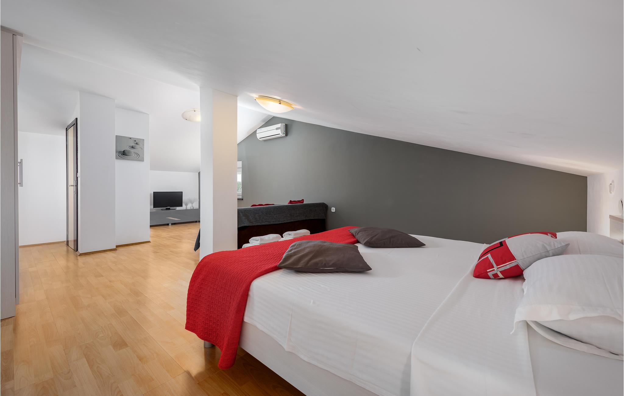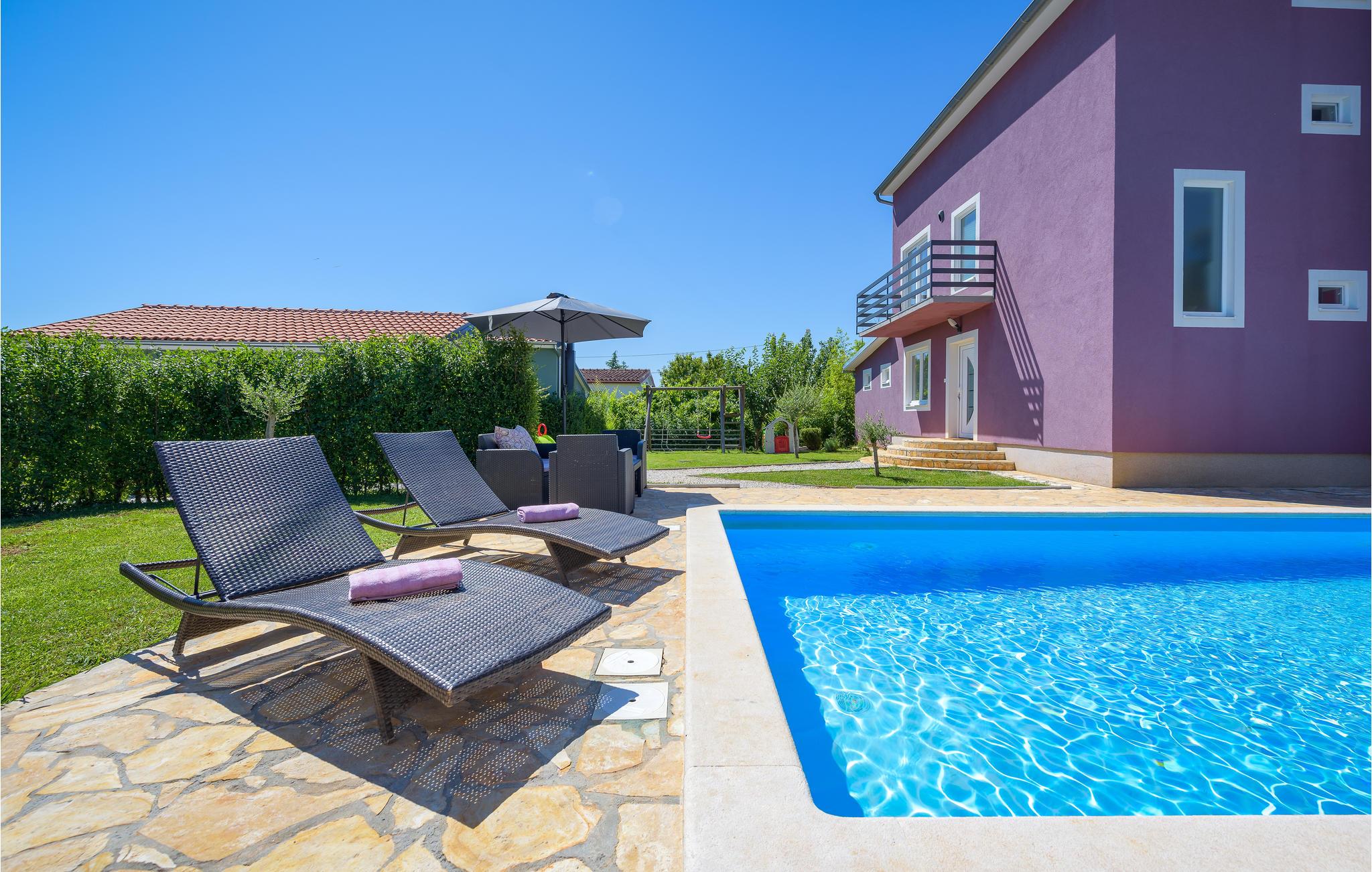 Dette feriehus i Perci fordeler sig på hele tre etager, forbundet med indendørs trapper. Husets moderne indretning, lægger op til en afslappet og komfortabel ferie. På øverste etage ligger et rummeligt soveværelse, med eget køkken og en lille stue, samt terrasse. På den indhegnede grund kan I forfriske jer i poolen på de varme sommerdage. Den overdækkede terrasse indbyder til hyggelige aftner, mens børnene tumler sig og leger i haven. Besøg den historisk interessante by Porec og forkæl jer selv på en af de dejlige restauranter hvor I kan smage regionens traditionelle retter. Er I naturelskere så besøg nationalparken Brijuni og Limski kanalen, her vil I se betagende naturskønhed, husk kameraet.