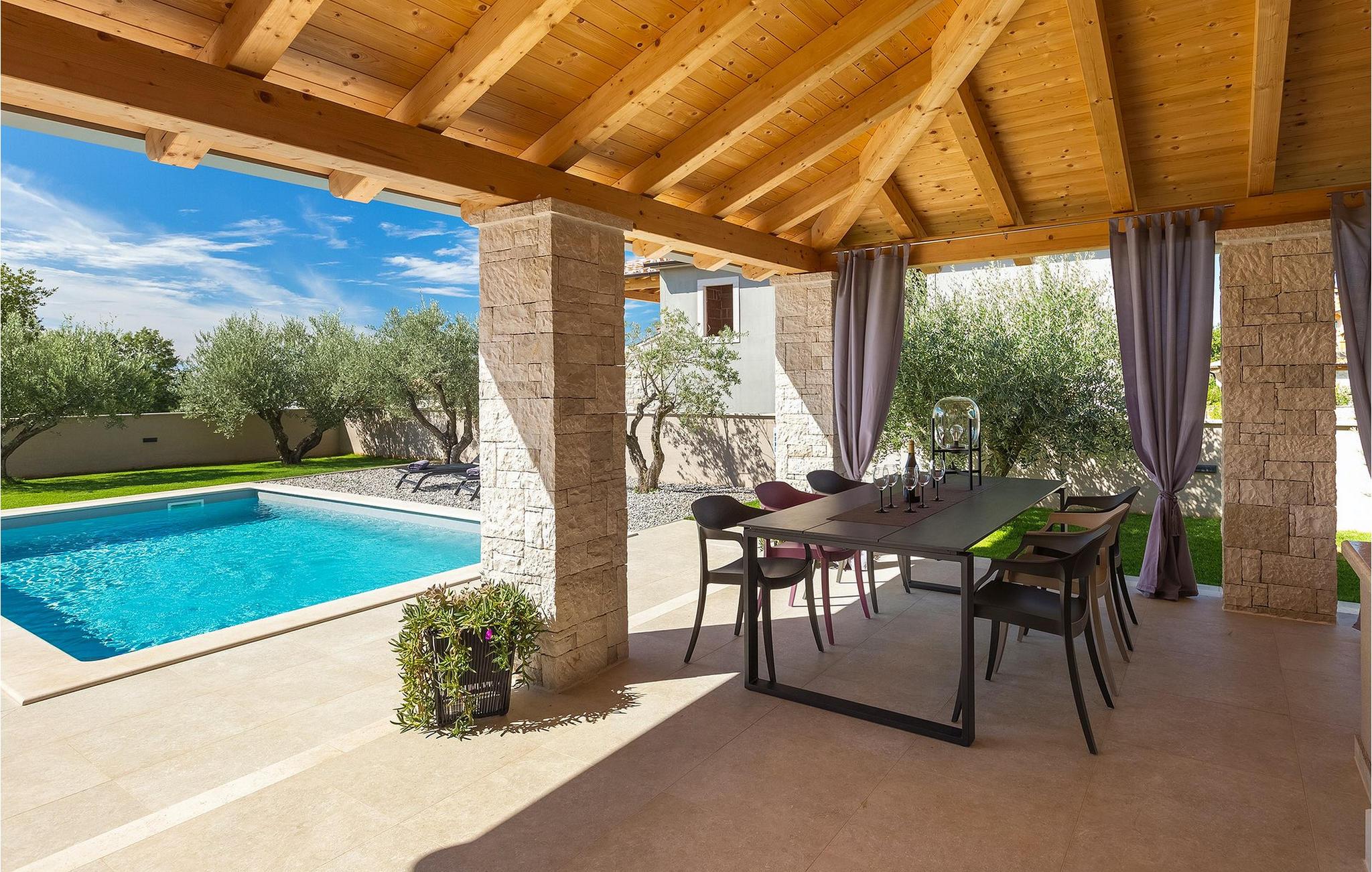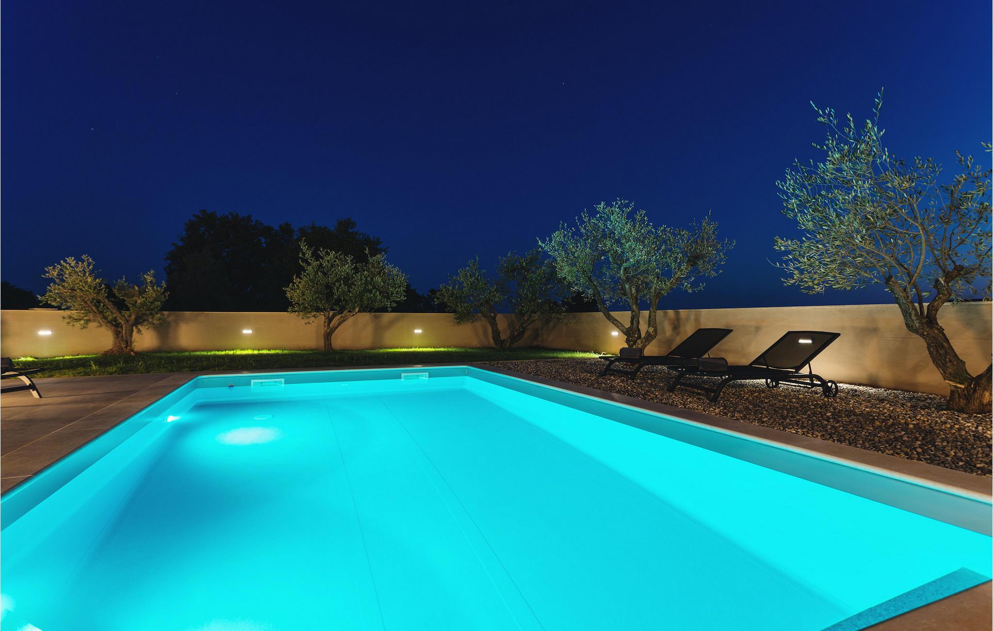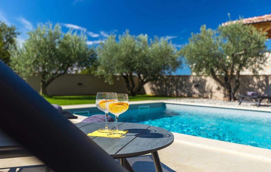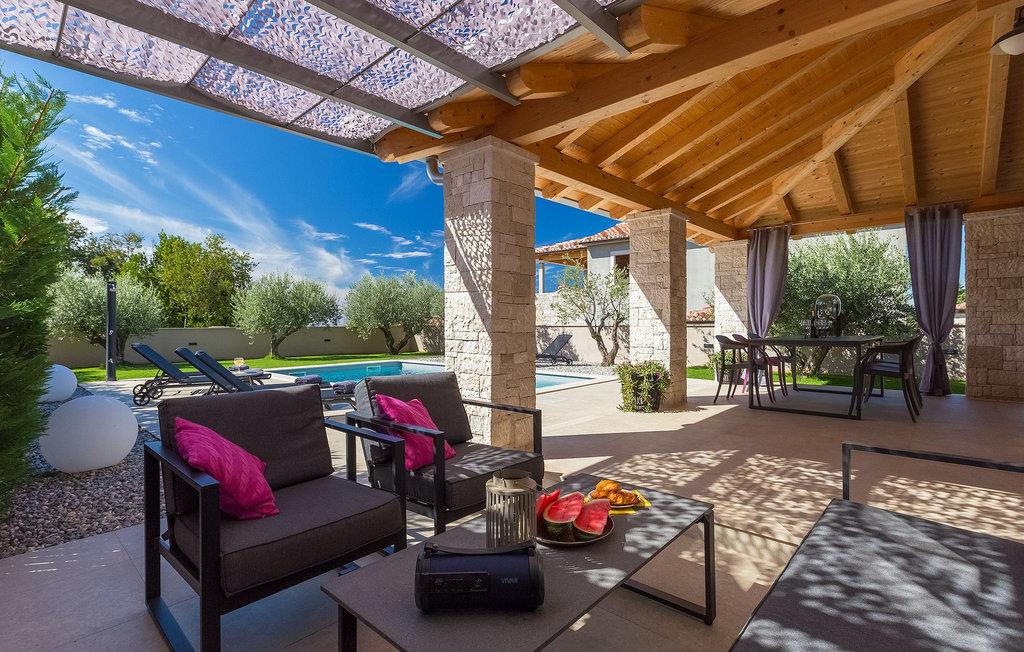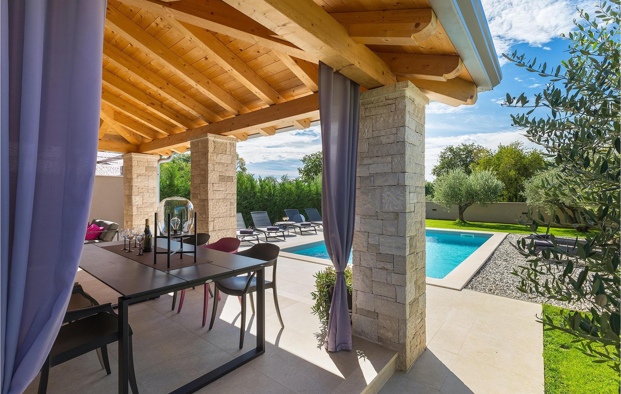 Fra stuen kan du gå udenfor til haven, hvor du finder pejs & grill, en bord med loungemøbler, en privat pool og udsigt til gamle istriske oliventræer - en gylden gave fra naturen.