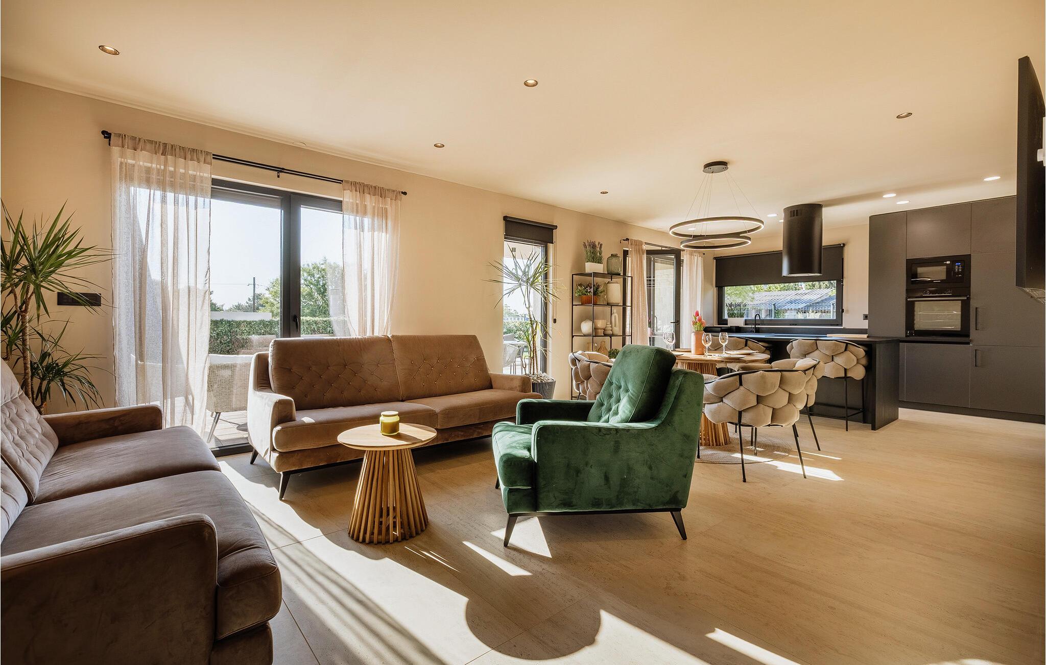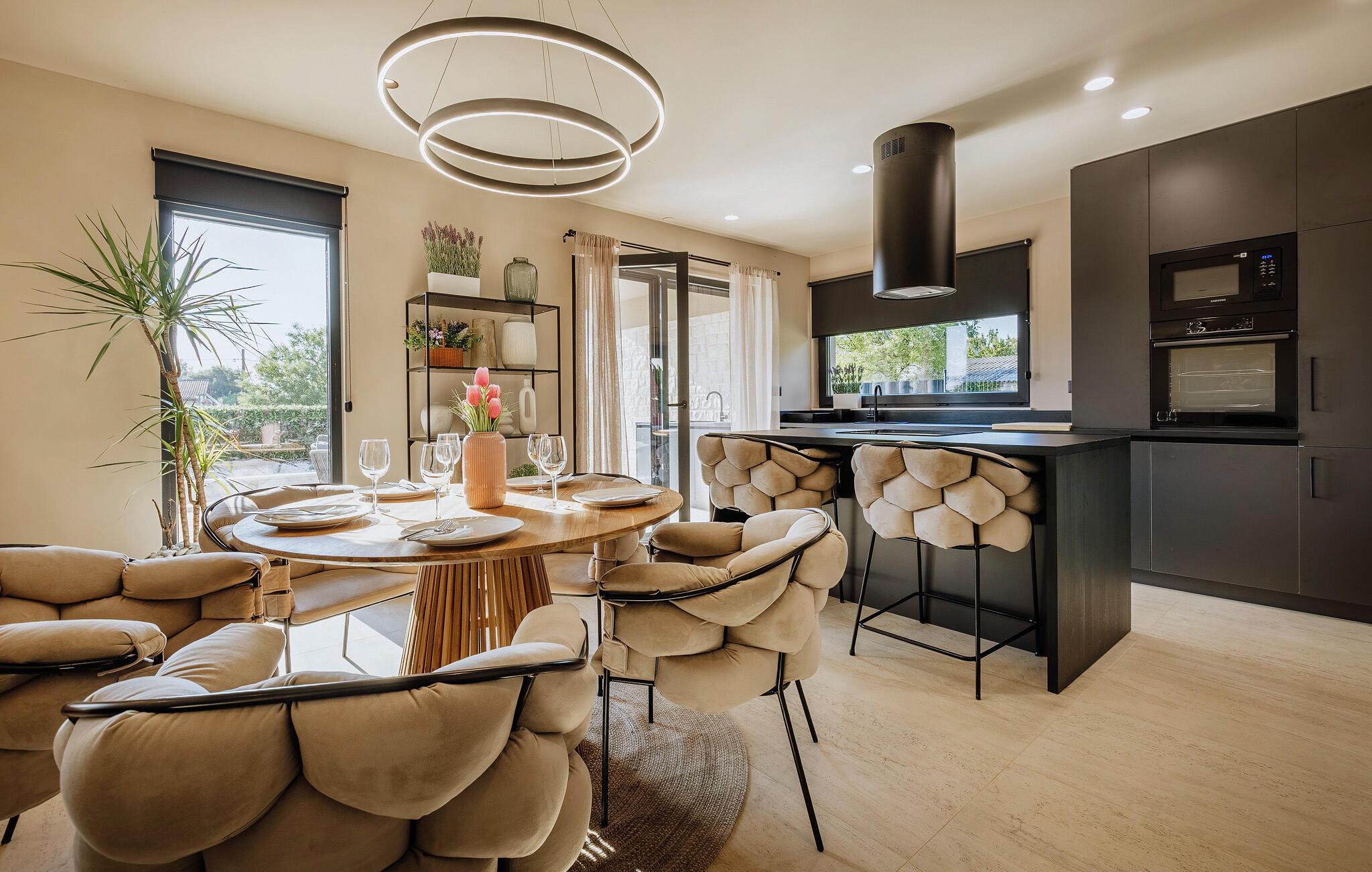 Dette smukke hus kombinerer komfort, stil og hygge til perfektion. Møbler i varme okkertoner, trægulve og futuristiske lamper skaber en helt særlig atmosfære. Slap af med en drink i sofaen, tryl lækre retter frem i det moderne køkken, og sæt jer til rette ved det runde spisebord.