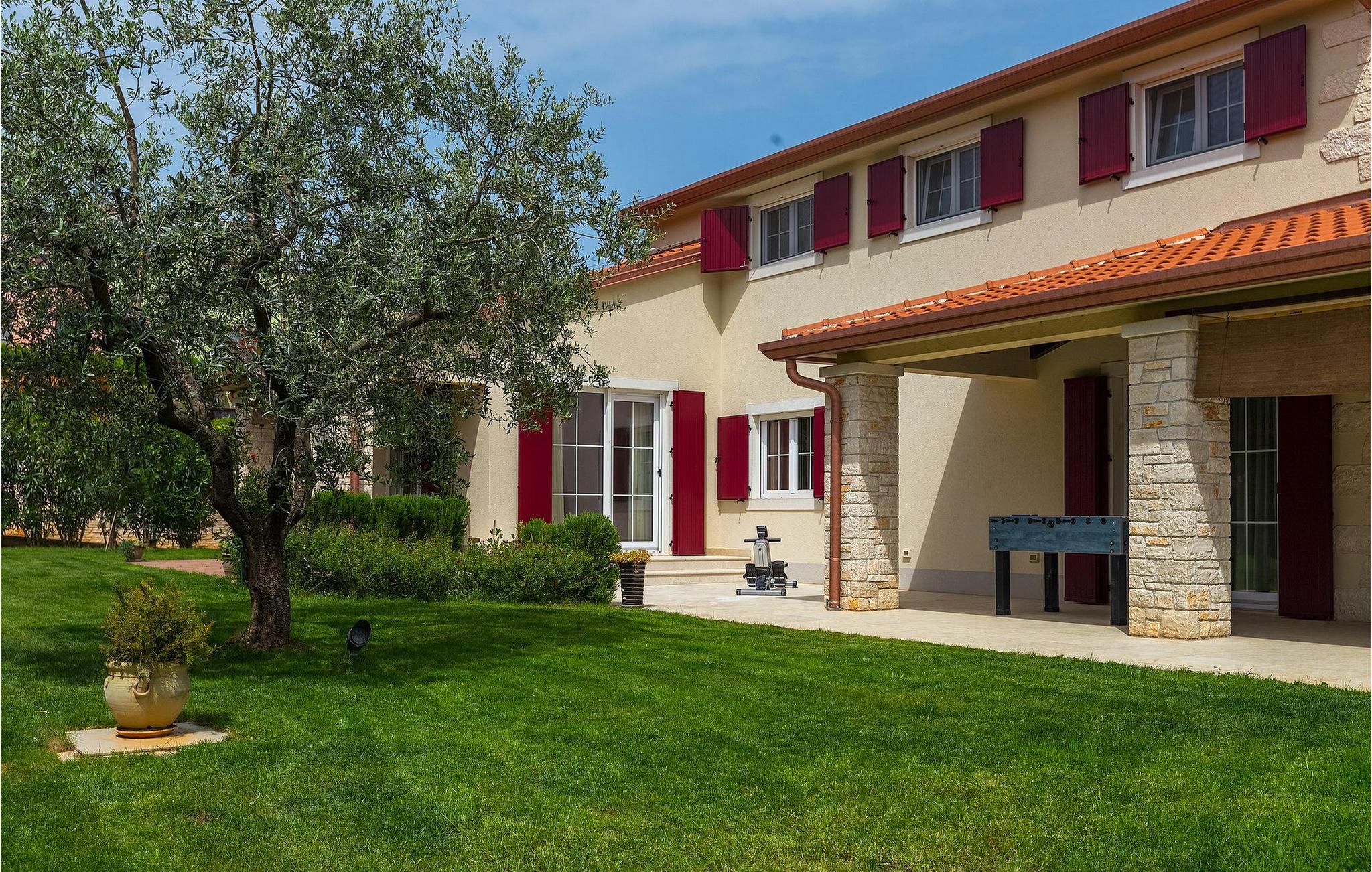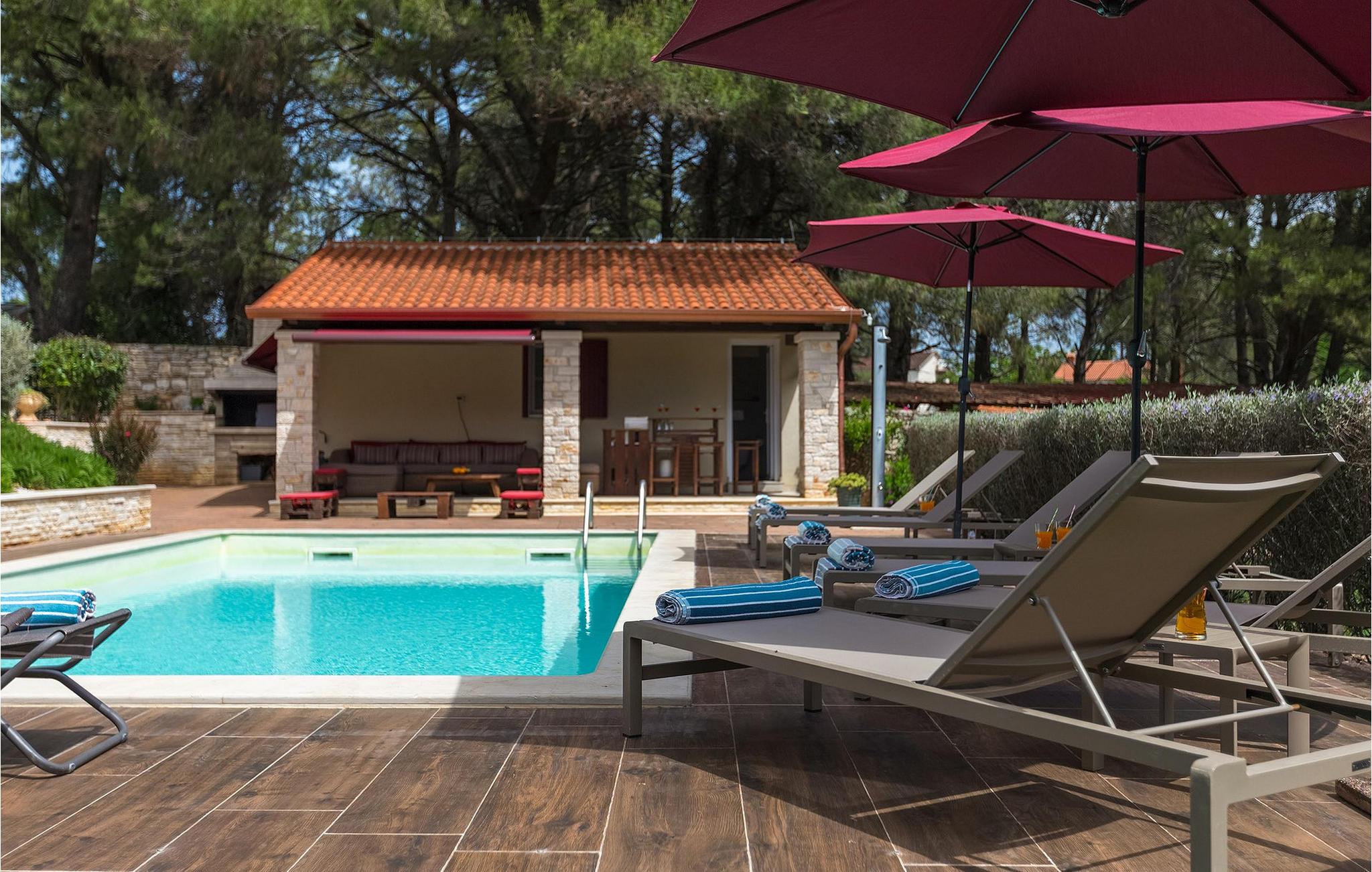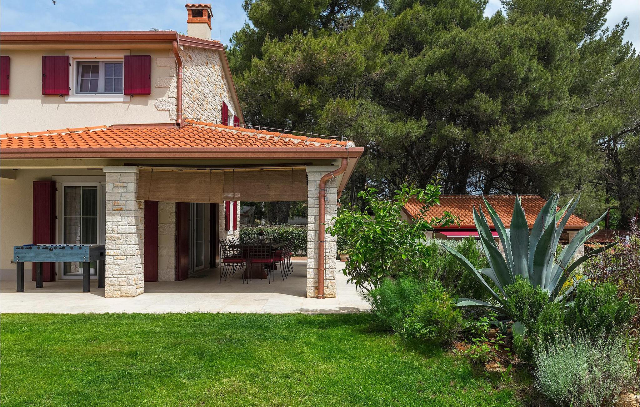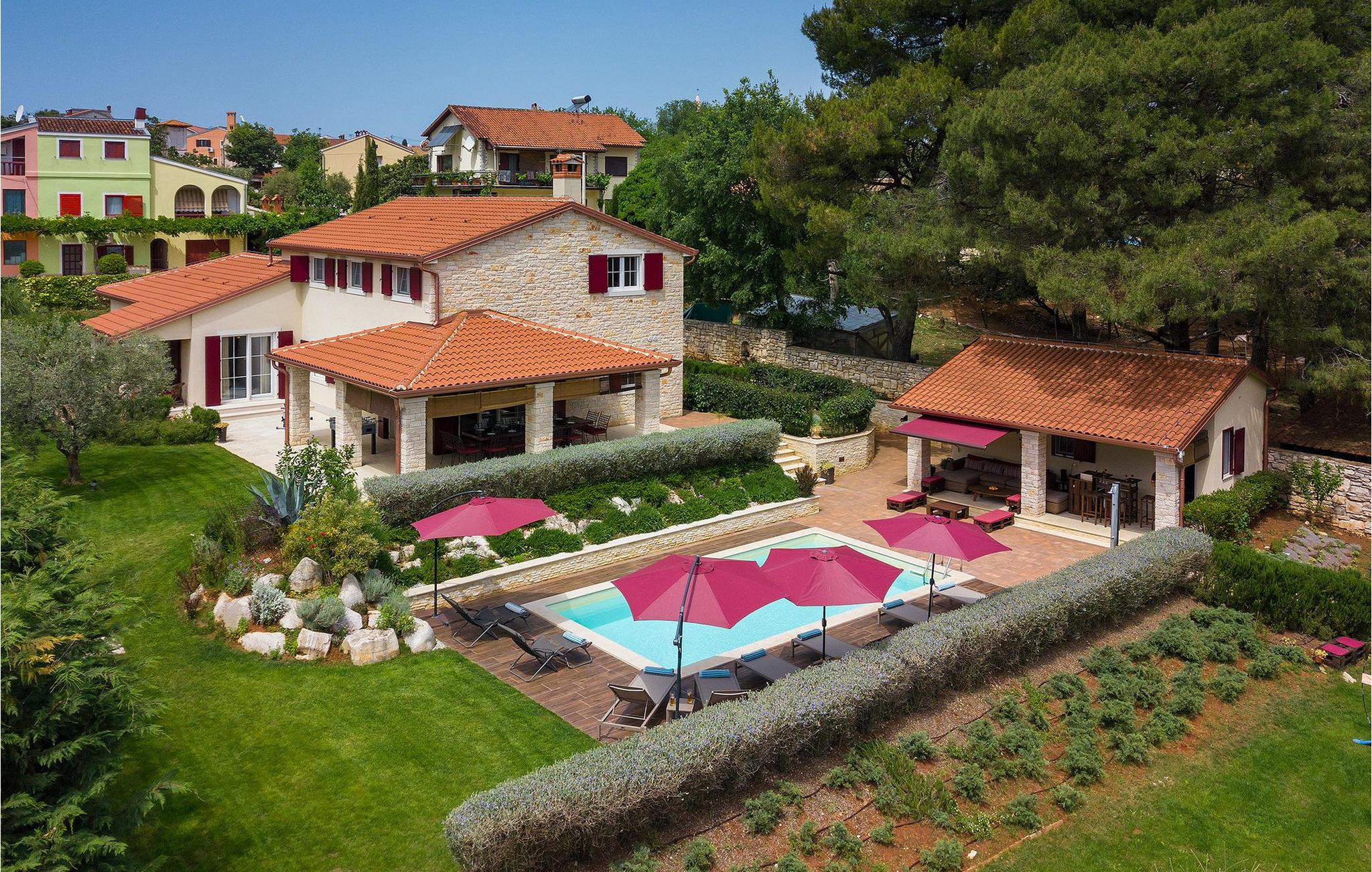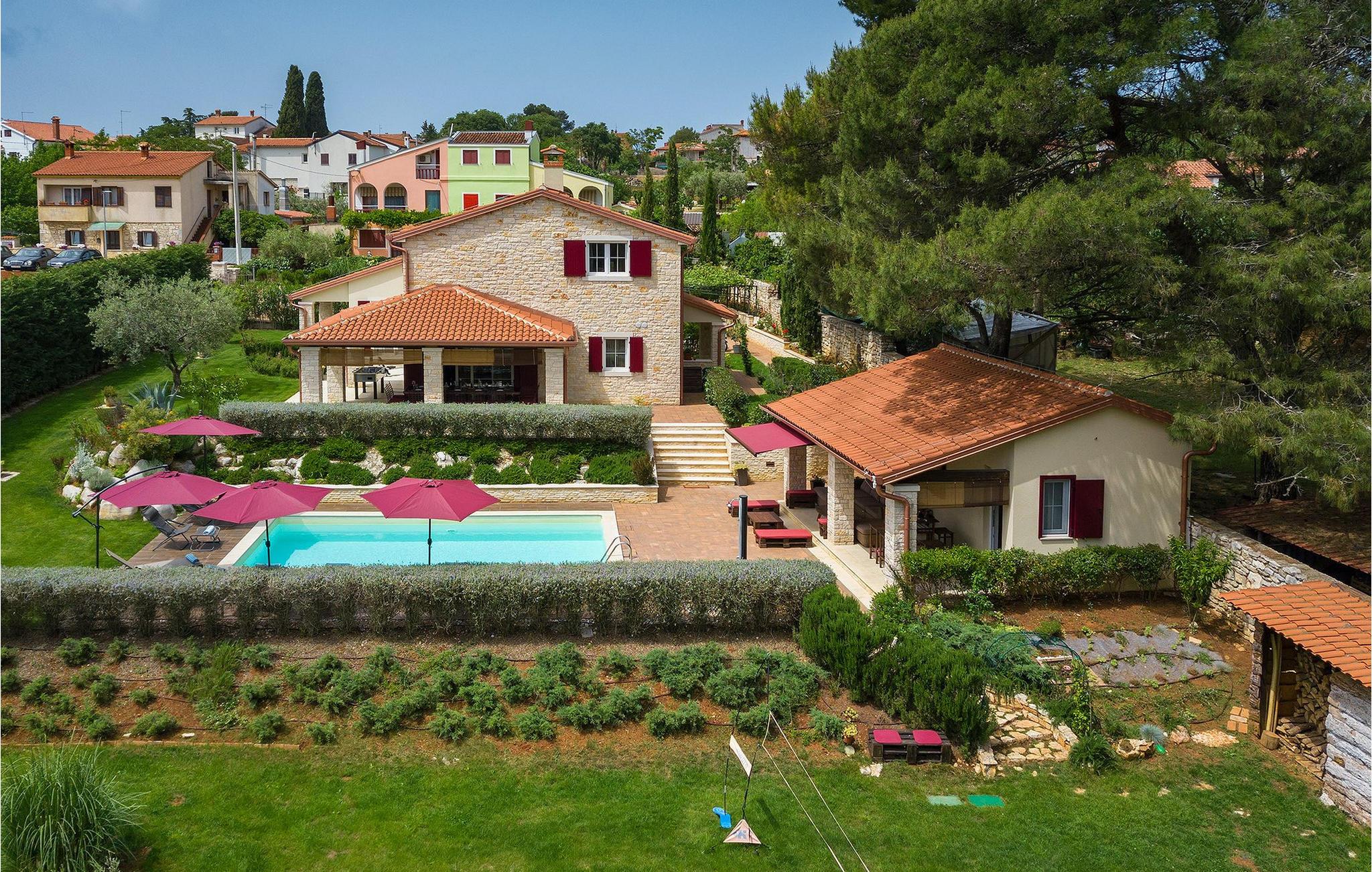 Die Villa Eda ist eine wunderschöne, charmante Familienvilla mit äußerst einladendem Außen- und Innenbereich. Die Villa ist von einem 1950 m2 großen Garten umgeben mit einem privaten Pool im Zentrum. Die Villa ist ideal für Gruppen von zwei oder drei Familien, da sie bis zu 14 Personen beherbergen kann. Auf dem Anwesen befinden sich zwei Häuser, wobei das kleinere, das neben dem Pool ist, ideal für diejenigen Gäste ist, die ihre Privatsphäre besonders schätzten. Insgesamt verfügt die Villa über 4 Schlafzimmer und 4 Badezimmer. Neben dem Pool befindet sich auch die Sommerküche, in der Sie grillen oder einfache Mahlzeiten zubereiten können. Obwohl Ihnen alles, was man brauchen könnte, in der Villa zur Verfügung steht, sind Restaurants, Strände und Bars nur 2 km von der Villa entfernt.Dieses wunderschöne Ferienhaus befindet sich in der Ortschaft Tar-Vabriga bei Porec. Die Villa ist nur 2 km vom Strand entfernt. Tar-Vabriga bietet Kultur- und Freizeitveranstaltungen (z.B. Eselrennen). Während Ihres Aufenthaltes besuchen Sie die Euphrasius-Basilika (Unesco Kulturerbe) in der Kultur- und Altstadt Porec. Višnjan (11 km von Porec entfernt) ist eine kleine Stadt auf einem Hügel, umgeben von Wäldern, bekannt für das international berühmte astronomische Observatorium.