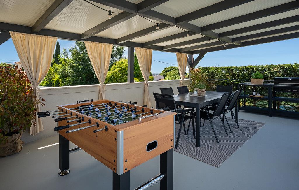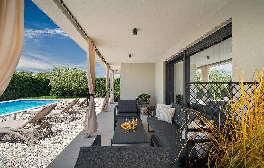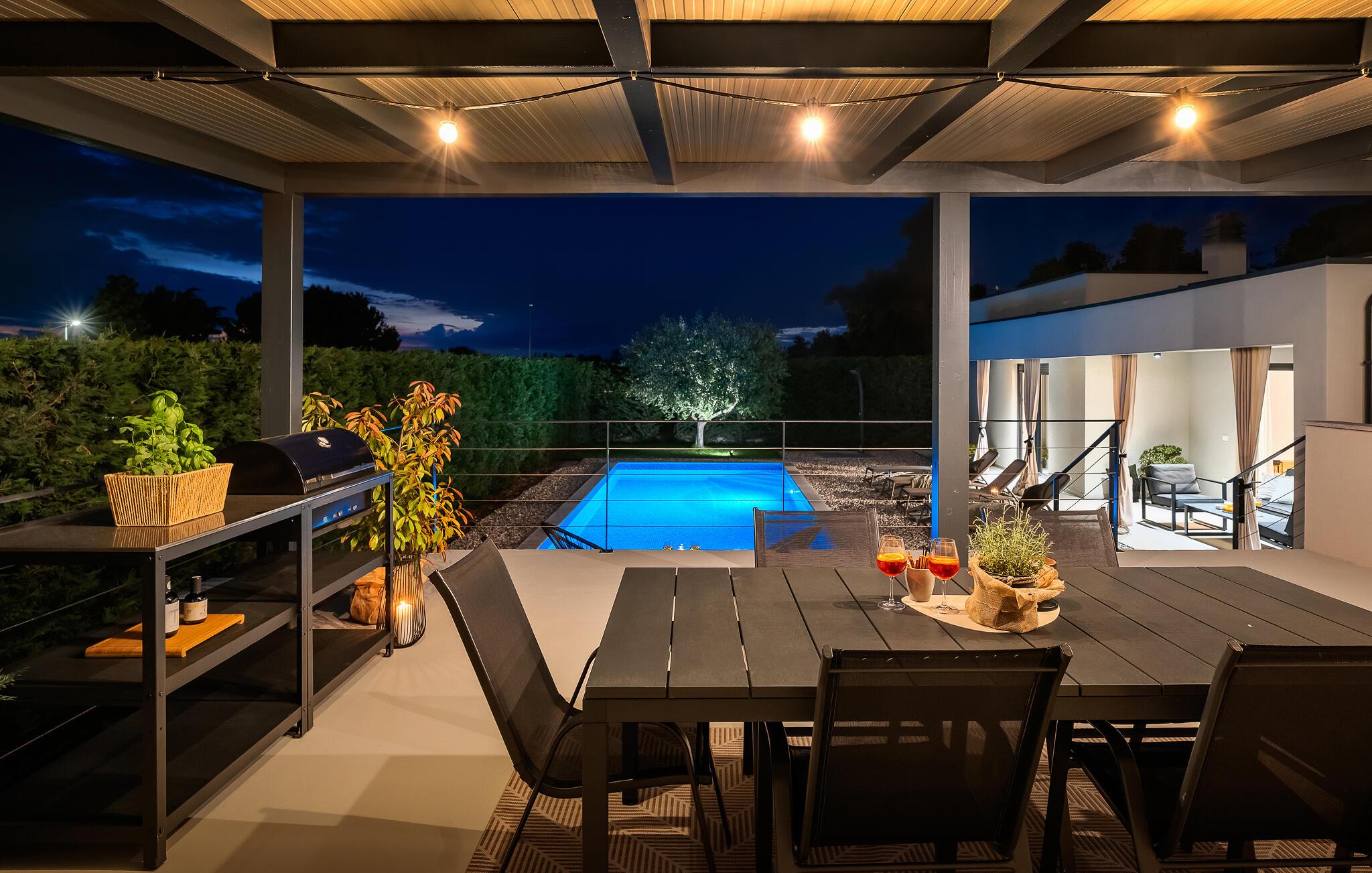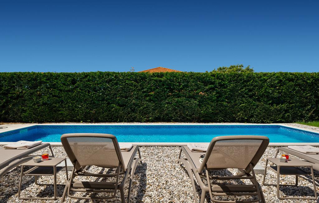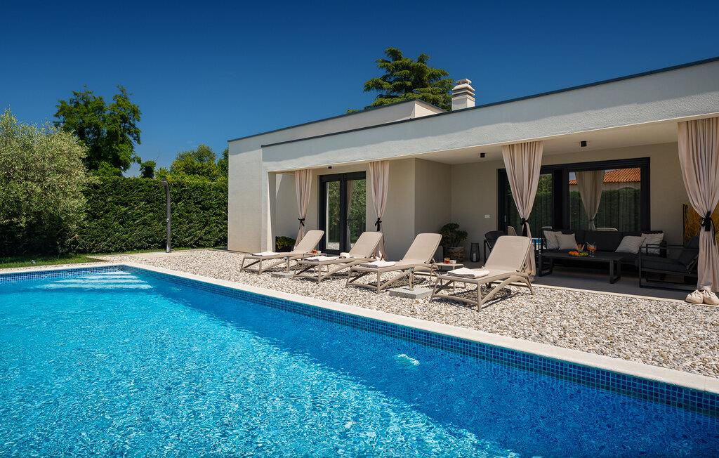 Luksusvilla Ella ligger på Istriens vestkyst, i den lille by Vabriga, hvis skønhed ikke vil efterlade nogen ligeglade. Selve byen Vabriga, såvel som de omkringliggende steder, tilbyder mangfoldigt og interessant indhold, der vil glæde yngre og ældre generationer. Villa Ella er det rigtige valg for alle, der ønsker at tilbringe en luksuriøs ferie i fred og ro og nyde det som kongelige. Hvis du har lyst til en ferie som denne, for at flygte fra den hektiske hverdag, så er denne villa lige noget for dig! Villa Ella er bygget i 2021 i moderne og elegant stil og har 129 m2 boligareal, mens grundens samlede areal er 798 m2. Det kan højst rumme 5, ideelt set 4 personer. Det er 2 km væk fra det nærmeste hav, og den nærmeste stenstrand ligger 2,1 km væk og hedder Santa Marina. I nærheden af villaen er der restauranter, caféer og taverner, hvor du kan smage lækre specialiteter og et par dråber af de bedste vine fra Istrien. Der er to soveværelser med eget badeværelse med bruser, et med dobbeltseng (180 x 200) og det andet med to enkeltsenge (90 x 200). Som ekstra seng er der en klapseng (80x200) med memory foam madras. I det moderne udstyret køkken og spisestuen med et bord til 6 kan du tilberede lækre måltider til hele familien. I stuen ved siden af spisestuen kan du slappe af på hjørnesofaen, der er også tv og sofabord. Fra stuen er der direkte adgang til den udendørs terrasse, som vil tage pusten fra dig. En 33 m² pool giver behagelig forfriskning om dagen og om natten, ved siden af kan du solbade på 5 liggestole, der er også en hjørnesofa, to sæder og et bord, hvor du kan drikke din morgenkaffe. Der er også en anden overdækket terrasse ved siden af poolen med et spisebord til 6 personer og en kulgrill. Yderligere faciliteter inkluderer en vaskemaskine, et strygejern og om nødvendigt kan du bruge en barneseng og en foderautomat. Villa Ella er helt indhegnet, har en smukt anlagt have og masser af steder for børn at lege og slappe af. Der er 2 private parkeringspladser i gården. I Vabriga er der flere smukke strande, hvor du kan nyde alle fordelene ved det krystalklare Adriaterhav. De små vil helt sikkert blive forbløffet over det mange interessante indhold i Lanterna Aquapark. Interessante faciliteter og lokale aktiviteter omfatter vinture, olivenolieture eller trøffeljagt. Istrien er også kendt for sit exceptionelle gastronomiske tilbud, hvorfra vi skal fremhæve verdensberømte topvine som Malvasia, Teran eller Merlot. Vin i Istrien er kendt for sin topkvalitet på grund af sin særligt gunstige geografiske beliggenhed og jordkvalitet, kendt som "Quattro Terre". Denne egenskab har muliggjort den exceptionelle kvalitet, ikke kun af dyrkningen af vinstokken, men også af den ekstra jomfruolivenolie, der er værdsat som nummer et i Europa. Trøfler er en anden højkvalitets og dyr delikatesse, der vil glæde alle ægte gourmeter med sin specifikke og syrlige smag. Velkommen til et rigtigt lille paradis på jorden, velkommen til Villa Ella!