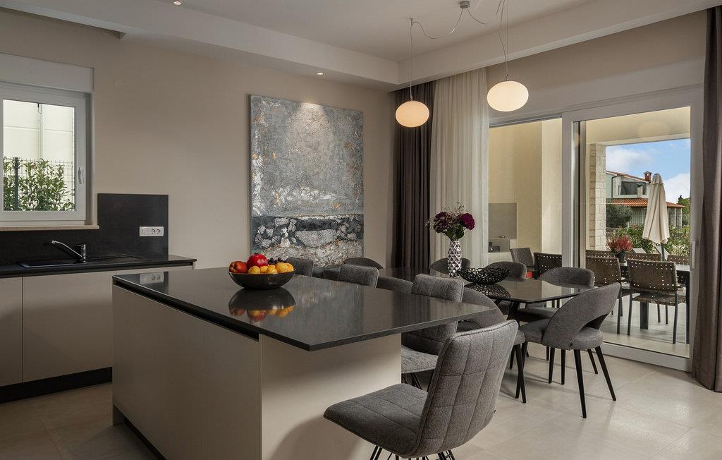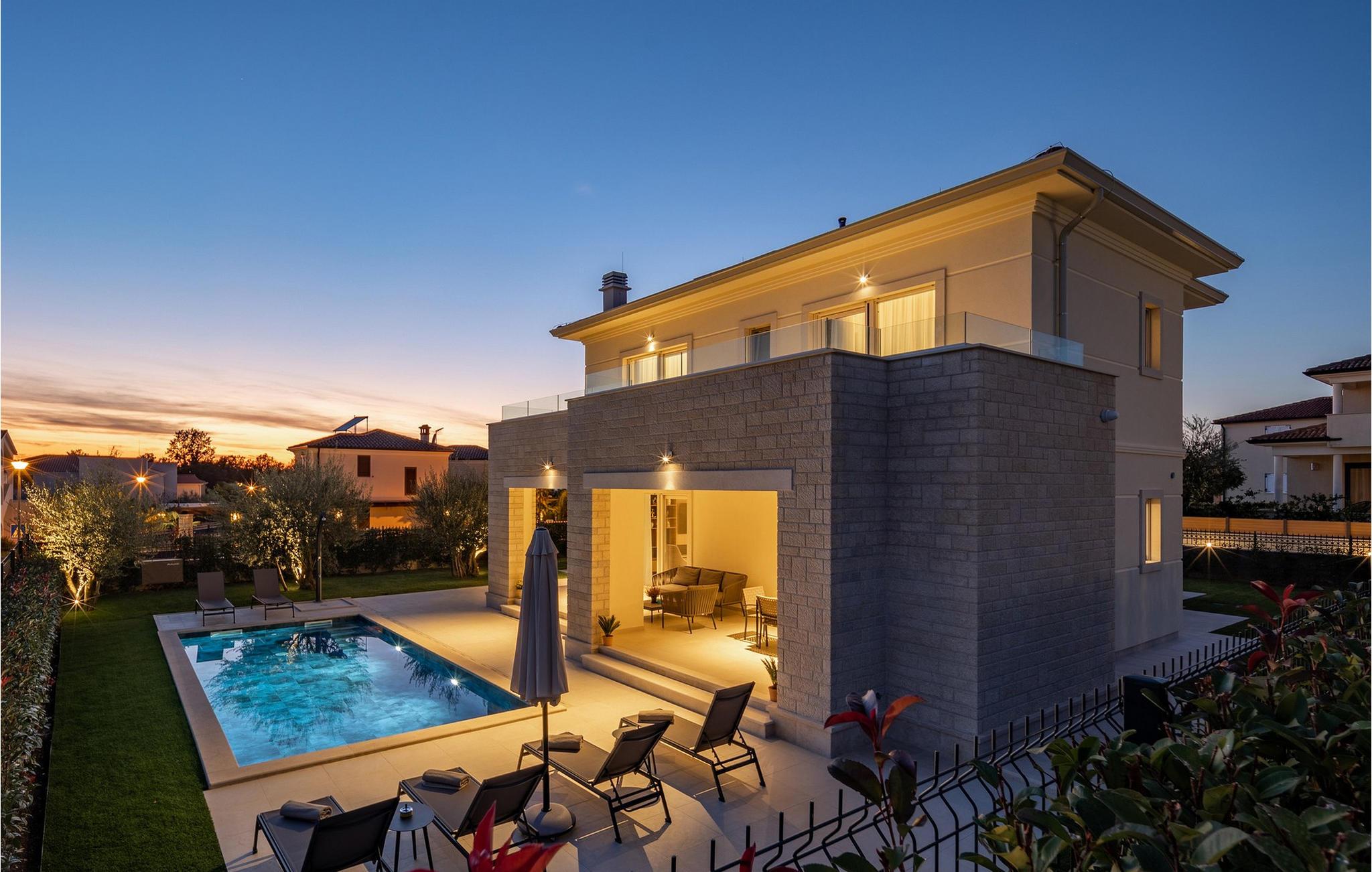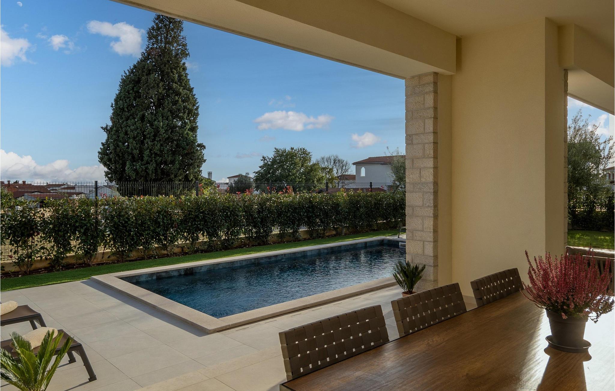 Villa Santina ligger i det eventyrlige Istrien i Vabriga. Denne lille landsby ligger på Istriens vestkyst og kun 7 km fra byen Porec. Placeringen af Villa Santina er ideel til en rolig og afslappende ferie med familie eller venner, samtidig med at den er tæt nok på alle de aktiviteter, du kan ønske dig. Hvis du ønsker at forkæle dig selv og dine kære med en luksuriøs ferie, så er denne villa det rigtige valg for dig! Villa Santina er bygget i rustik arkitektonisk stil og tilbyder sine gæster 208 m2 boligareal, mens det samlede areal af ejendommen er 725 m2. Det er 1,5 km væk fra den nærmeste strand og det klare hav, hvor du kan nyde solen og udforske havets dybder. Villaen er fuldt klimatiseret og sover maksimalt 8, ideelt set 6 personer. Gæsterne er indkvarteret i 3 komfortable og smukt indrettede dobbeltværelser, og du vil blive glad for at vide, at hvert af de nævnte værelser har eget badeværelse med bruser. To soveværelser er placeret på øverste etage af villaen og har adgang til en privat terrasse med havudsigt, mens det tredje soveværelse er i stueetagen. I stueetagen er der desuden en rummelig stue med to sofaer, en lænestol, et sofabord og et tv. Lige ved siden af stuen ligger spisestuen med spisebord til 8 personer, samt et moderne og fuldt udstyret køkken med bar, bag hvilken der er yderligere 4 barstole. Fra spisestue og stue er der direkte udgang til den udendørs terrasse, hvor du på varme sommerdage kan slappe af i den opvarmede pool på 28 m2 og en dybde på 1,6 meter. Du kan solbade på 8 liggestole og læse din yndlingsbog eller bare hvile krop og sjæl i fred. Der er også et overdækket spisebord på den udendørs terrasse, ved siden af er der en udendørs kul- eller brændegrill, perfekt til at tilberede lækre måltider for hele familien. Ved siden af poolen er der også et opholdsområde, ideelt til at nippe til kaffe om morgenen eller socialt samvær om aftenen. Andre funktioner i Villa Santina omfatter 1 separat toilet, vaskemaskine, tørretumbler og strygejern. Som en ekstra seng til to personer er der også en sovesofa i stuen, samt et foderbord og en babyseng. Massage er muligt efter forudgående aftale. Villaen er helt indhegnet og byder på 2 private parkeringspladser i gården. Der er også masser af grønne områder, hvor børn kan lege ubekymret. Hvis du beslutter dig for at besøge Istrien og Vabriga, kan vi garantere, at du ikke bliver skuffet. Hvert år bliver Istrien besøgt af talrige indenlandske og udenlandske turister, der er forbløffet over skønheden, den uberørte natur og eventyrlige steder i nærheden af Vabriga. Naturelskere kan udforske omgivelserne, svømme i små og skjulte bugter og besøge Mirna-flodens dal, hvor der er skove rige på trøfler. Hvis du er mere interesseret i kulturarv, kan du nå byen Porec på kun 20 minutter i bil, og der er andre nærliggende byer som Novigrad, Rovinj eller Pula, hvor du vil blive overrasket over det romerske amfiteater. Det gastronomiske tilbud er fremragende og omfatter adskillige restauranter, taverner og landlige husholdninger, hvor du kan smage istriske specialiteter og lokale vine af topkvalitet. Overgiv dig til Istriens charme og nyd en vidunderlig årlig ferie i Villa Santina! Kæledyr er tilladt på denne ejendom efter ejerens skøn eller mod et gebyr.