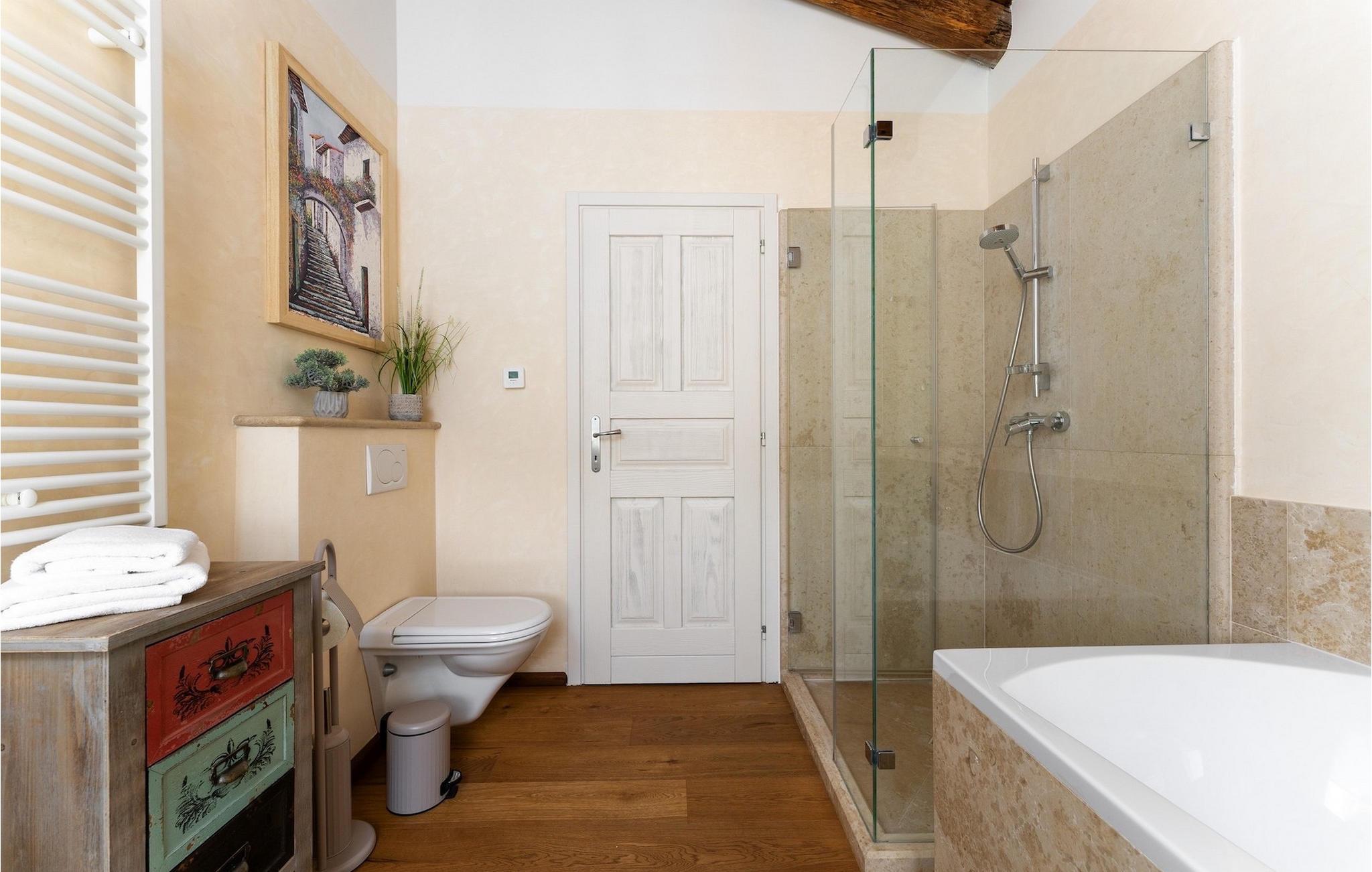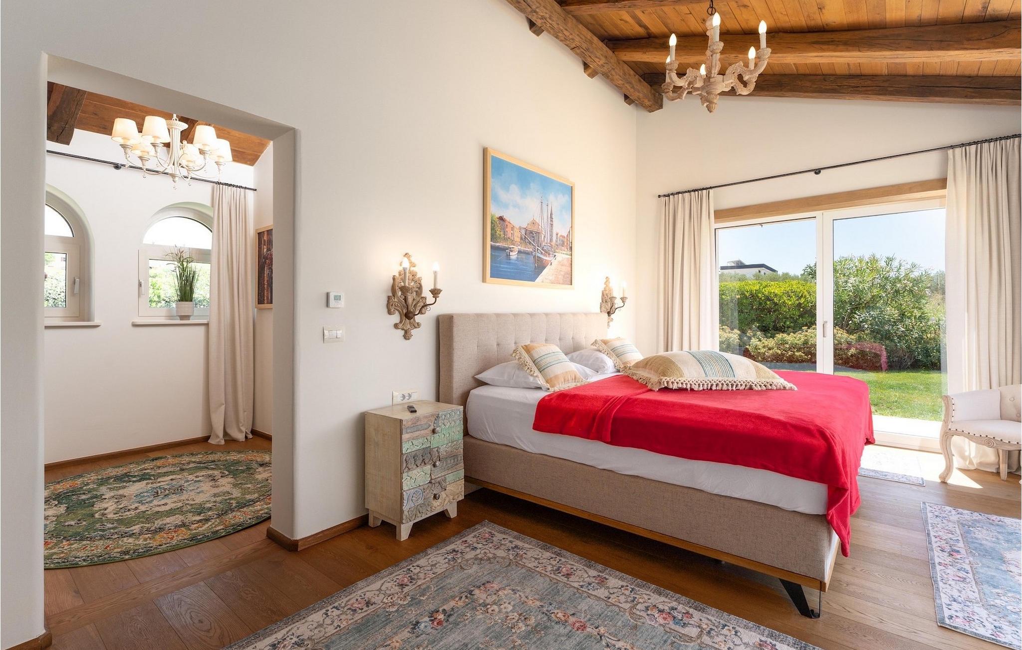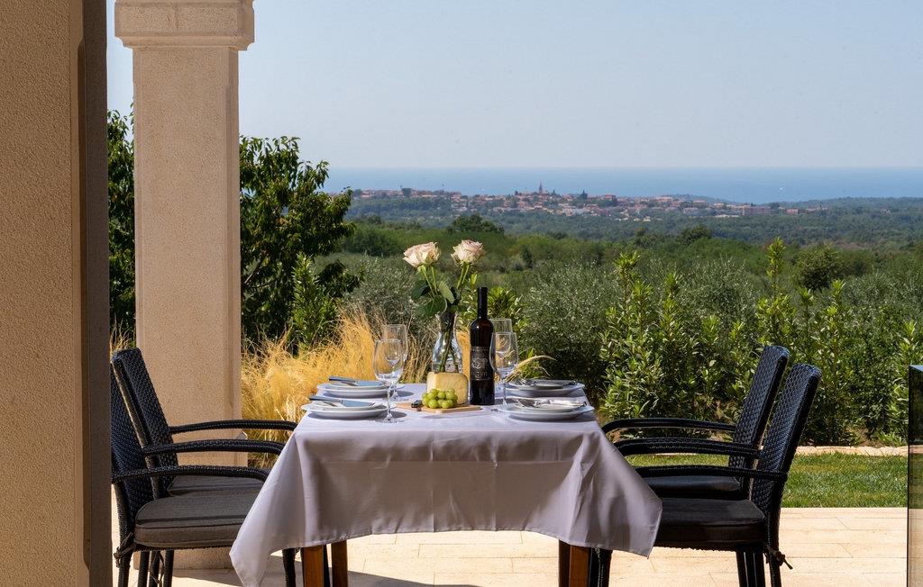 Denne smukke villa er beliggende nær Porec, i en lille landsby, som er 10 km væk fra havet og byens centrum. Villaen er bygget med sten og gode kvalitetsmaterialer, og den har en størrelse på 354m2, med 265m2 i stueetagen og 89m2 på første sal. Denne ejendom er beliggende på en 1.400m2 grund bestående af en velholdt have og eng. Ved siden af huset er der en garage på 58m2 til 2 køretøjer. Stueetagen har en stor stue med pejs, spisestue, køkken, spisekammer og 2 soveværelser med badeværelser (et af soveværelserne er placeret ved siden af køkkenet og det har en komfortabel sovesofa til 2 personer). Første sal har to soveværelser med ensuite badeværelser. Fra stuen har gæsterne let adgang til poolområdet og 40m2 privat swimmingpool. Soveværelserne ovenpå og poolområdet har en betagende havudsigt, så du kan nyde at svømme med udsigt til olivenlunde og Middelhavet. Udendørs kan du også slappe af i jacuzzien, som er tilgængelig på anmodning mod et ekstra gebyr. Denne ejendom er perfekt beliggende i fredelige olivenlunde og omkringliggende vinmarker, hvilket gør det til et perfekt tilflugtssted fra det hektiske moderne liv. Villaen er beliggende i udkanten af en lille landsby, der tilbyder fred og privatliv til familieferier, og alligevel er det kun 10-15 minutters kørsel fra den istriske juvel - Porec. Porec er det største turisthotspot i Istrien, hvor du vil finde alle slags aktiviteter, bemærkelsesværdige oplevelser og rig kulturarv. Det har 100 års erfaring inden for gæstfrihed og turisme. Sørg for ikke at gå glip af de mange fester, der arrangeres i turistlandsbyer og byens centrum. Der er strandklubber, kaffebarer, og efter midnat kan du nyde den behagelige atmosfære på natbarer og diskoteker. Intet andet end sjov fra solnedgang til solopgang! En bil anbefales. Temperaturen i den opvarmede swimmingpool er afhængig af eksterne faktorer, herunder vejrforhold, og som sådan kan temperaturen på vandet ikke garanteres.