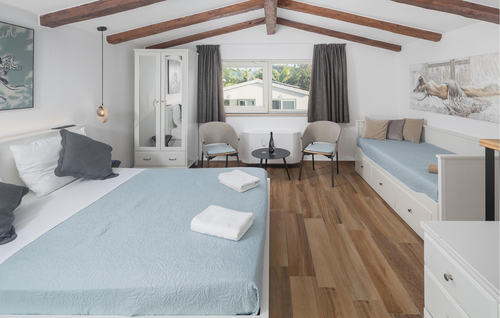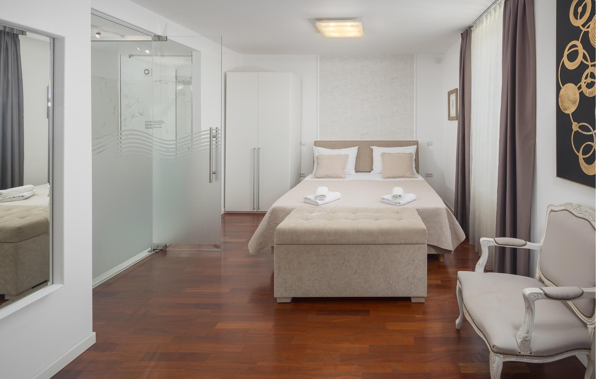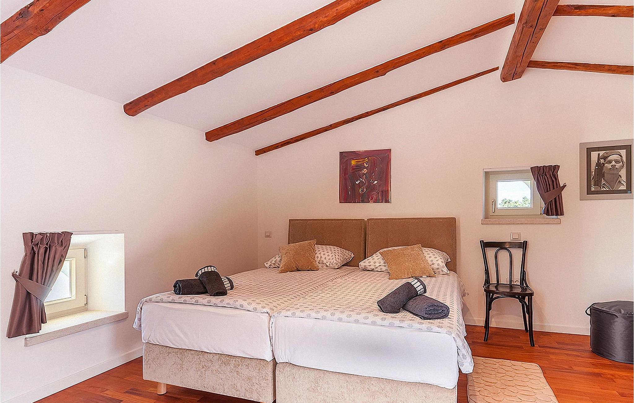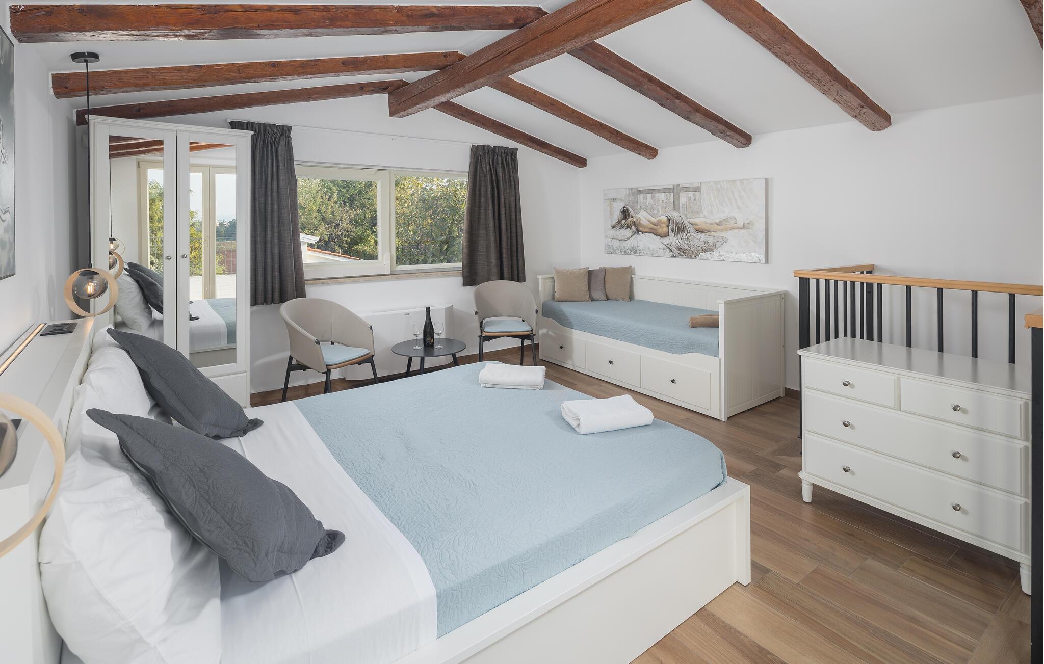 Beliggende i en by kendt for sin historiske arv, er den luksuriøse Villa Bruna i Porec den ideelle form for indkvartering til din afslappende ferie. Villaen blev restaureret på en moderne måde med nøje udvalgte detaljer og møbler, hvilket giver en varm og indbydende atmosfære. Ejendommen består af tre huse og kan rumme op til 10+2 gæster. Hovedhuset har 3 etager. I stueetagen finder du en rummelig stue, en spisestue og et fuldt udstyret køkken. Soveværelserne er fordelt på første og anden sal. Du finder 2 soveværelser med dobbeltsenge på første sal og yderligere 2 soveværelser med enkeltsenge, som kan skubbes sammen, på anden sal.