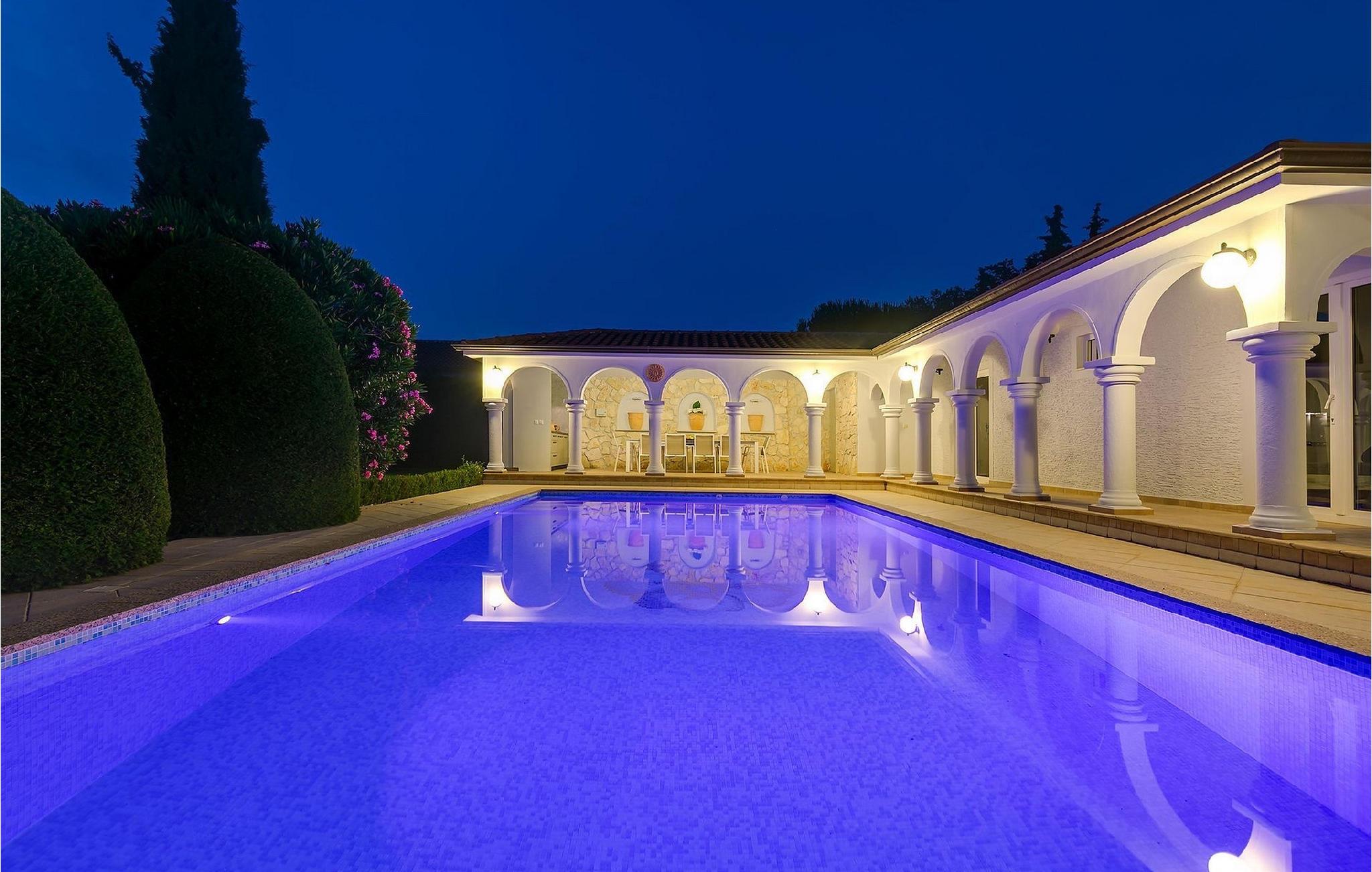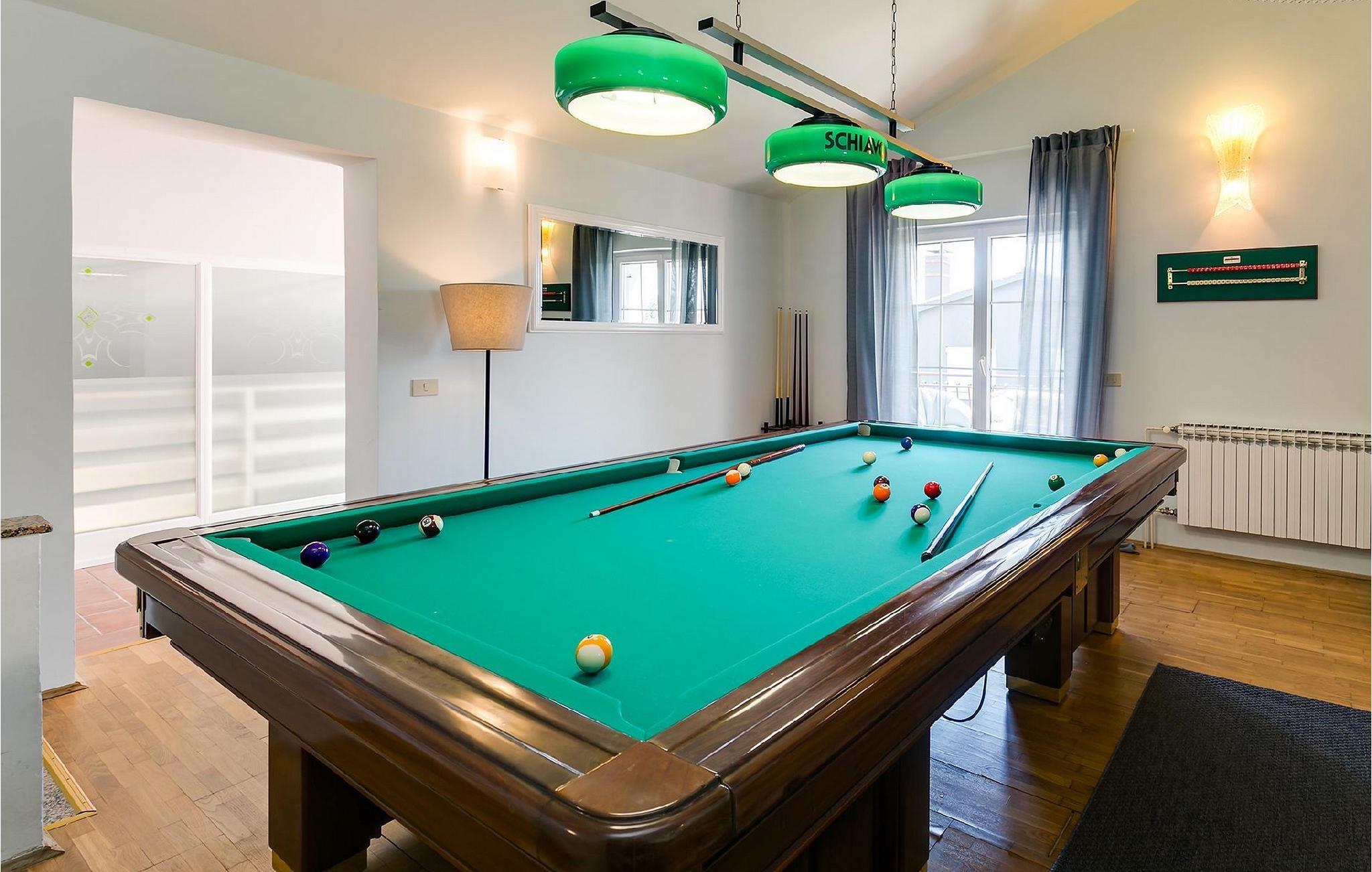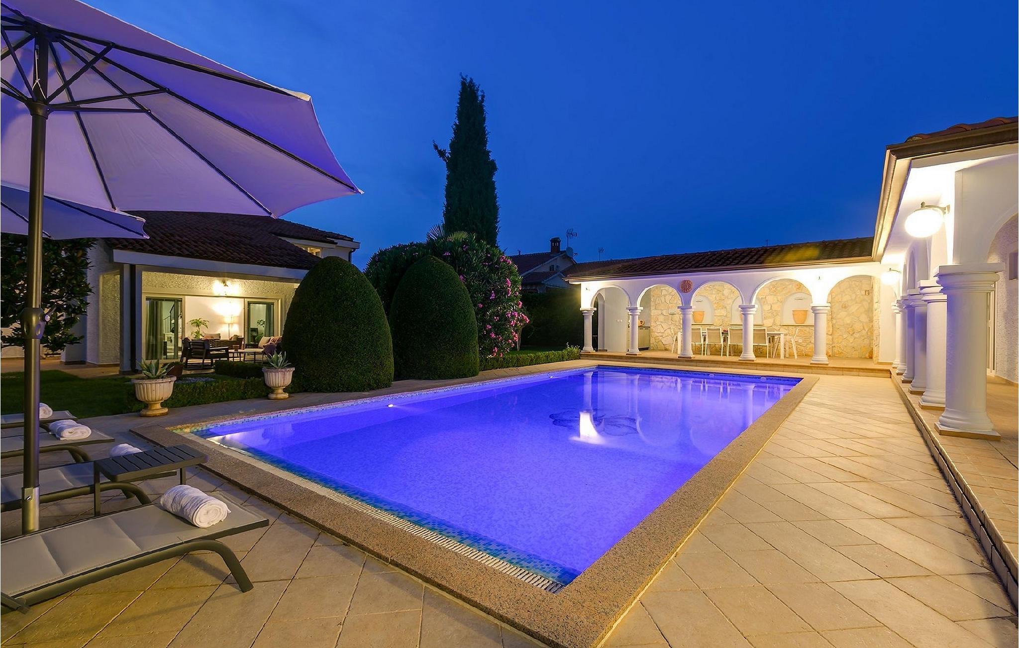 Den smukke familievilla My Lia ligger i den lille landsby Kukci, kun en kort køretur fra Porec. Denne villa har 5 soveværelser og kan rumme op til 10 personer, hvilket gør den til det perfekte valg for store familier. Villa My Lia er varmt indrettet for at få dig til at føle dig hjemme. Stueetagen består af en hyggelig stue med pejs og et moderne og fuldt udstyret køkken med spiseplads. Der er også 2 soveværelser med dobbeltseng og et soveværelse med 2 enkeltsenge. I stueetagen er der også 2 badeværelser, det ene med badekar og det andet med bruseniche. Trappen fører dig til første sal, som består af en hyggelig opholdsstue med poolbord, et velindrettet soveværelse med dobbeltseng, et soveværelse med 2 enkeltsenge og endnu et badeværelse med jacuzzi. Villaen byder også på et sommerkøkken, som er det ideelle sted for en familiesammenkomst. Der er også en gasgrill til din rådighed, så du kan tilberede lækre måltider til din familie og venner. Ønsker du at holde din ferie i solen, finder du en stor og meget indbydende pool og liggestole foran villaen, hvor du kan nyde den varme sommerbrise. Så udnyt denne mulighed og nyd din ferie.