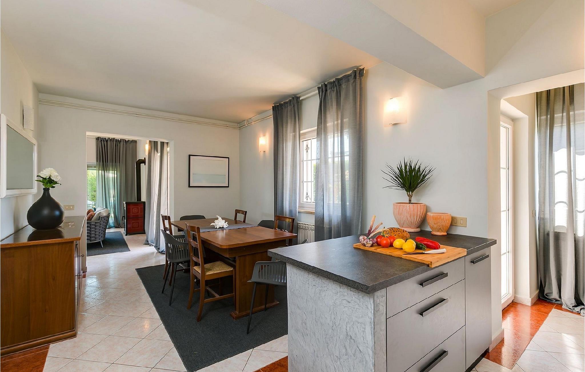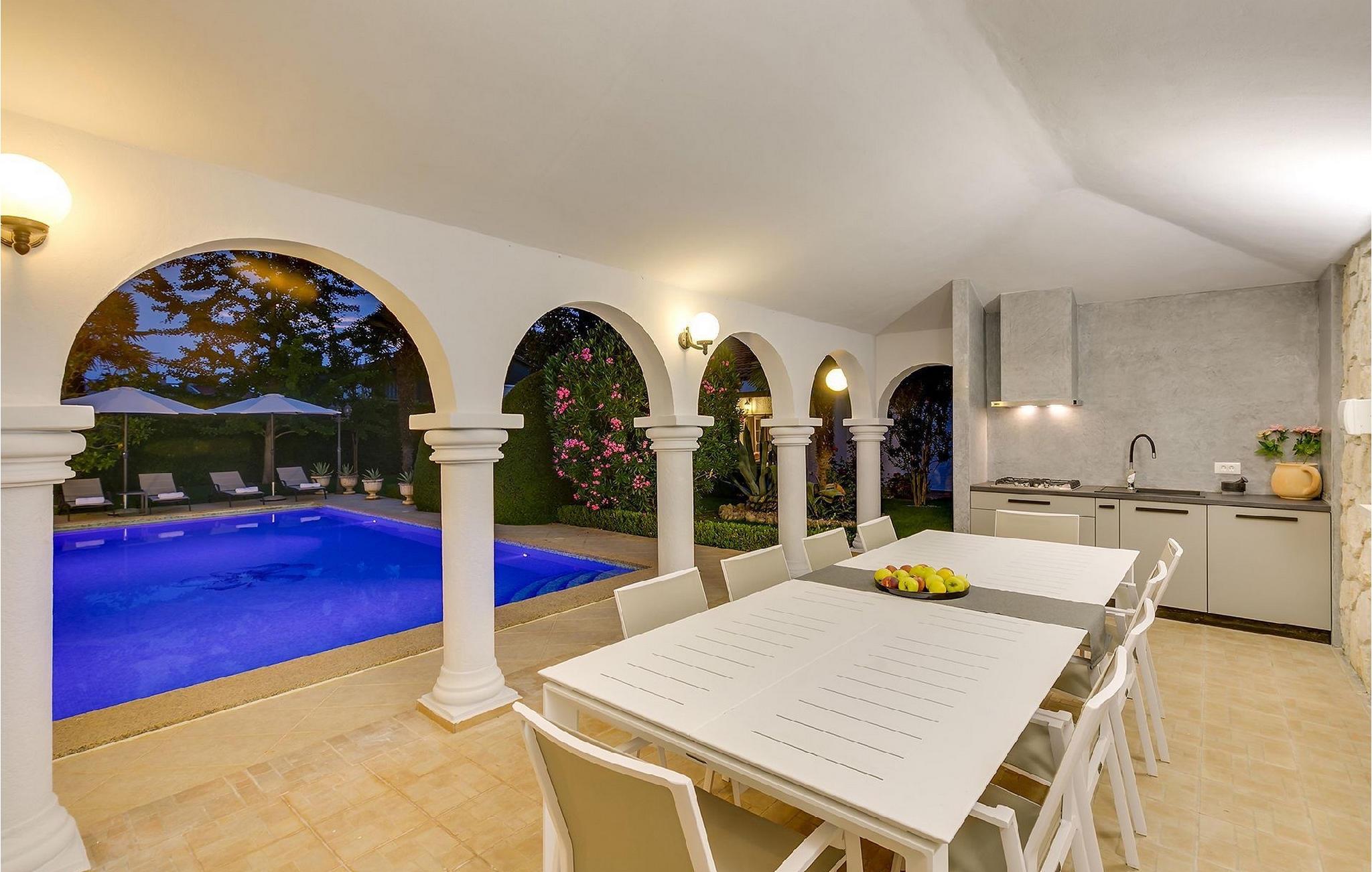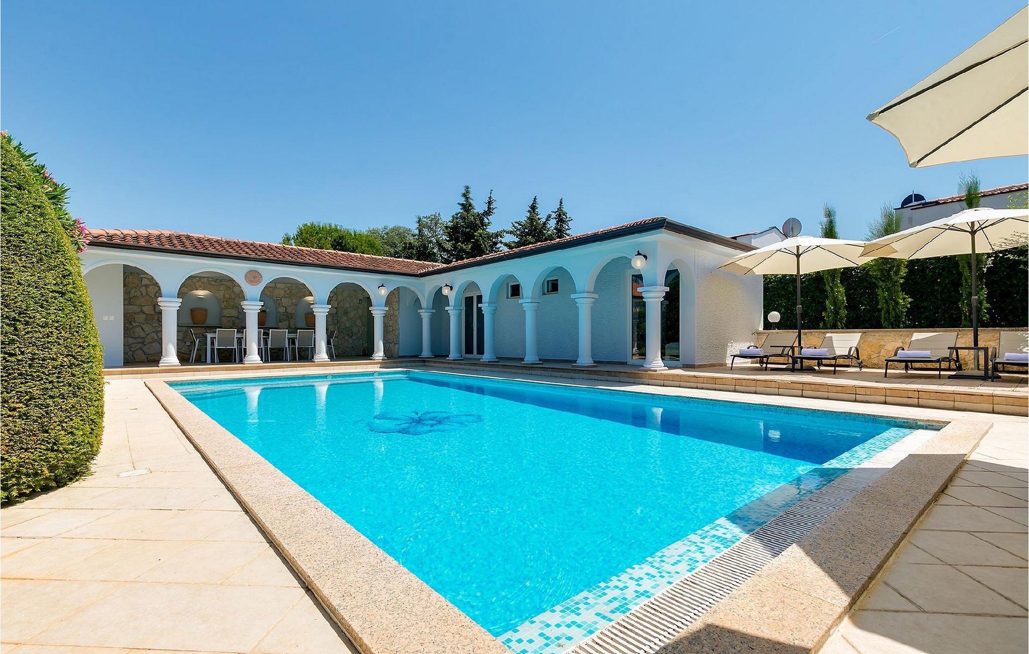 Den smukke familievilla My Lia ligger i den lille landsby Kukci, kun en kort køretur fra Porec. Denne villa har 5 soveværelser og kan rumme op til 10 personer, hvilket gør den til det perfekte valg for store familier. Villa My Lia er varmt indrettet for at få dig til at føle dig hjemme. Stueetagen består af en hyggelig stue med pejs og et moderne og fuldt udstyret køkken med spiseplads. Der er også 2 soveværelser med dobbeltseng og et soveværelse med 2 enkeltsenge. I stueetagen er der også 2 badeværelser, det ene med badekar og det andet med bruseniche. Trappen fører dig til første sal, som består af en hyggelig opholdsstue med poolbord, et velindrettet soveværelse med dobbeltseng, et soveværelse med 2 enkeltsenge og endnu et badeværelse med jacuzzi. Villaen byder også på et sommerkøkken, som er det ideelle sted for en familiesammenkomst. Der er også en gasgrill til din rådighed, så du kan tilberede lækre måltider til din familie og venner. Ønsker du at holde din ferie i solen, finder du en stor og meget indbydende pool og liggestole foran villaen, hvor du kan nyde den varme sommerbrise. Så udnyt denne mulighed og nyd din ferie.