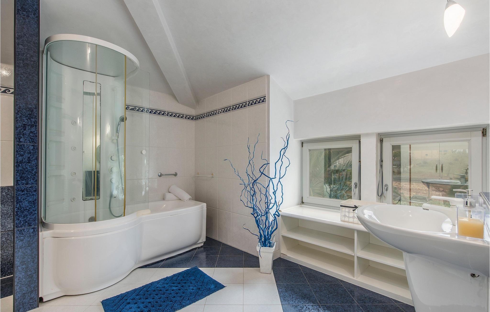 Du vil blive henrykt ved den smukt plejede have fyldt med planter og palmer, der giver en særlig middelhavsstemning. I midten af haven er der en stor privat pool, hvor du kan forfriske dig i de varme sommerdage. Poolen er omgivet af komfortable liggestole og ligger kun få skridt fra den smukke overdækkede terrasse med spiseplads, hvor du kan nyde måltiderne. Villaens indre er rummelig og smukt indrettet, og er opdelt i to etager. I villaens stueetage kan du finde en stue, hvorfra du har direkte adgang til terrassen, udstyret køkken med spiseplads, to soveværelser og to separate badeværelser. På første sal er der tre soveværelser, to badeværelser, hvoraf det ene er en suite og endnu en stue med TV.