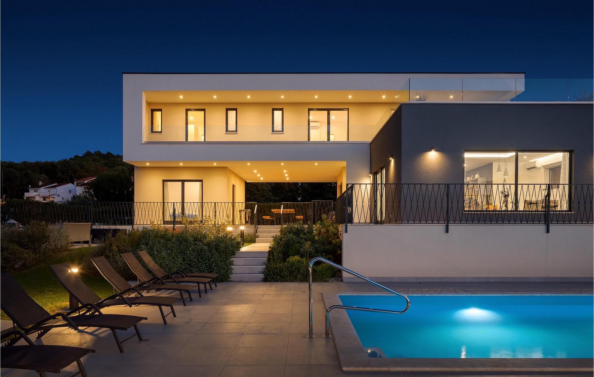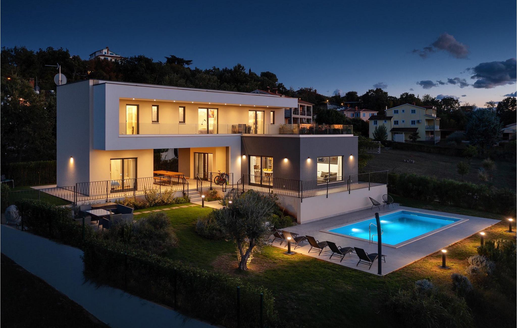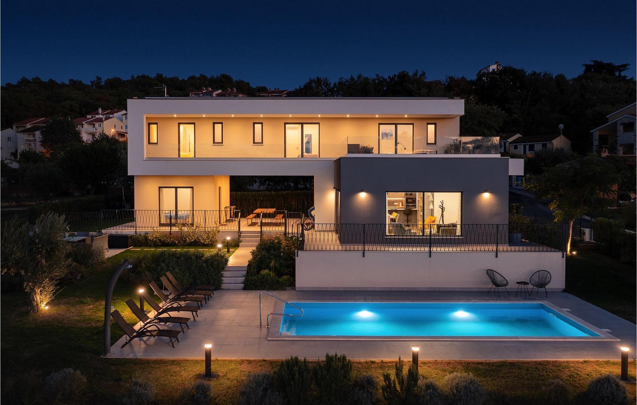 Rene linjer og elegante farveaccenter - Villa Maya Mugeba er kendetegnet ved et tidløst, moderne design. Med i alt 244 kvm byder den på plads og komfort for op til 8 personer. Udearealet er ikke mindre attraktivt. Der venter dig en forfriskende privat pool og have, som vil være smukt grøn, når du ankommer. Lad os tage en tur!