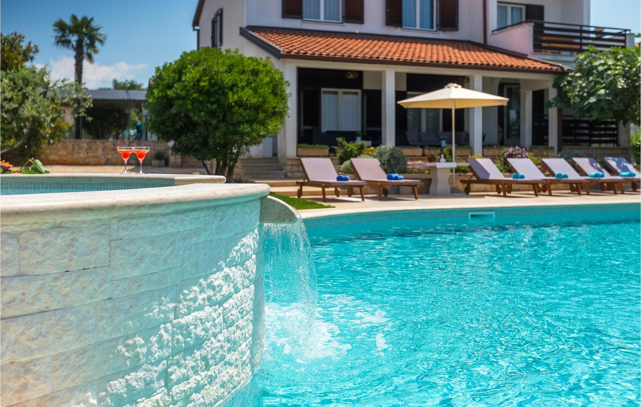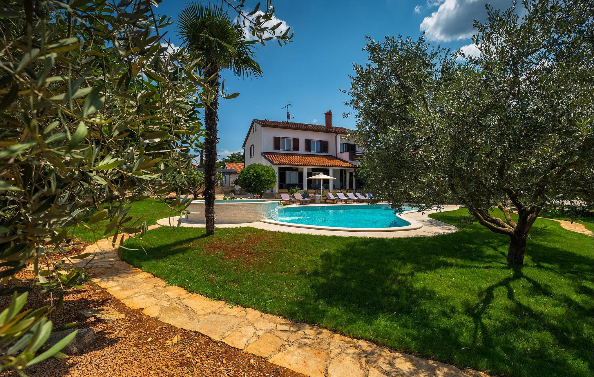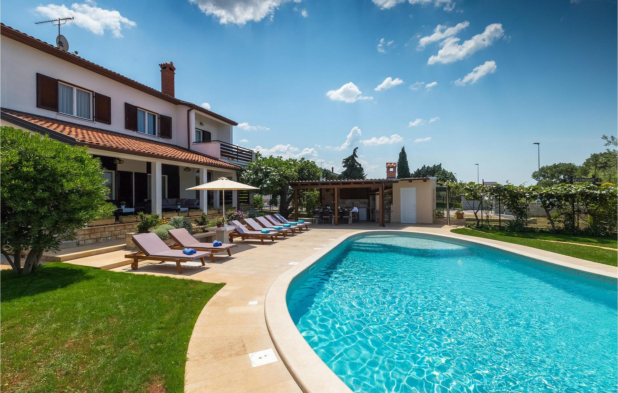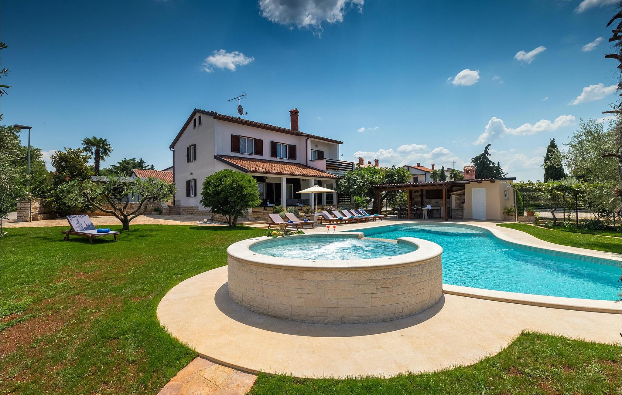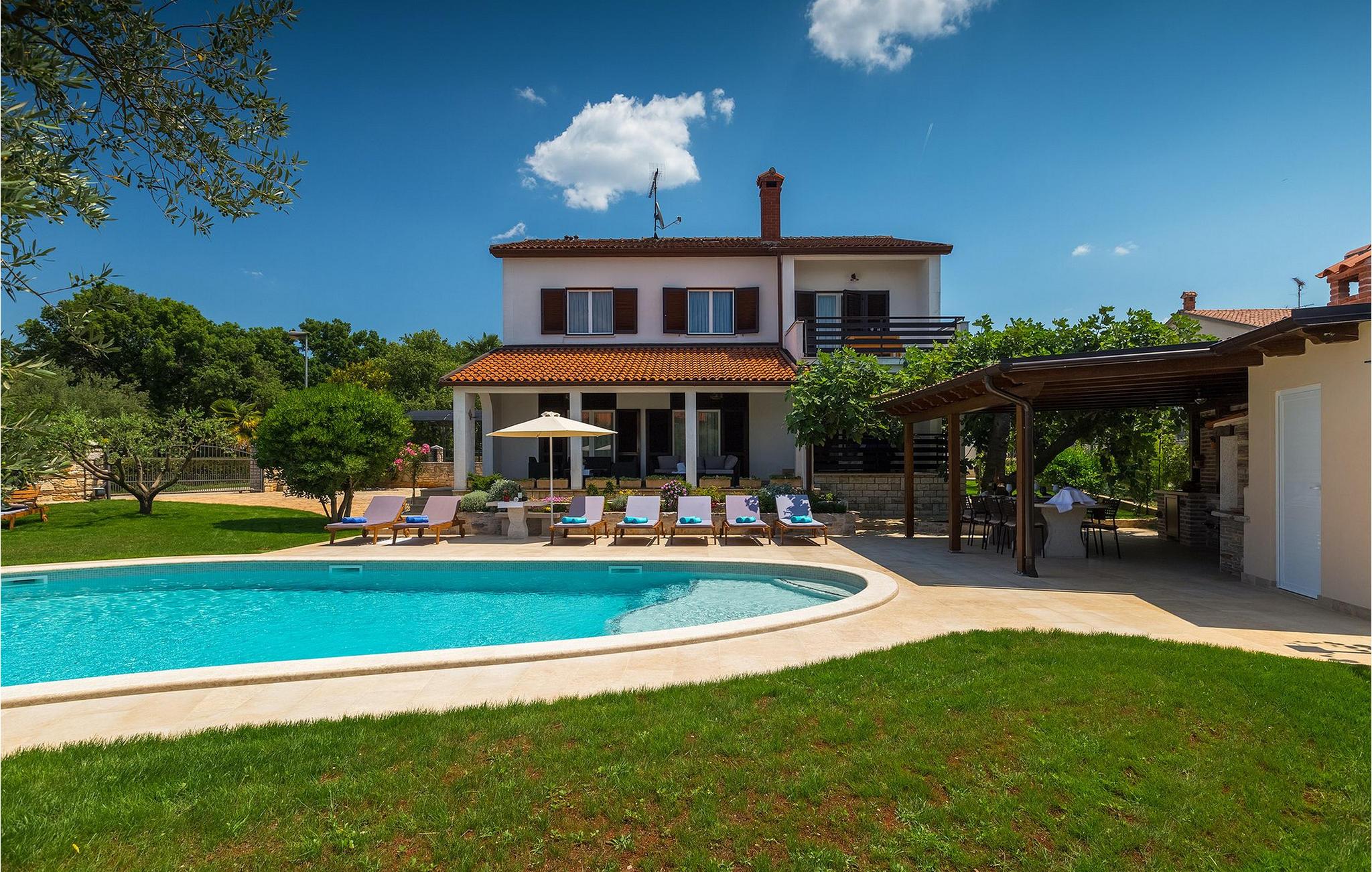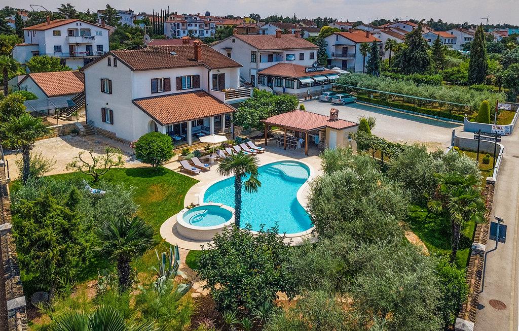 Diese wunderschöne Villa für 10 Personen befindet sich am Rande der schöner Küstenstadt Porec. Gelegen in einer friedlichen Nachbarschaft, Villa David ist die ideale Wahl für Familien, die nach einem Ort suchen, wo sie sich entspannen können und den Alltagsleben vergessen. Der wunderschön gepflegter grüner Garten wird Sie begeistern. Der Garten ist mit Pflanzen und Bäumen erfüllt, die einen besonderen mediterranen Duft verbreiten. Der Höhepunkt des Gartens ist der großer privater Pool mit Hydromassage. Der Pool ist von gemütlichen Liegestühlen umgeben und nur wenige Schritte von der wunderschönen überdachten Terrasse mit Außenküche und Essbereich entfernt, wo Sie Mahlzeiten zubereiten und speisen können. Das Innere der Villa ist schön eingerichtet, sehr hell und geräumig, und besteht aus 5 Schlafzimmern. Drei von ihnen verfügen über ein Doppelbett und zwei bestehen aus zwei Einzelbetten. Es gibt zwei Badezimmer mit jeweils einer Duschkabine. Im Erdgeschoss finden Sie ein Schlafzimmer, das Wohnzimmer, eine völlig ausgestattete Küche und einen Essbereich mit Zugang zur Terrasse mit einer gemütlichen Sitzecke und Tischfußball. Die restlichen vier Zimmer befinden sich im Obergeschoss. Der Balkon mit einem schönen Blick aufs Meer ist der perfekte Ort ist, um jeden Morgen Ihres Urlaubs zu beginnen. Die Villa ist komplett umzäunt, bietet wifi, 4 private Parkplätze und befindet sich in der Nähe aller Annehmlichkeiten, die Sie brauchen und nur eine kurze Fahrt vom nächsten Strand entfernt. Jugendgruppen sind nicht erlaubt.Gelegen im ruhigen Teil von Porec, aber nur eine kurze Fahrt vom Stadtzentrum entfernt, diese Villa ist ideal sowohl für diejenigen, die einen entspannenden Urlaub bevorzugen, als auch für diejenigen, die die Hektik der touristischen Städte mögen. In Porec finden Sie alle Arten von Aktivitäten, Restaurants, Bars und Clubs, aber die Stadt ist vor allem für ihr reiches kulturelles Erbe bekannt. Porec, früher eine römische Kolonie, erreichte seinen Höhepunkt während der Herrschaft des byzantinischen Kaiser Justinian. Die atemberaubende Euphrasius Basilika, unter dem UNESCO- Schutz, ist der beste Beweis dafür, wie glorreich diese Epoche war. Interessensgebiete sind die mittelalterlichen Städte Motovun und Groznjan sowie die Küstenstädte Rovinj und Vrsar. Etwas weiter entfernt, die Brijuni-Inseln, das römische Amphitheater in Pula und Venedig sind von dieser Region leicht erreichbar.