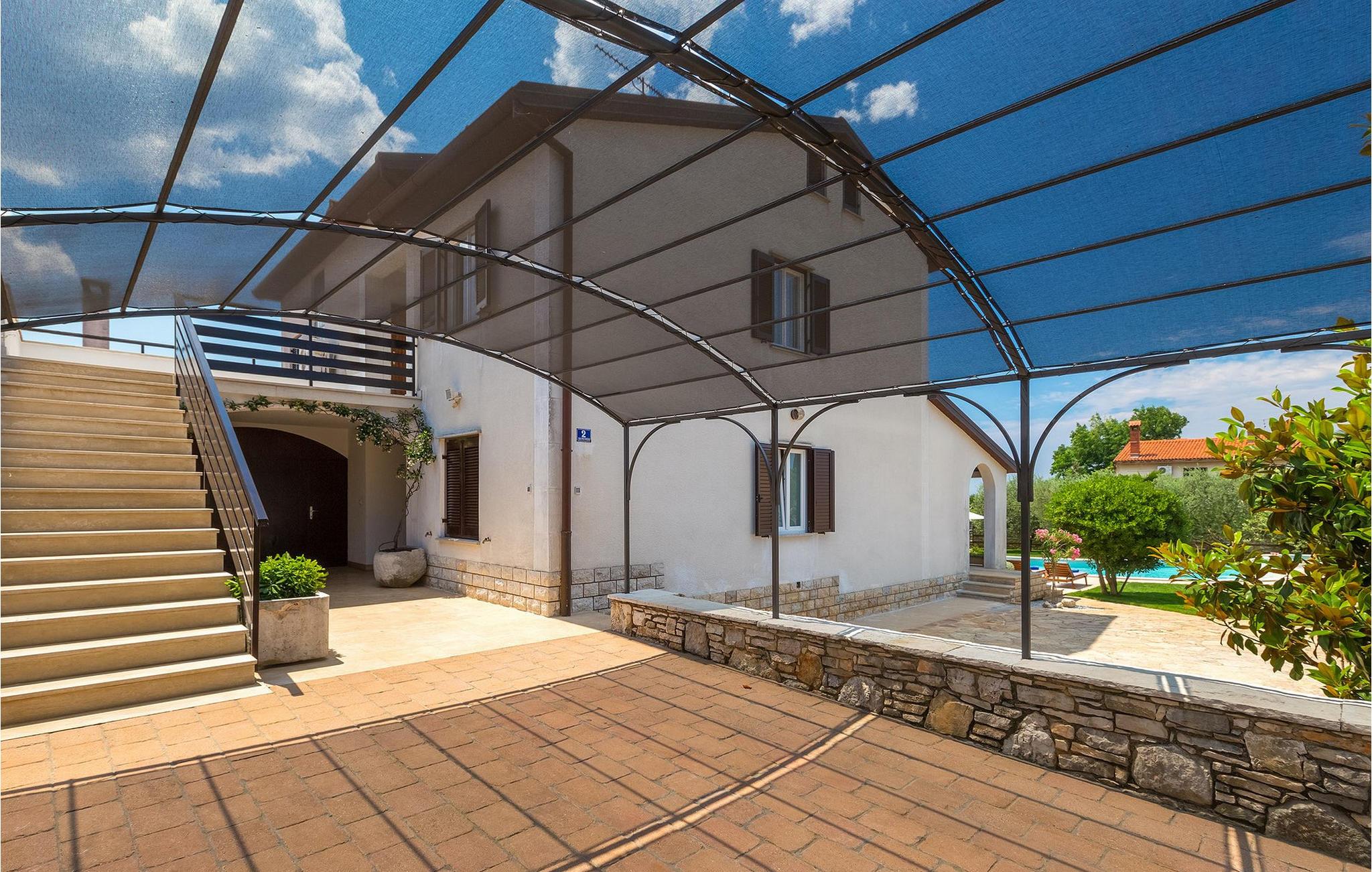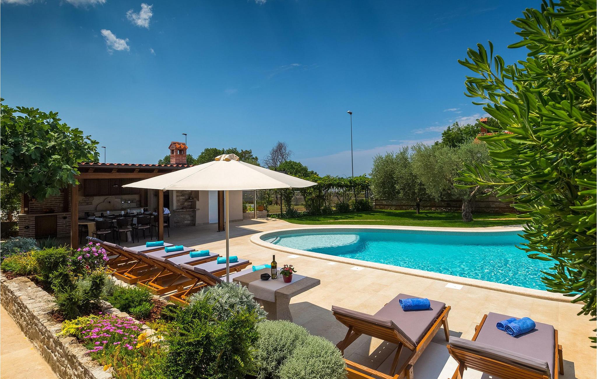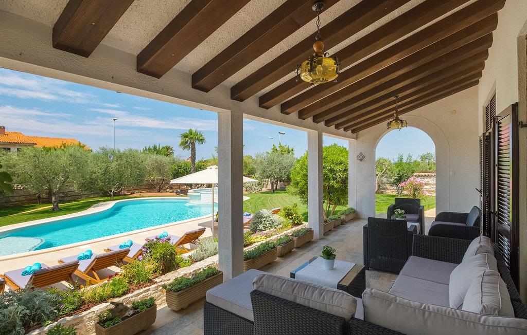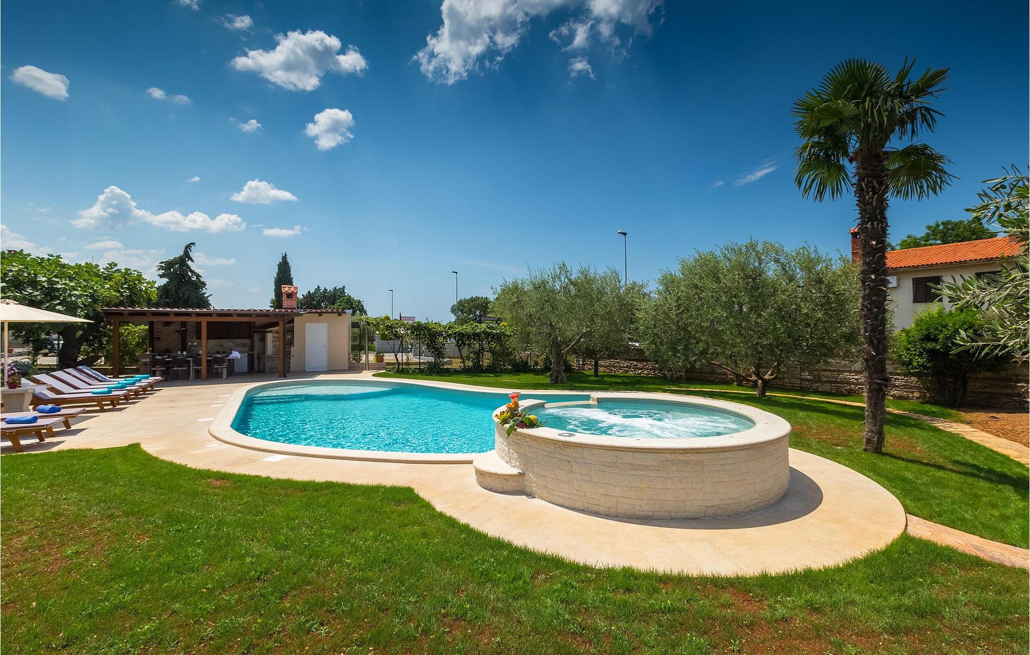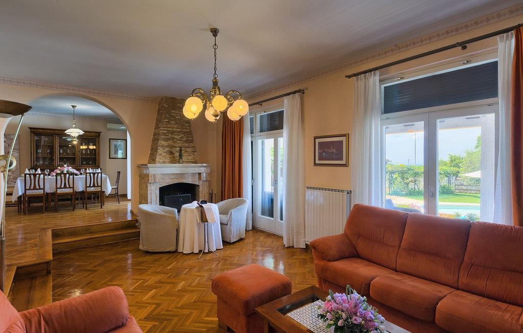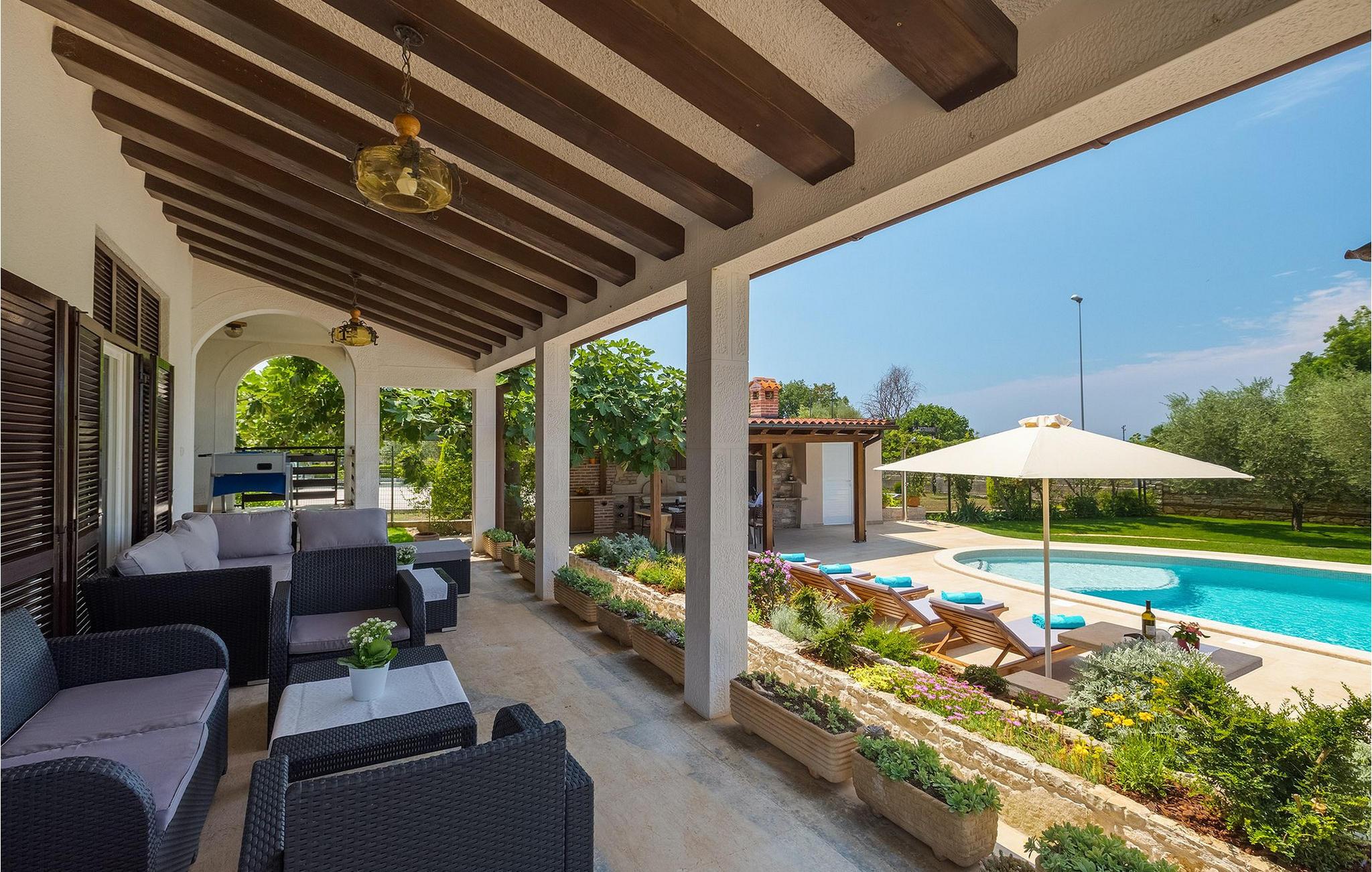 Diese wunderschöne Villa für 10 Personen befindet sich am Rande der schöner Küstenstadt Porec. Gelegen in einer friedlichen Nachbarschaft, Villa David ist die ideale Wahl für Familien, die nach einem Ort suchen, wo sie sich entspannen können und den Alltagsleben vergessen. Der wunderschön gepflegter grüner Garten wird Sie begeistern. Der Garten ist mit Pflanzen und Bäumen erfüllt, die einen besonderen mediterranen Duft verbreiten. Der Höhepunkt des Gartens ist der großer privater Pool mit Hydromassage. Der Pool ist von gemütlichen Liegestühlen umgeben und nur wenige Schritte von der wunderschönen überdachten Terrasse mit Außenküche und Essbereich entfernt, wo Sie Mahlzeiten zubereiten und speisen können. Das Innere der Villa ist schön eingerichtet, sehr hell und geräumig, und besteht aus 5 Schlafzimmern. Drei von ihnen verfügen über ein Doppelbett und zwei bestehen aus zwei Einzelbetten. Es gibt zwei Badezimmer mit jeweils einer Duschkabine. Im Erdgeschoss finden Sie ein Schlafzimmer, das Wohnzimmer, eine völlig ausgestattete Küche und einen Essbereich mit Zugang zur Terrasse mit einer gemütlichen Sitzecke und Tischfußball. Die restlichen vier Zimmer befinden sich im Obergeschoss. Der Balkon mit einem schönen Blick aufs Meer ist der perfekte Ort ist, um jeden Morgen Ihres Urlaubs zu beginnen. Die Villa ist komplett umzäunt, bietet wifi, 4 private Parkplätze und befindet sich in der Nähe aller Annehmlichkeiten, die Sie brauchen und nur eine kurze Fahrt vom nächsten Strand entfernt. Jugendgruppen sind nicht erlaubt.Gelegen im ruhigen Teil von Porec, aber nur eine kurze Fahrt vom Stadtzentrum entfernt, diese Villa ist ideal sowohl für diejenigen, die einen entspannenden Urlaub bevorzugen, als auch für diejenigen, die die Hektik der touristischen Städte mögen. In Porec finden Sie alle Arten von Aktivitäten, Restaurants, Bars und Clubs, aber die Stadt ist vor allem für ihr reiches kulturelles Erbe bekannt. Porec, früher eine römische Kolonie, erreichte seinen Höhepunkt während der Herrschaft des byzantinischen Kaiser Justinian. Die atemberaubende Euphrasius Basilika, unter dem UNESCO- Schutz, ist der beste Beweis dafür, wie glorreich diese Epoche war. Interessensgebiete sind die mittelalterlichen Städte Motovun und Groznjan sowie die Küstenstädte Rovinj und Vrsar. Etwas weiter entfernt, die Brijuni-Inseln, das römische Amphitheater in Pula und Venedig sind von dieser Region leicht erreichbar.