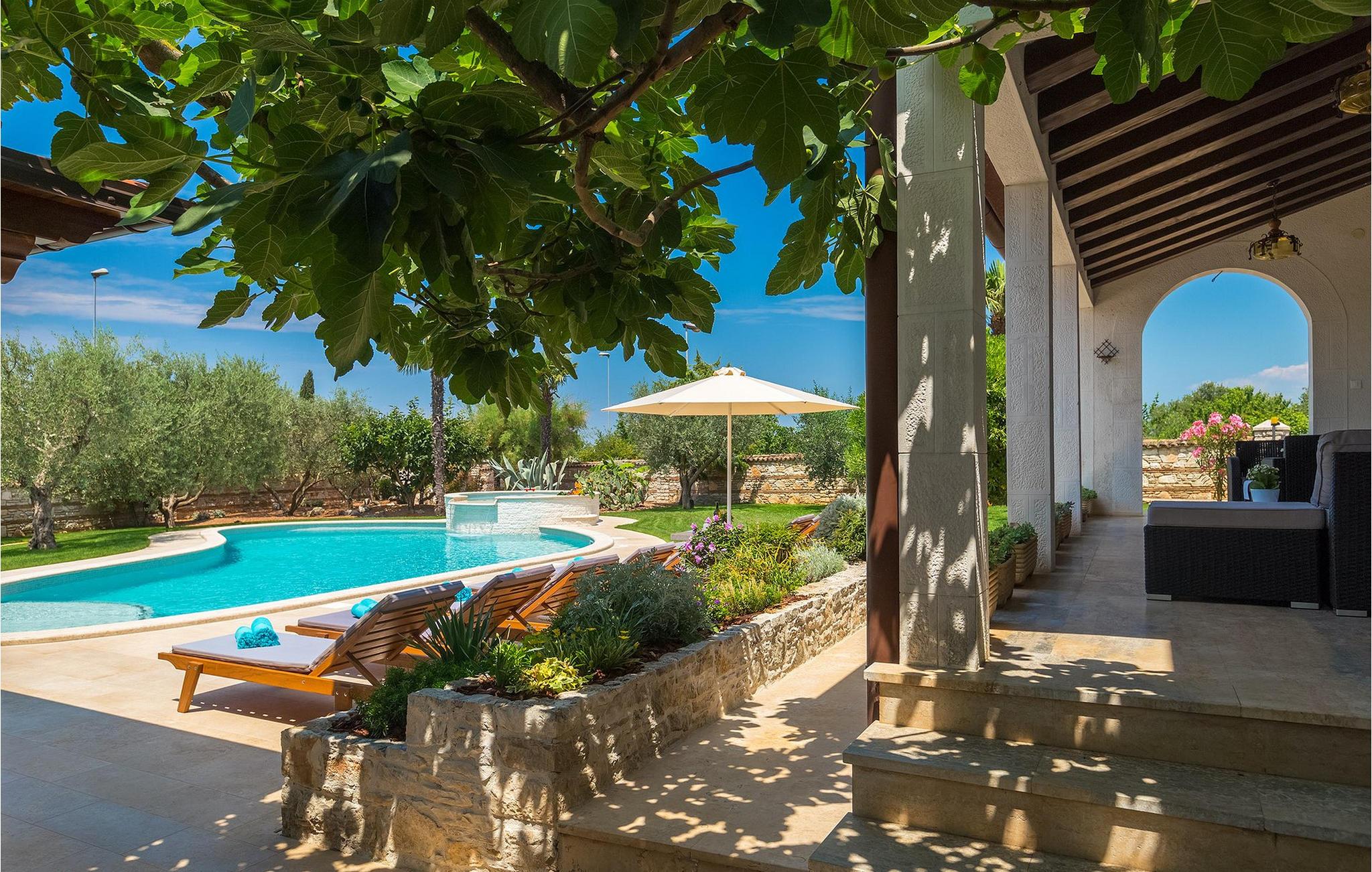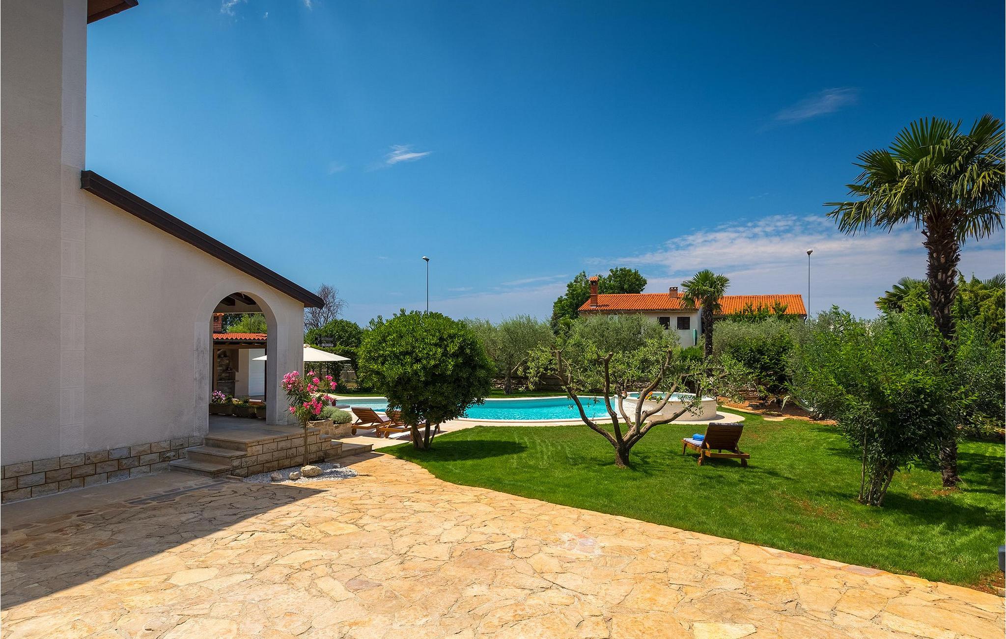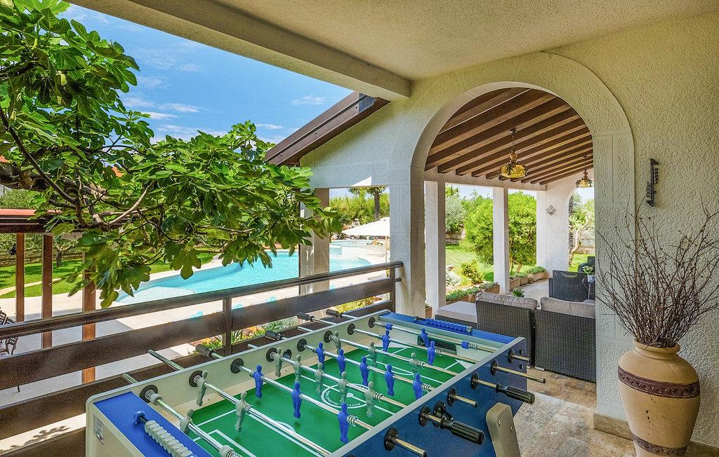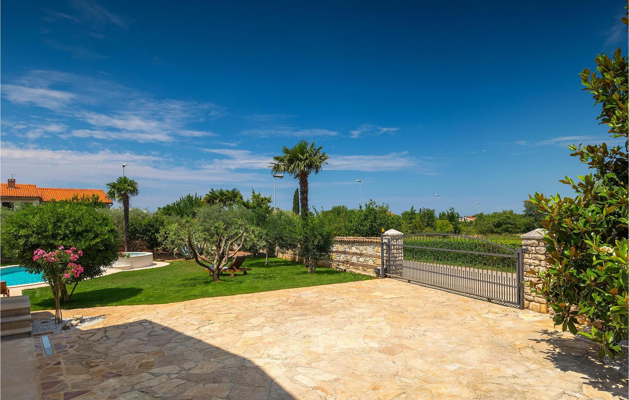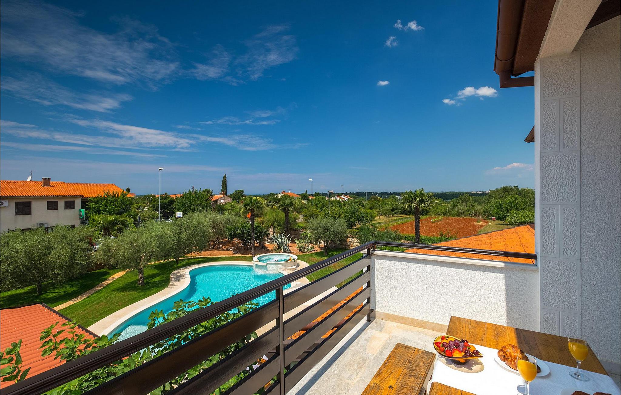 Diese wunderschöne Villa für 10 Personen befindet sich am Rande der schöner Küstenstadt Porec. Gelegen in einer friedlichen Nachbarschaft, Villa David ist die ideale Wahl für Familien, die nach einem Ort suchen, wo sie sich entspannen können und den Alltagsleben vergessen. Der wunderschön gepflegter grüner Garten wird Sie begeistern. Der Garten ist mit Pflanzen und Bäumen erfüllt, die einen besonderen mediterranen Duft verbreiten. Der Höhepunkt des Gartens ist der großer privater Pool mit Hydromassage. Der Pool ist von gemütlichen Liegestühlen umgeben und nur wenige Schritte von der wunderschönen überdachten Terrasse mit Außenküche und Essbereich entfernt, wo Sie Mahlzeiten zubereiten und speisen können. Das Innere der Villa ist schön eingerichtet, sehr hell und geräumig, und besteht aus 5 Schlafzimmern. Drei von ihnen verfügen über ein Doppelbett und zwei bestehen aus zwei Einzelbetten. Es gibt zwei Badezimmer mit jeweils einer Duschkabine. Im Erdgeschoss finden Sie ein Schlafzimmer, das Wohnzimmer, eine völlig ausgestattete Küche und einen Essbereich mit Zugang zur Terrasse mit einer gemütlichen Sitzecke und Tischfußball. Die restlichen vier Zimmer befinden sich im Obergeschoss. Der Balkon mit einem schönen Blick aufs Meer ist der perfekte Ort ist, um jeden Morgen Ihres Urlaubs zu beginnen. Die Villa ist komplett umzäunt, bietet wifi, 4 private Parkplätze und befindet sich in der Nähe aller Annehmlichkeiten, die Sie brauchen und nur eine kurze Fahrt vom nächsten Strand entfernt. Jugendgruppen sind nicht erlaubt.Gelegen im ruhigen Teil von Porec, aber nur eine kurze Fahrt vom Stadtzentrum entfernt, diese Villa ist ideal sowohl für diejenigen, die einen entspannenden Urlaub bevorzugen, als auch für diejenigen, die die Hektik der touristischen Städte mögen. In Porec finden Sie alle Arten von Aktivitäten, Restaurants, Bars und Clubs, aber die Stadt ist vor allem für ihr reiches kulturelles Erbe bekannt. Porec, früher eine römische Kolonie, erreichte seinen Höhepunkt während der Herrschaft des byzantinischen Kaiser Justinian. Die atemberaubende Euphrasius Basilika, unter dem UNESCO- Schutz, ist der beste Beweis dafür, wie glorreich diese Epoche war. Interessensgebiete sind die mittelalterlichen Städte Motovun und Groznjan sowie die Küstenstädte Rovinj und Vrsar. Etwas weiter entfernt, die Brijuni-Inseln, das römische Amphitheater in Pula und Venedig sind von dieser Region leicht erreichbar.