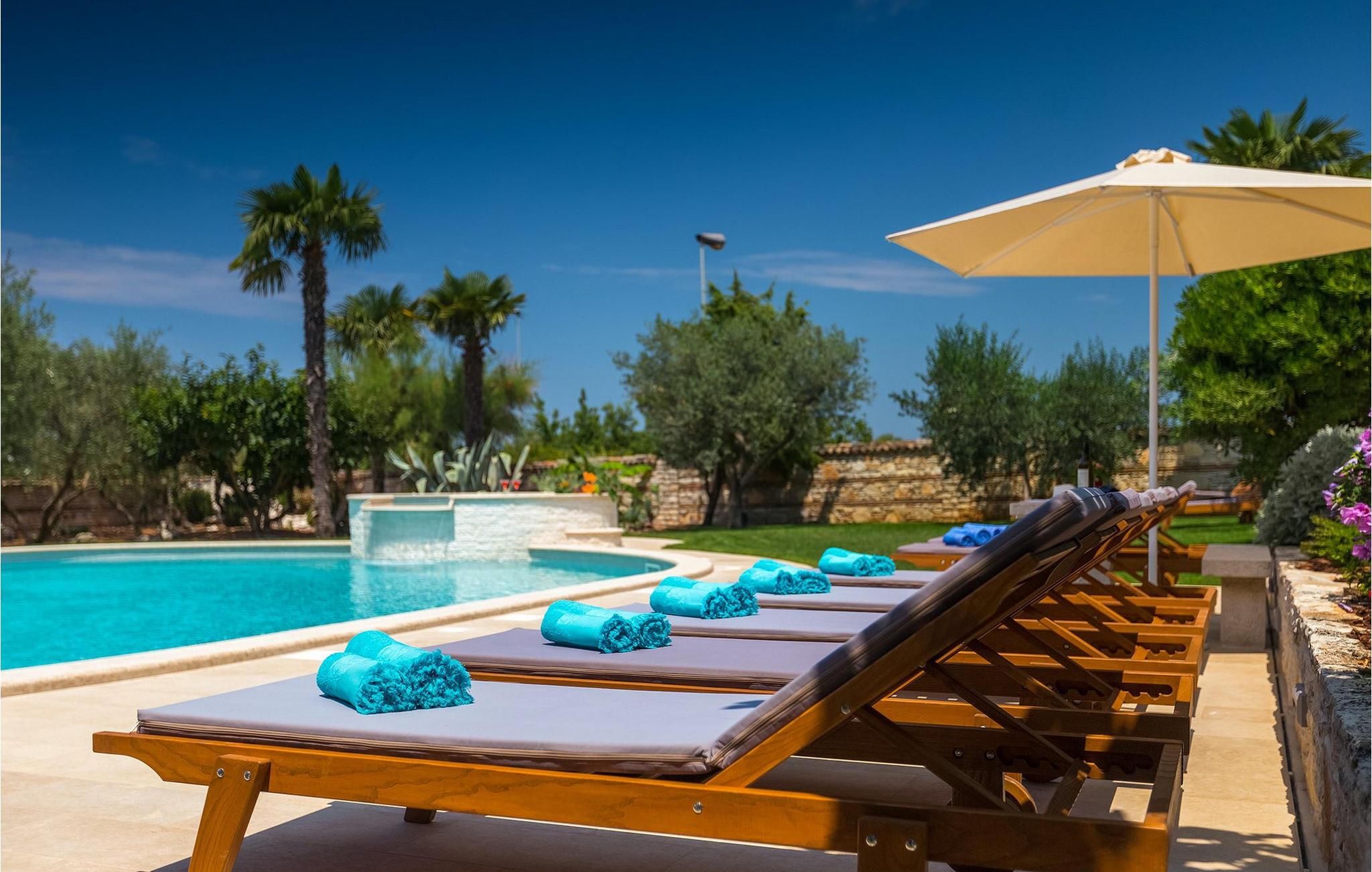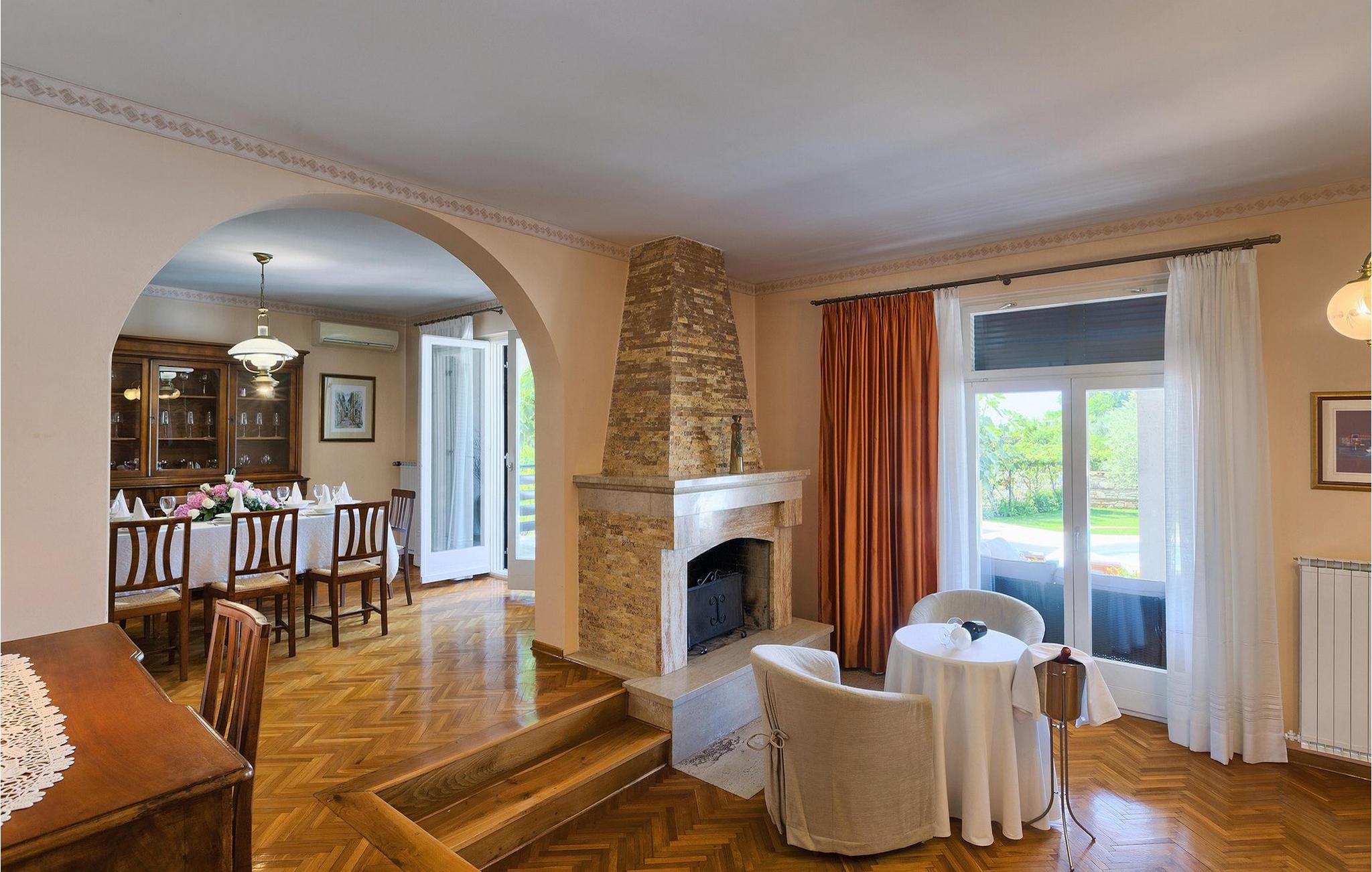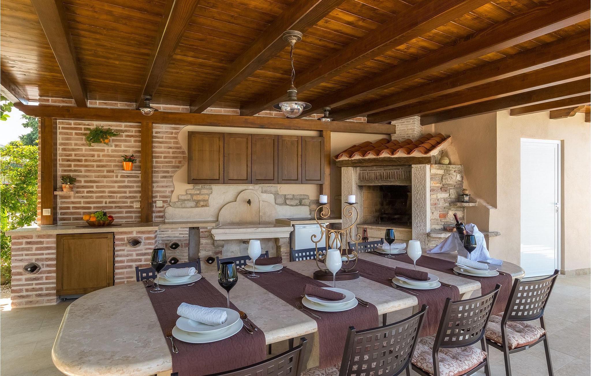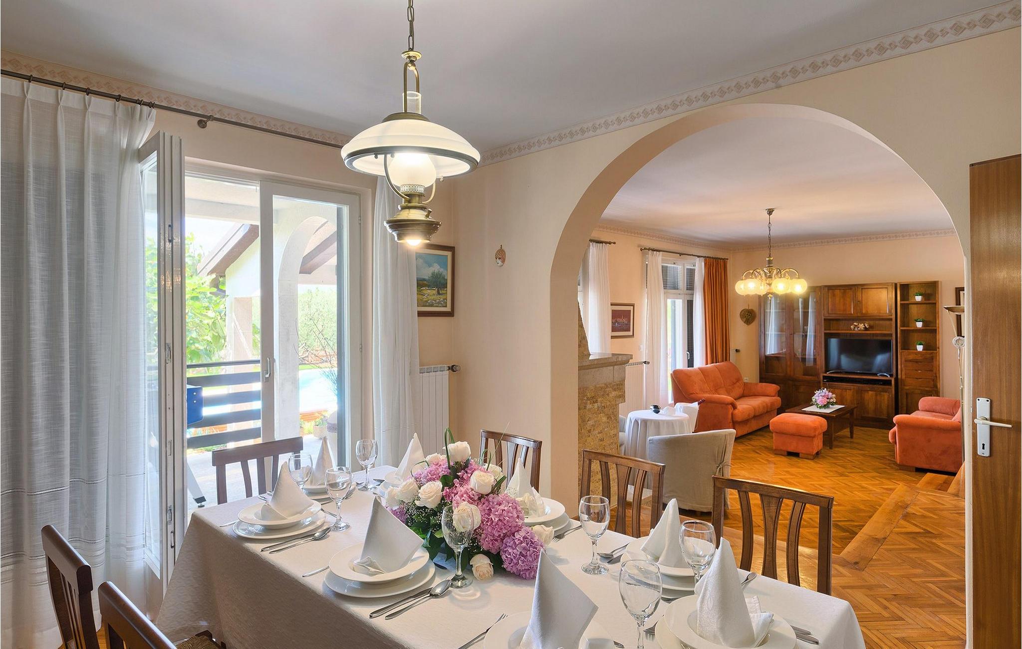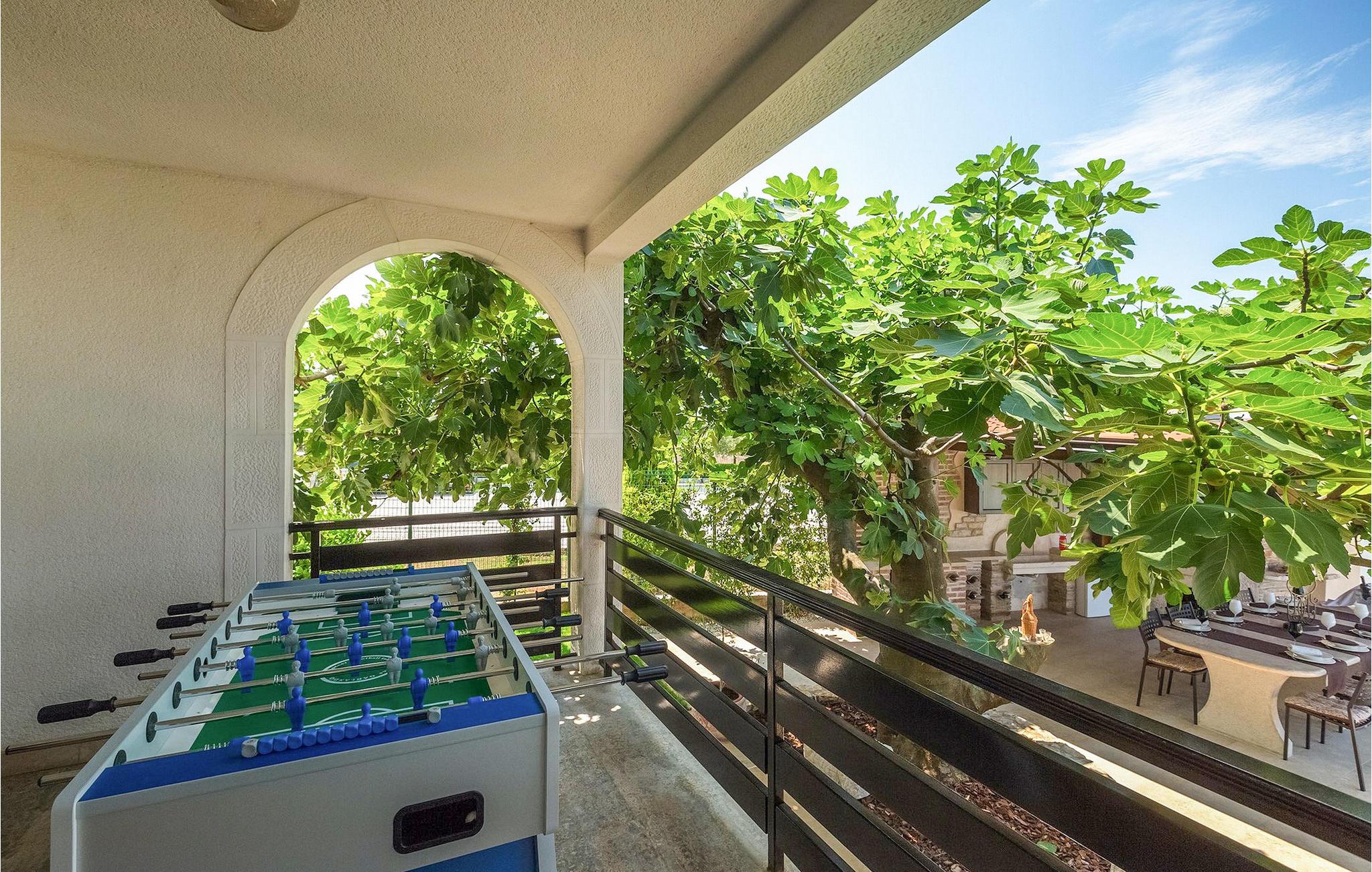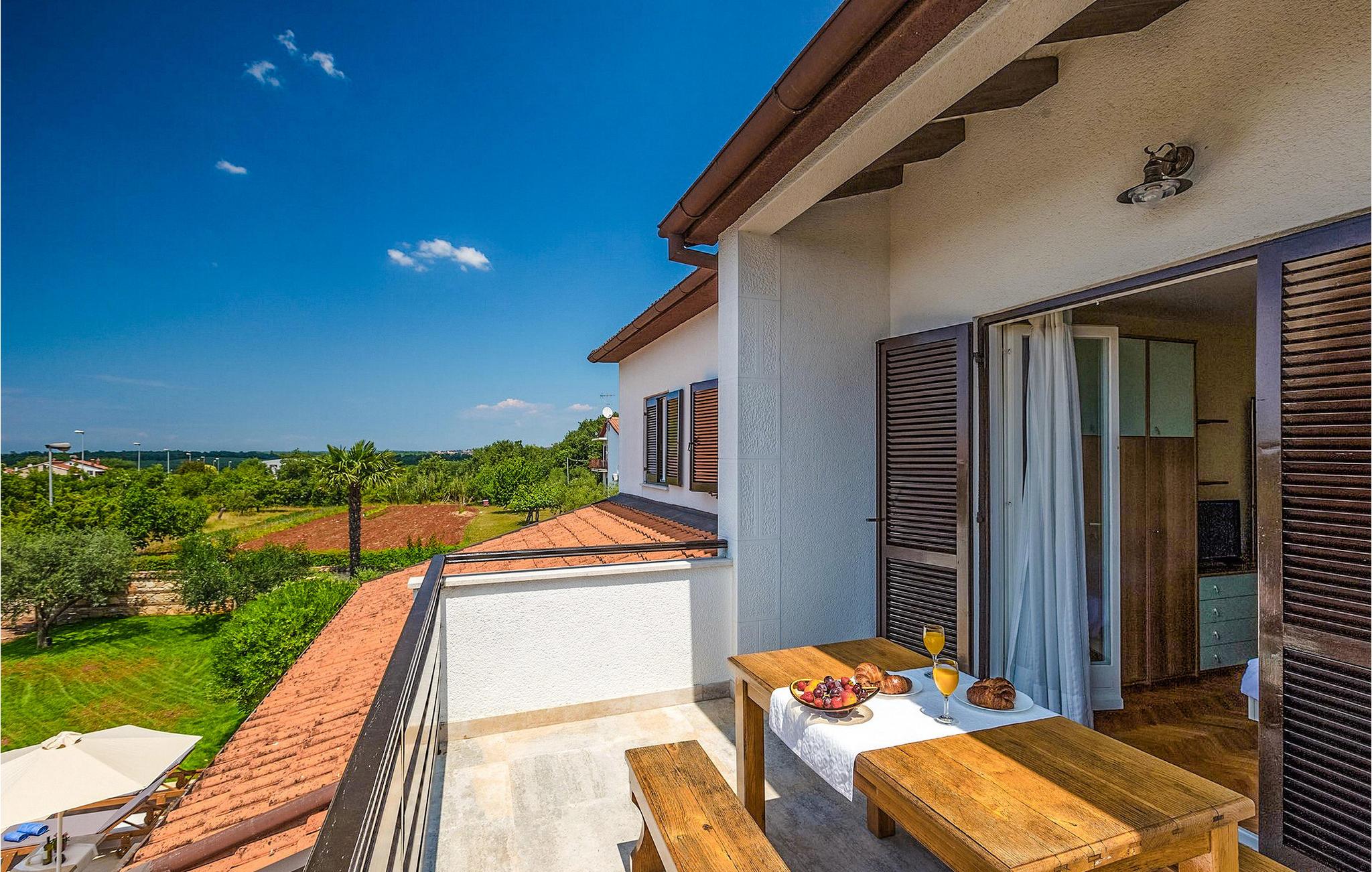 Diese wunderschöne Villa für 10 Personen befindet sich am Rande der schöner Küstenstadt Porec. Gelegen in einer friedlichen Nachbarschaft, Villa David ist die ideale Wahl für Familien, die nach einem Ort suchen, wo sie sich entspannen können und den Alltagsleben vergessen. Der wunderschön gepflegter grüner Garten wird Sie begeistern. Der Garten ist mit Pflanzen und Bäumen erfüllt, die einen besonderen mediterranen Duft verbreiten. Der Höhepunkt des Gartens ist der großer privater Pool mit Hydromassage. Der Pool ist von gemütlichen Liegestühlen umgeben und nur wenige Schritte von der wunderschönen überdachten Terrasse mit Außenküche und Essbereich entfernt, wo Sie Mahlzeiten zubereiten und speisen können. Das Innere der Villa ist schön eingerichtet, sehr hell und geräumig, und besteht aus 5 Schlafzimmern. Drei von ihnen verfügen über ein Doppelbett und zwei bestehen aus zwei Einzelbetten. Es gibt zwei Badezimmer mit jeweils einer Duschkabine. Im Erdgeschoss finden Sie ein Schlafzimmer, das Wohnzimmer, eine völlig ausgestattete Küche und einen Essbereich mit Zugang zur Terrasse mit einer gemütlichen Sitzecke und Tischfußball. Die restlichen vier Zimmer befinden sich im Obergeschoss. Der Balkon mit einem schönen Blick aufs Meer ist der perfekte Ort ist, um jeden Morgen Ihres Urlaubs zu beginnen. Die Villa ist komplett umzäunt, bietet wifi, 4 private Parkplätze und befindet sich in der Nähe aller Annehmlichkeiten, die Sie brauchen und nur eine kurze Fahrt vom nächsten Strand entfernt. Jugendgruppen sind nicht erlaubt.Gelegen im ruhigen Teil von Porec, aber nur eine kurze Fahrt vom Stadtzentrum entfernt, diese Villa ist ideal sowohl für diejenigen, die einen entspannenden Urlaub bevorzugen, als auch für diejenigen, die die Hektik der touristischen Städte mögen. In Porec finden Sie alle Arten von Aktivitäten, Restaurants, Bars und Clubs, aber die Stadt ist vor allem für ihr reiches kulturelles Erbe bekannt. Porec, früher eine römische Kolonie, erreichte seinen Höhepunkt während der Herrschaft des byzantinischen Kaiser Justinian. Die atemberaubende Euphrasius Basilika, unter dem UNESCO- Schutz, ist der beste Beweis dafür, wie glorreich diese Epoche war. Interessensgebiete sind die mittelalterlichen Städte Motovun und Groznjan sowie die Küstenstädte Rovinj und Vrsar. Etwas weiter entfernt, die Brijuni-Inseln, das römische Amphitheater in Pula und Venedig sind von dieser Region leicht erreichbar.