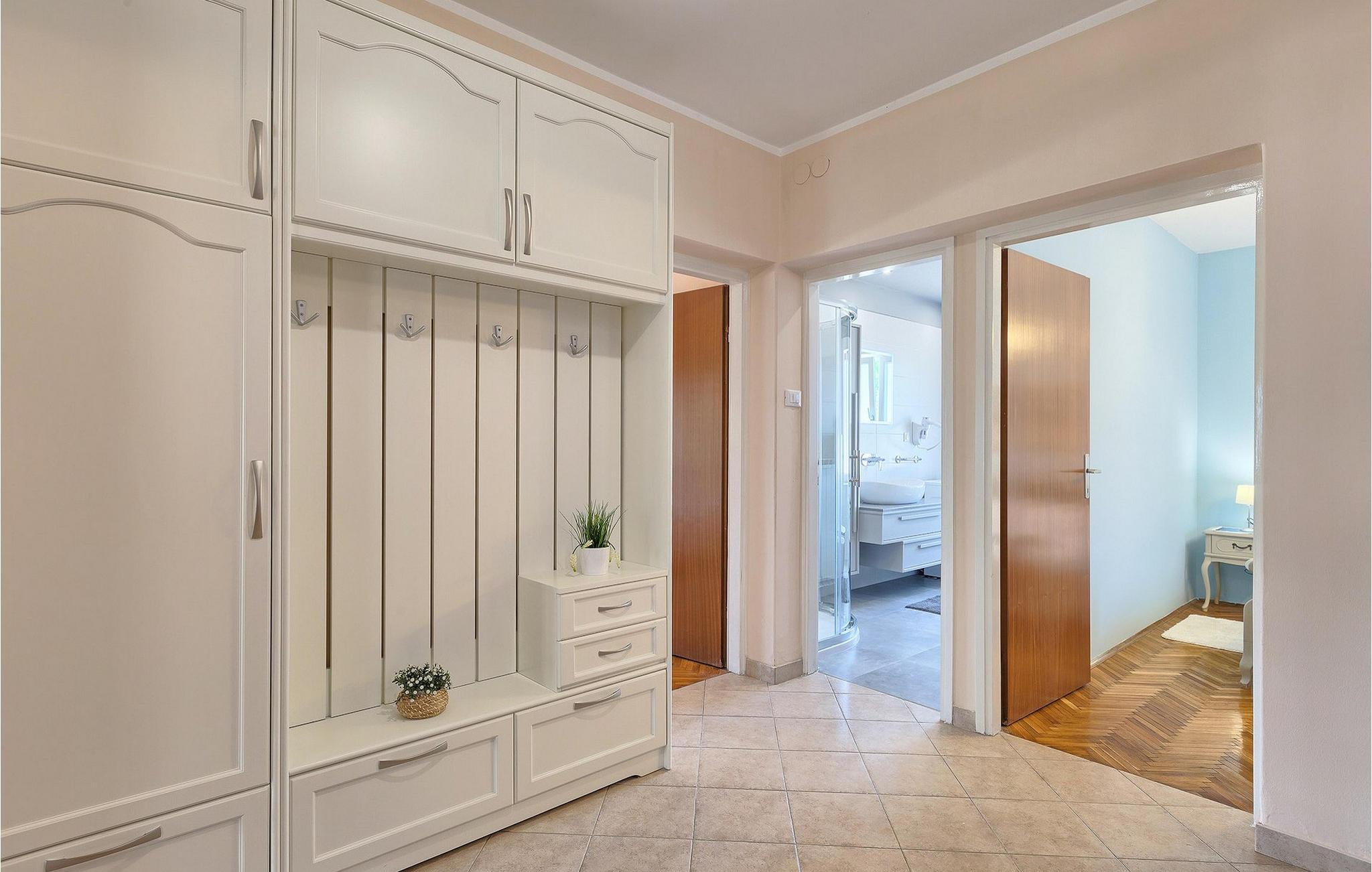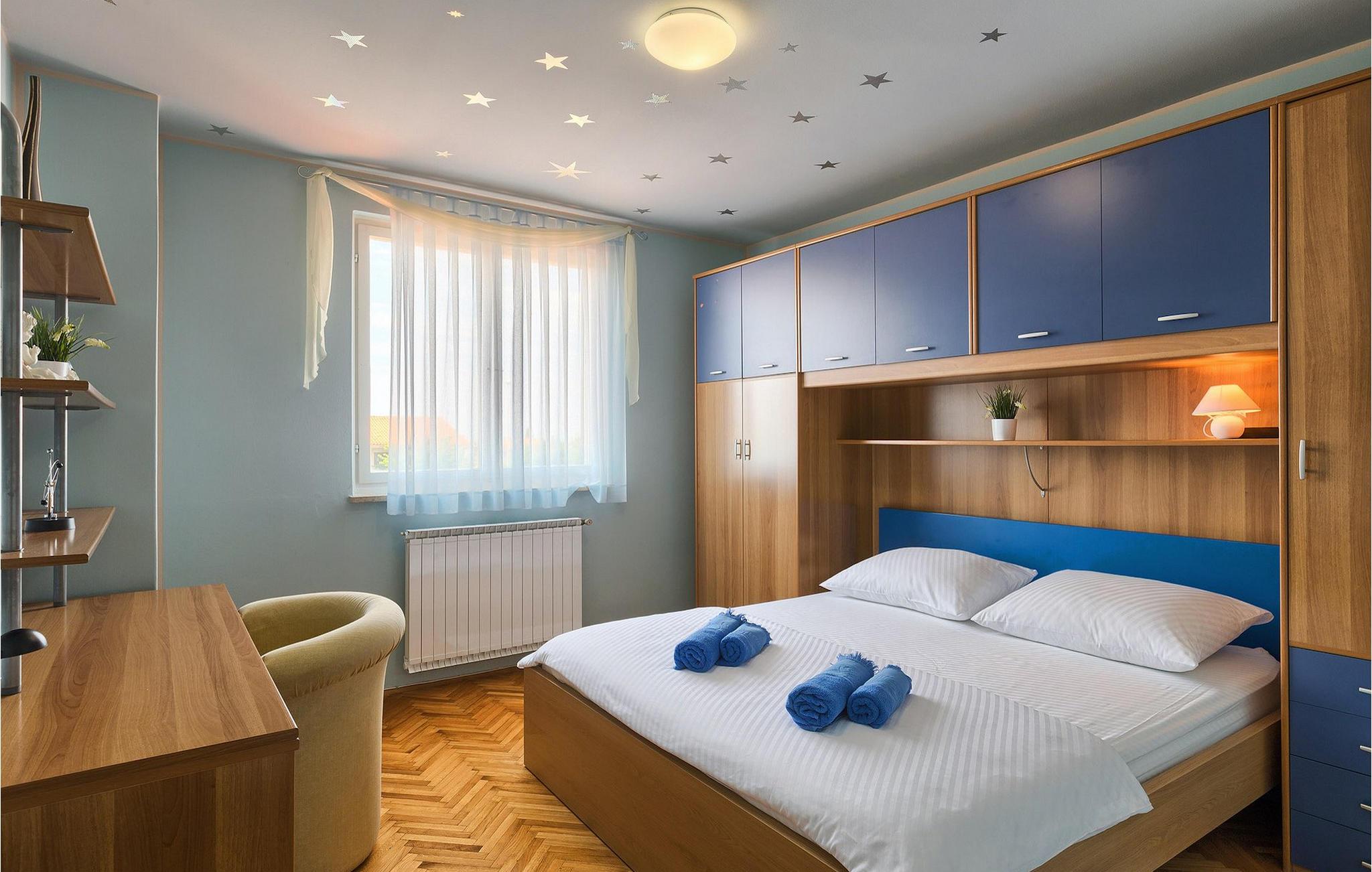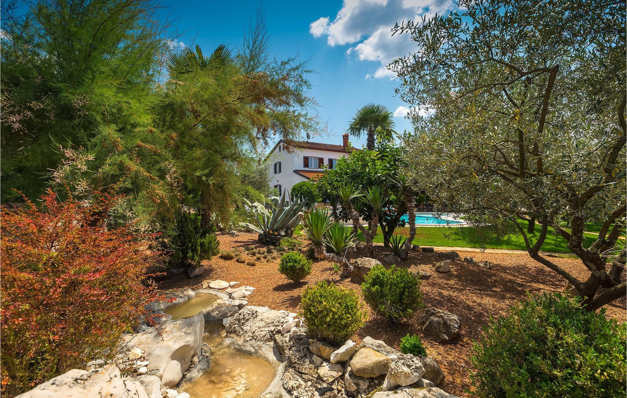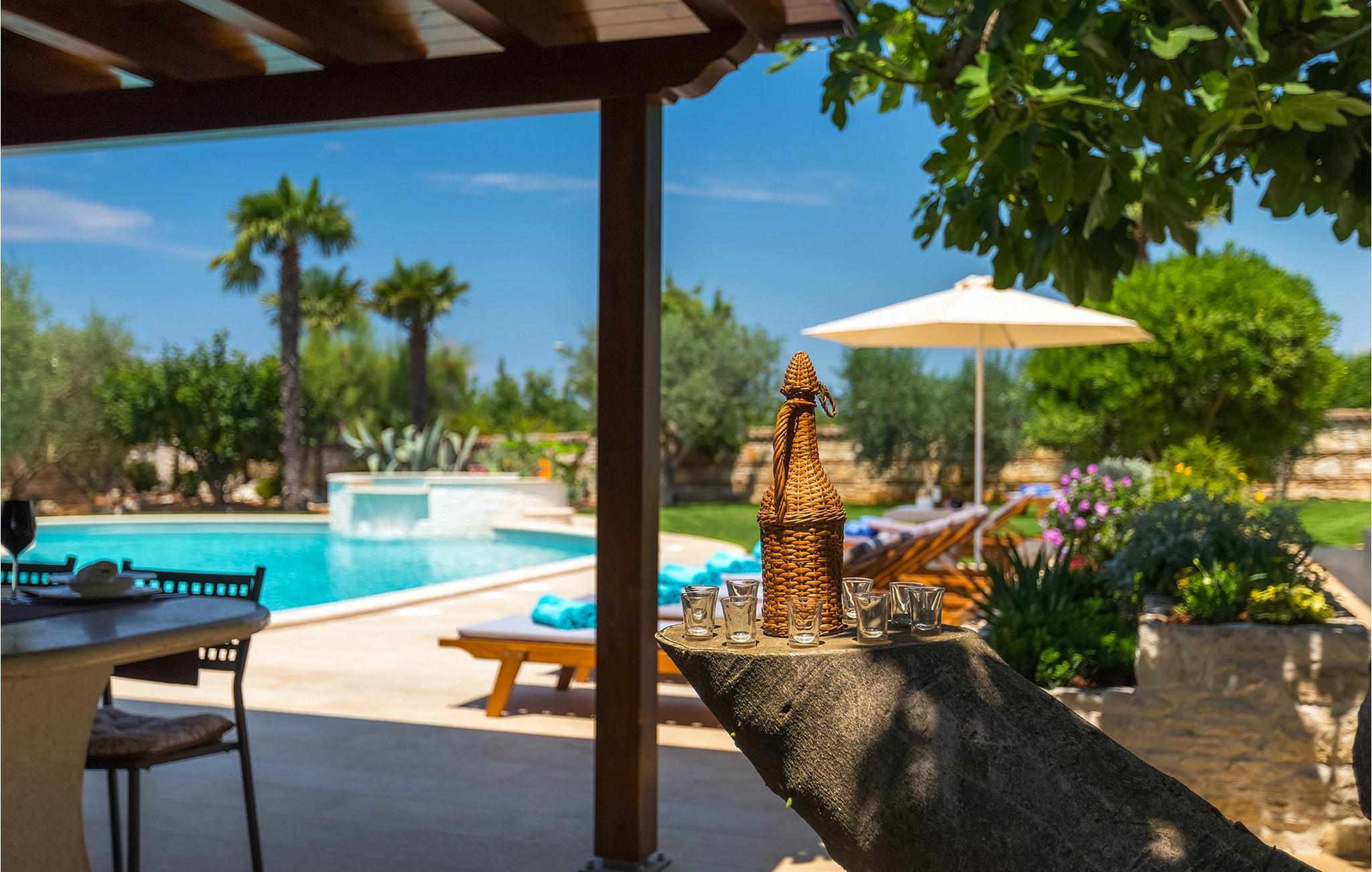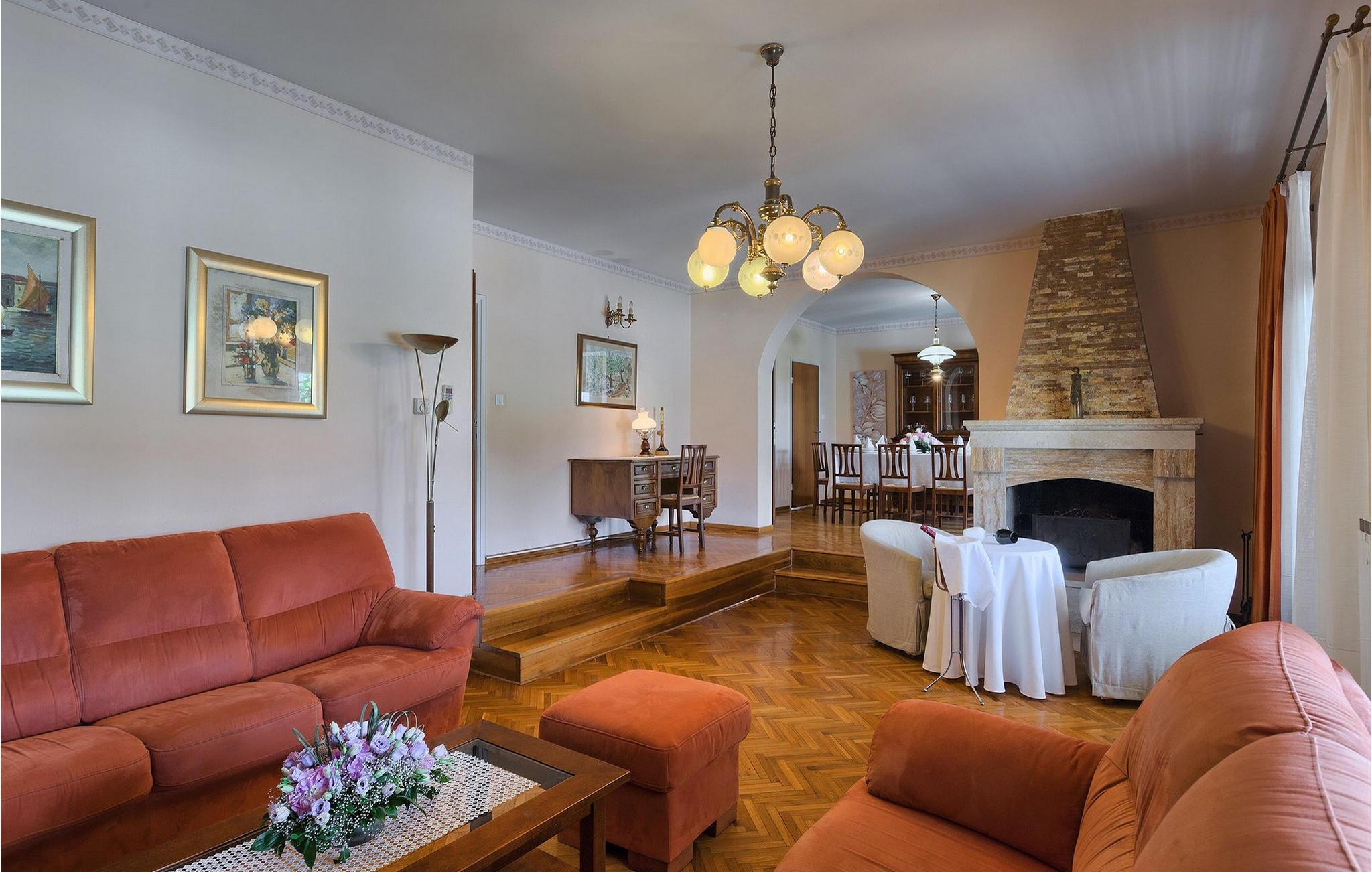 Diese wunderschöne Villa für 10 Personen befindet sich am Rande der schöner Küstenstadt Porec. Gelegen in einer friedlichen Nachbarschaft, Villa David ist die ideale Wahl für Familien, die nach einem Ort suchen, wo sie sich entspannen können und den Alltagsleben vergessen. Der wunderschön gepflegter grüner Garten wird Sie begeistern. Der Garten ist mit Pflanzen und Bäumen erfüllt, die einen besonderen mediterranen Duft verbreiten. Der Höhepunkt des Gartens ist der großer privater Pool mit Hydromassage. Der Pool ist von gemütlichen Liegestühlen umgeben und nur wenige Schritte von der wunderschönen überdachten Terrasse mit Außenküche und Essbereich entfernt, wo Sie Mahlzeiten zubereiten und speisen können. Das Innere der Villa ist schön eingerichtet, sehr hell und geräumig, und besteht aus 5 Schlafzimmern. Drei von ihnen verfügen über ein Doppelbett und zwei bestehen aus zwei Einzelbetten. Es gibt zwei Badezimmer mit jeweils einer Duschkabine. Im Erdgeschoss finden Sie ein Schlafzimmer, das Wohnzimmer, eine völlig ausgestattete Küche und einen Essbereich mit Zugang zur Terrasse mit einer gemütlichen Sitzecke und Tischfußball. Die restlichen vier Zimmer befinden sich im Obergeschoss. Der Balkon mit einem schönen Blick aufs Meer ist der perfekte Ort ist, um jeden Morgen Ihres Urlaubs zu beginnen. Die Villa ist komplett umzäunt, bietet wifi, 4 private Parkplätze und befindet sich in der Nähe aller Annehmlichkeiten, die Sie brauchen und nur eine kurze Fahrt vom nächsten Strand entfernt. Jugendgruppen sind nicht erlaubt.Gelegen im ruhigen Teil von Porec, aber nur eine kurze Fahrt vom Stadtzentrum entfernt, diese Villa ist ideal sowohl für diejenigen, die einen entspannenden Urlaub bevorzugen, als auch für diejenigen, die die Hektik der touristischen Städte mögen. In Porec finden Sie alle Arten von Aktivitäten, Restaurants, Bars und Clubs, aber die Stadt ist vor allem für ihr reiches kulturelles Erbe bekannt. Porec, früher eine römische Kolonie, erreichte seinen Höhepunkt während der Herrschaft des byzantinischen Kaiser Justinian. Die atemberaubende Euphrasius Basilika, unter dem UNESCO- Schutz, ist der beste Beweis dafür, wie glorreich diese Epoche war. Interessensgebiete sind die mittelalterlichen Städte Motovun und Groznjan sowie die Küstenstädte Rovinj und Vrsar. Etwas weiter entfernt, die Brijuni-Inseln, das römische Amphitheater in Pula und Venedig sind von dieser Region leicht erreichbar.