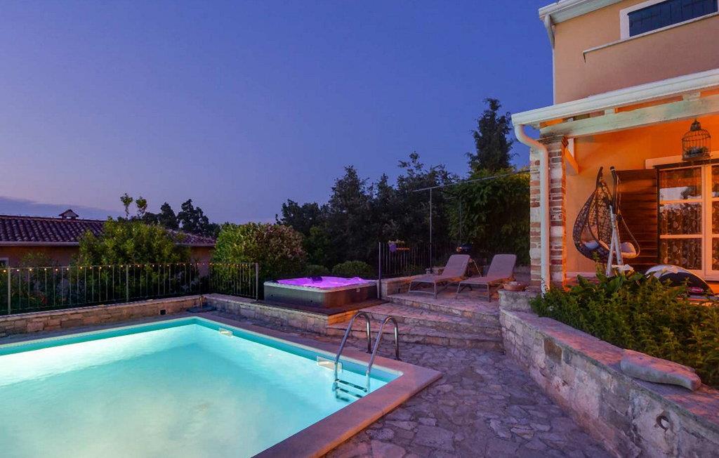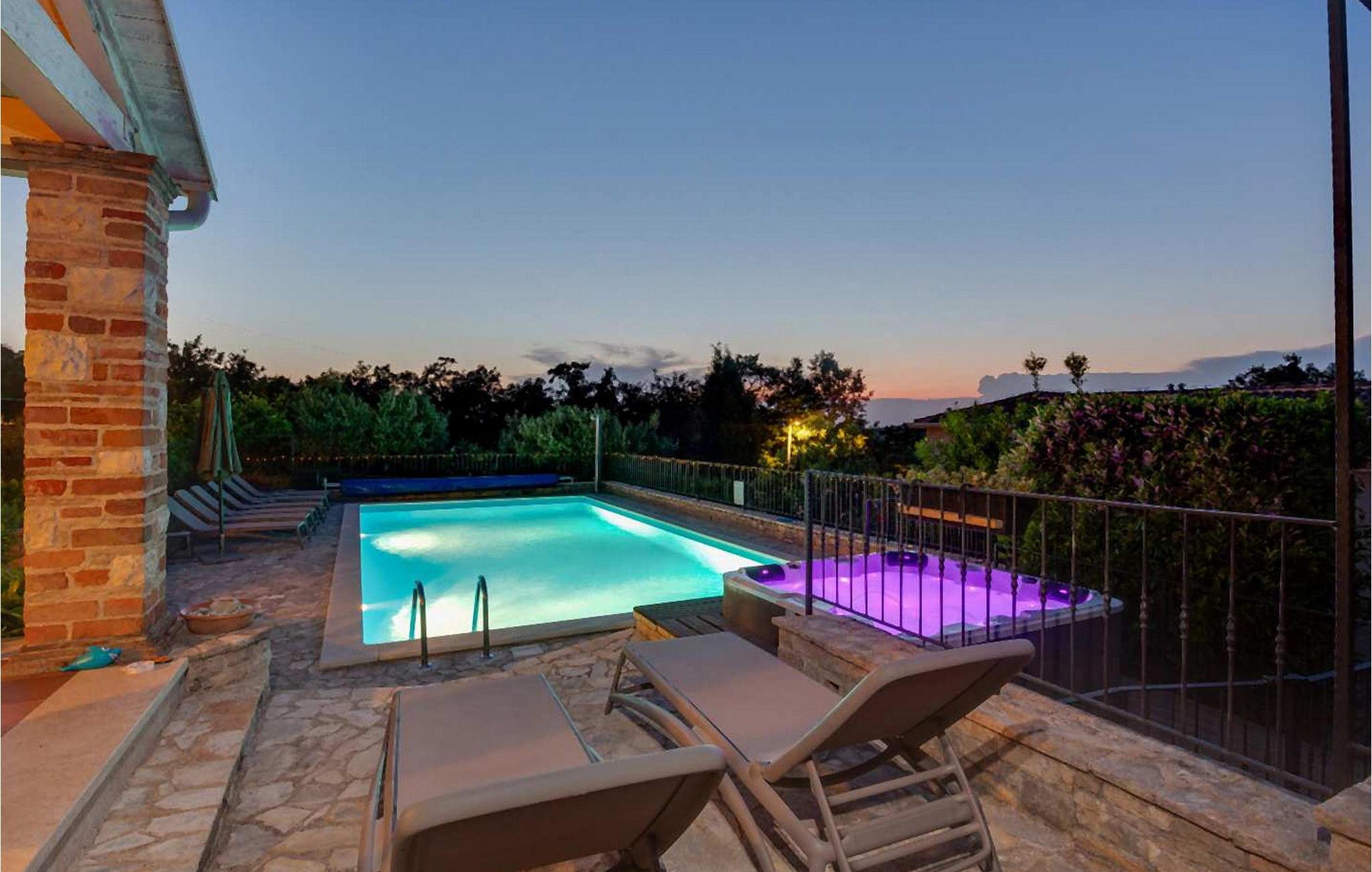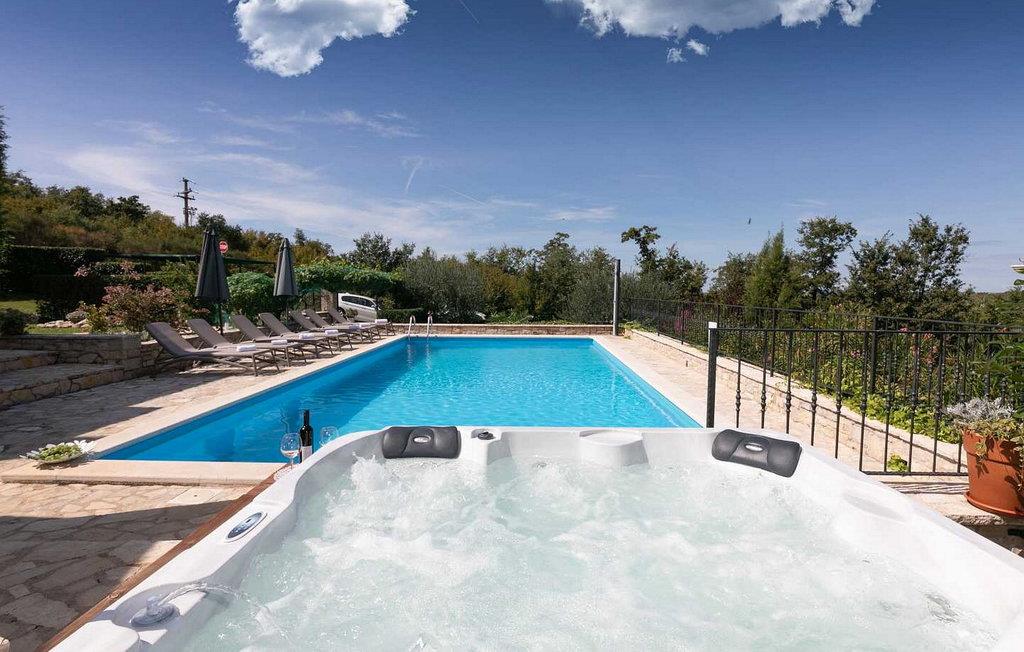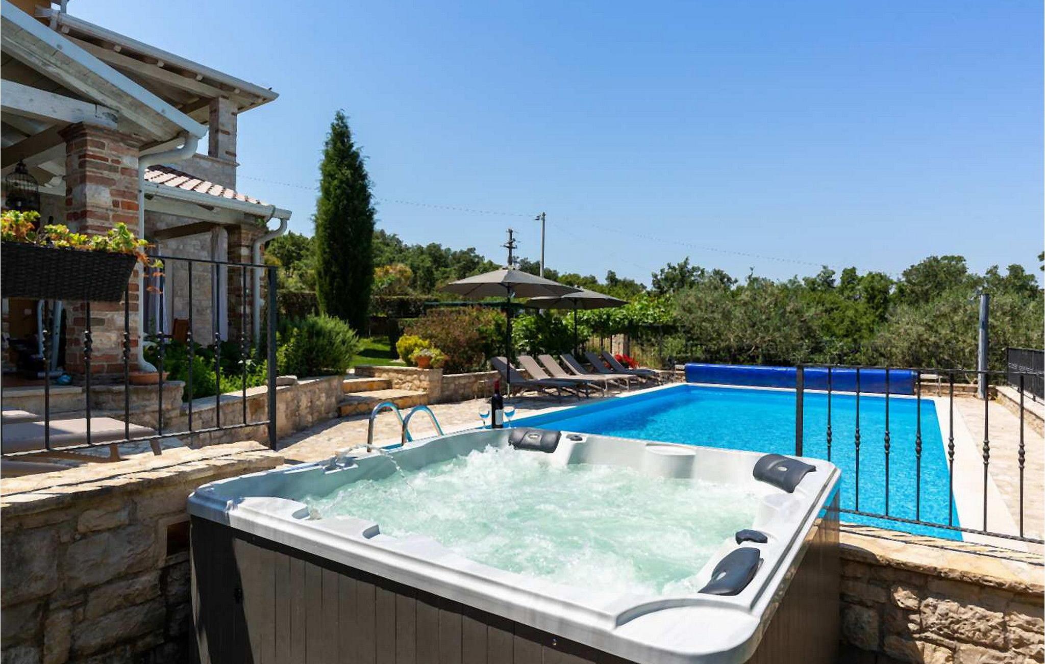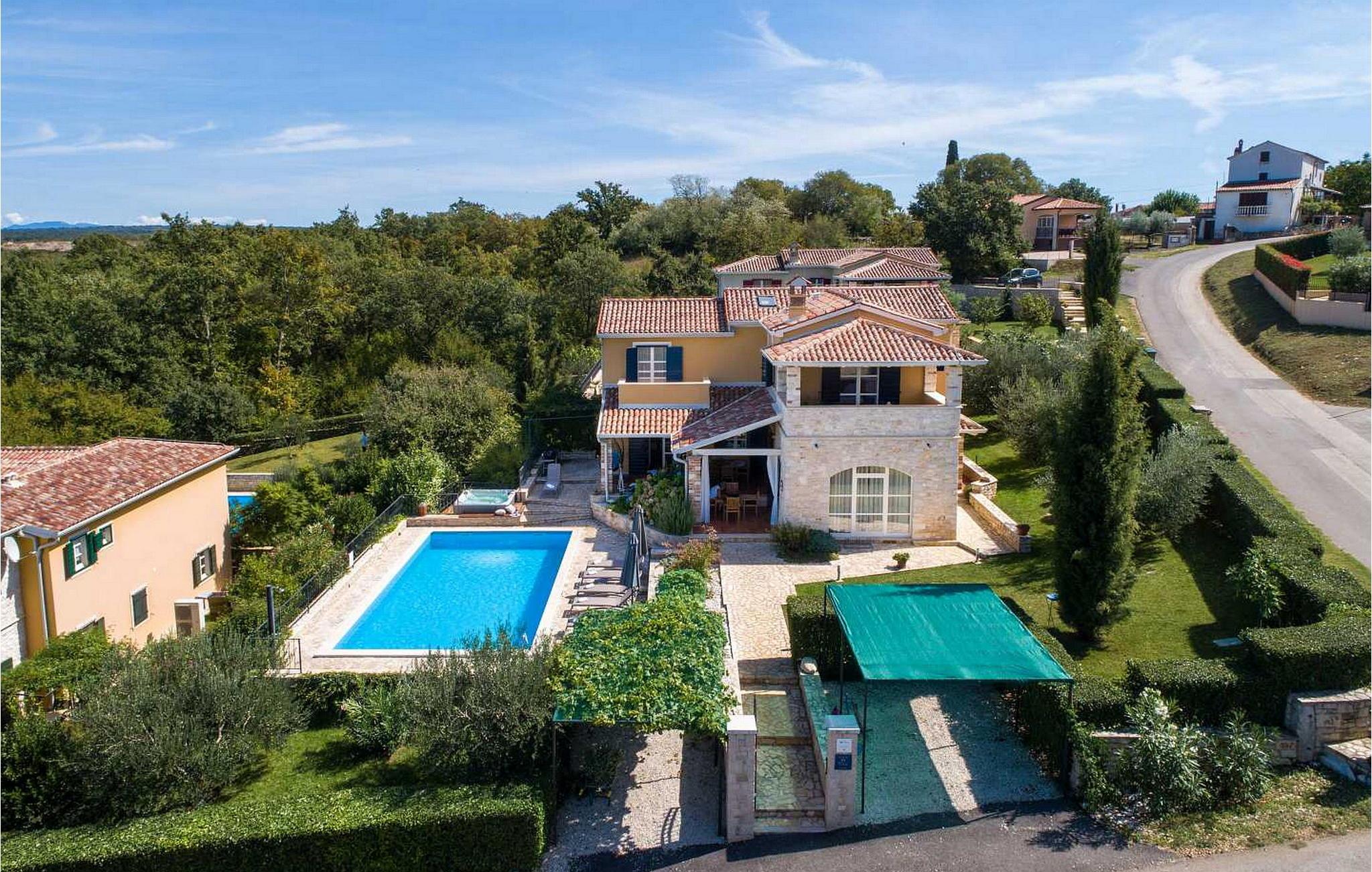 Villa Salvea er en nybygget luksuriøs rustik villa beliggende i udkanten af landsbyen Montizana med en dejlig panoramaudsigt over markerne og havet. Landsbyen ligger 10 km fra Porec og dens strande. Huset blev bygget i år 2014, det er fuldt airconditioneret og indrettet med attraktive rustikke møbler. På den lukkede grund på 1.000 kvm er der en udendørs swimmingpool på 50 kvm, et spabad, overdækket terrasse med spisefaciliteter og grill, velholdt græsplæne og to parkeringspladser. Villaen har et boligareal på 197 kvm. I stueetagen er der en dejlig stue med pejs med to masser af terrassedøre, der fører til terrassen, et fuldt udstyret køkken med spisebord og udgang til terrassen og haven, et soveværelse for to med dobbeltseng og en-suite bruser /toilet. På 1. sal er der tre soveværelser til to, to af dem med dobbeltseng og terrasse, og et med to enkeltsenge. Bemærk venligst, at denne ejendom ikke accepterer ungdomsgrupper eller polterabends. En ungdomsgruppe på denne ejendom er en gruppe bestående af personer på 26 år eller derunder. Book ikke denne ejendom, hvis du er en ungdomsgruppe eller et polterabend, da din reservation vil blive afvist efter booking, hvilket kan omfatte ved ankomst til ejendommen eller under dit ophold, og du vil ikke blive refunderet.