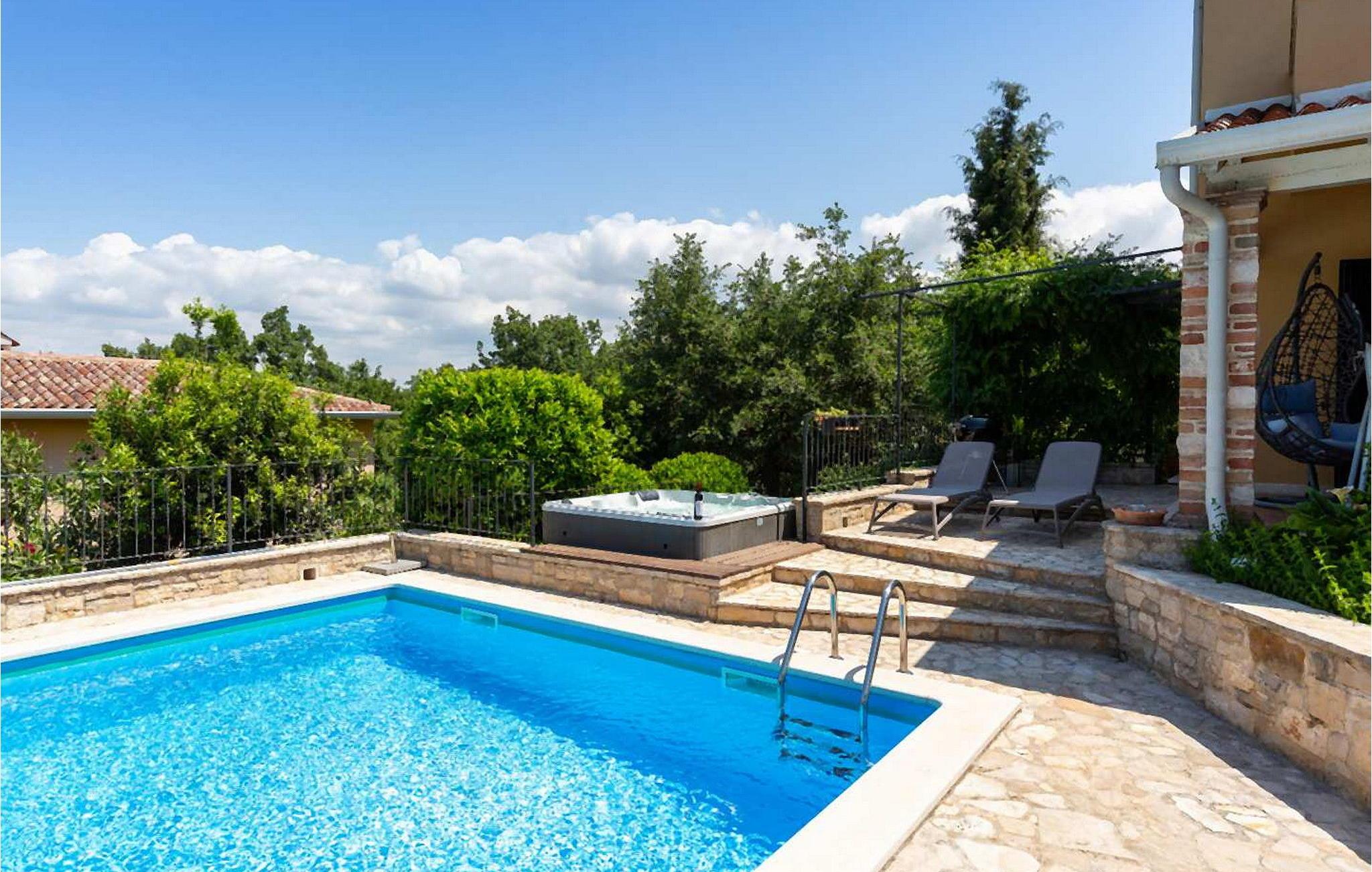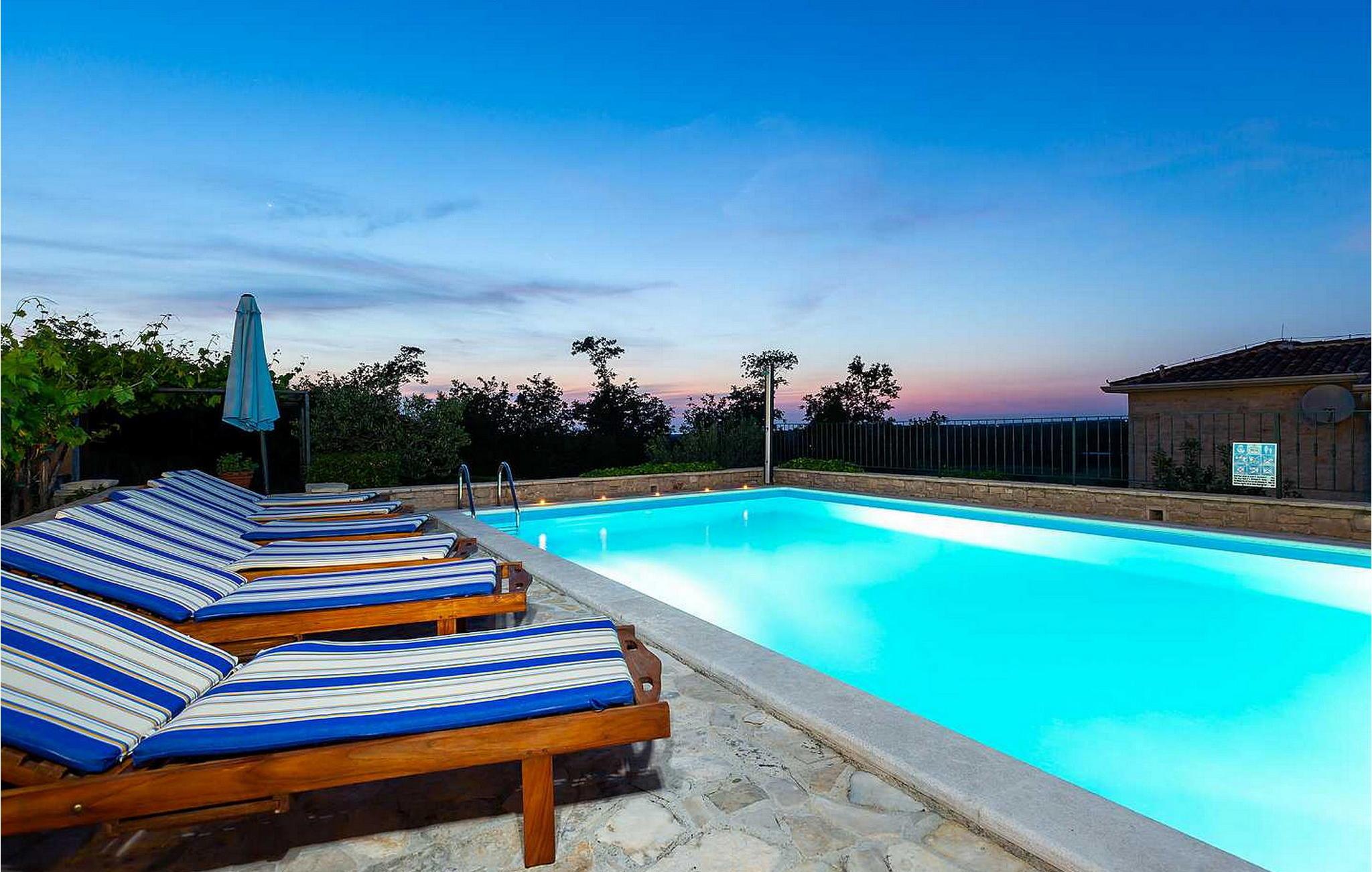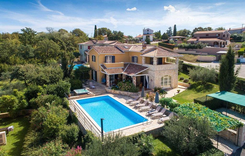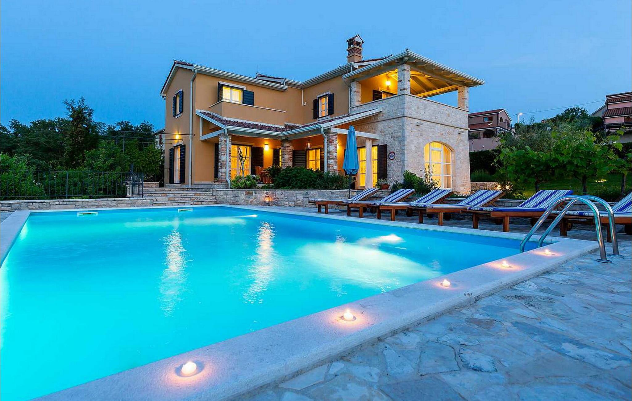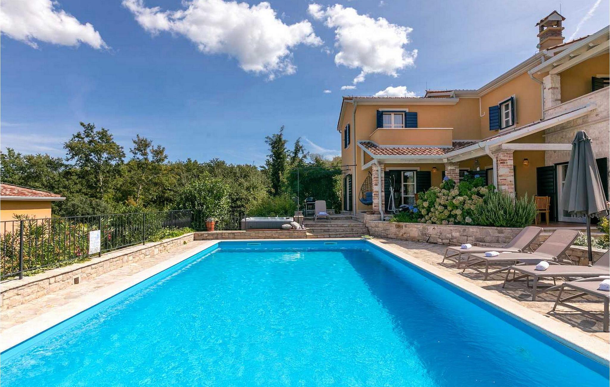 Villa Salvea er en nybygget luksuriøs rustik villa beliggende i udkanten af landsbyen Montizana med en dejlig panoramaudsigt over markerne og havet. Landsbyen ligger 10 km fra Porec og dens strande. Huset blev bygget i år 2014, det er fuldt airconditioneret og indrettet med attraktive rustikke møbler. På den lukkede grund på 1.000 kvm er der en udendørs swimmingpool på 50 kvm, et spabad, overdækket terrasse med spisefaciliteter og grill, velholdt græsplæne og to parkeringspladser. Villaen har et boligareal på 197 kvm. I stueetagen er der en dejlig stue med pejs med to masser af terrassedøre, der fører til terrassen, et fuldt udstyret køkken med spisebord og udgang til terrassen og haven, et soveværelse for to med dobbeltseng og en-suite bruser /toilet. På 1. sal er der tre soveværelser til to, to af dem med dobbeltseng og terrasse, og et med to enkeltsenge. Bemærk venligst, at denne ejendom ikke accepterer ungdomsgrupper eller polterabends. En ungdomsgruppe på denne ejendom er en gruppe bestående af personer på 26 år eller derunder. Book ikke denne ejendom, hvis du er en ungdomsgruppe eller et polterabend, da din reservation vil blive afvist efter booking, hvilket kan omfatte ved ankomst til ejendommen eller under dit ophold, og du vil ikke blive refunderet.