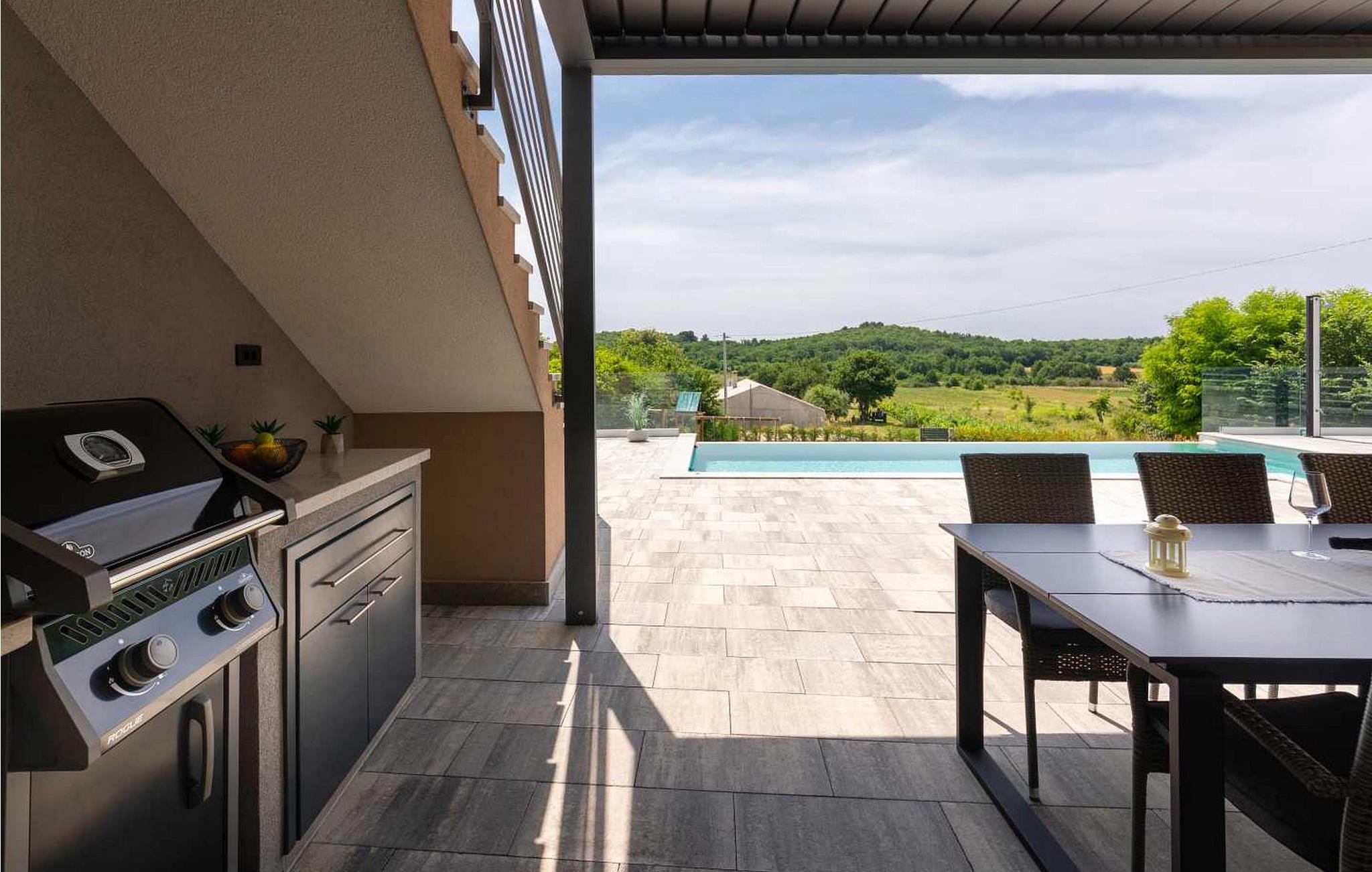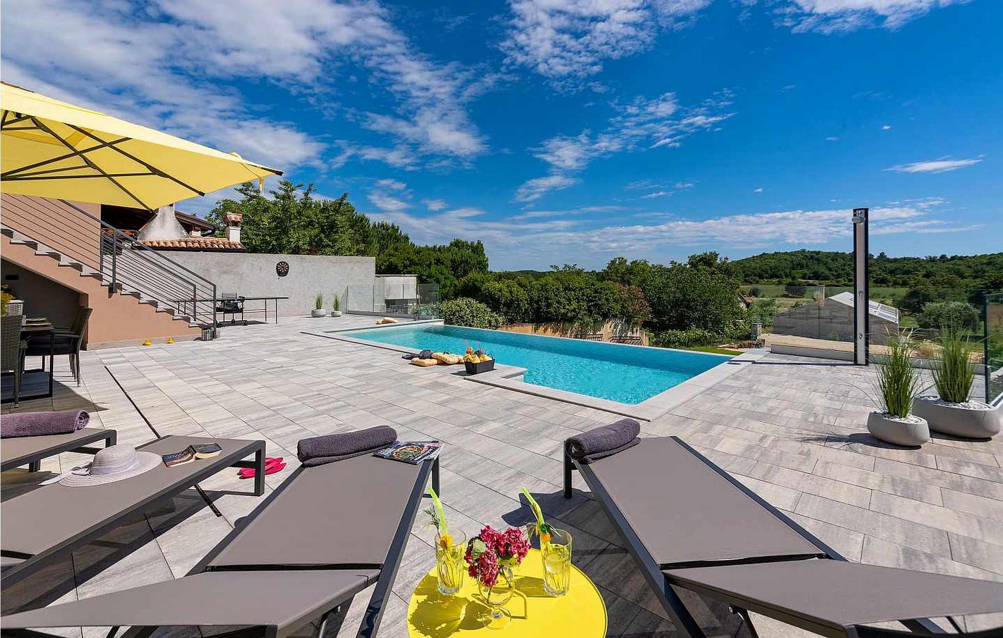 Velkommen til den imponerende Villa Sunnyside i udkanten af ??den idylliske landsby Dracevac. Dette moderne feriehus kombinerer moderne komfort med et strejf af historie, hvilket skaber en unik atmosfære. Den omhyggeligt designede vinkælder, som blev skabt af en gammel cisterne, giver boligen sin særlige charme. På den private ejendom kan I nyde fred og afslapning. Dyk ned i infinity-poolen, solbad på det rummelige solbadningsområde eller tilbring hyggelige timer ved grillen. Den udendørs spiseplads lægger op til at nyde kulinariske aftener under den istriske stjernehimmel.