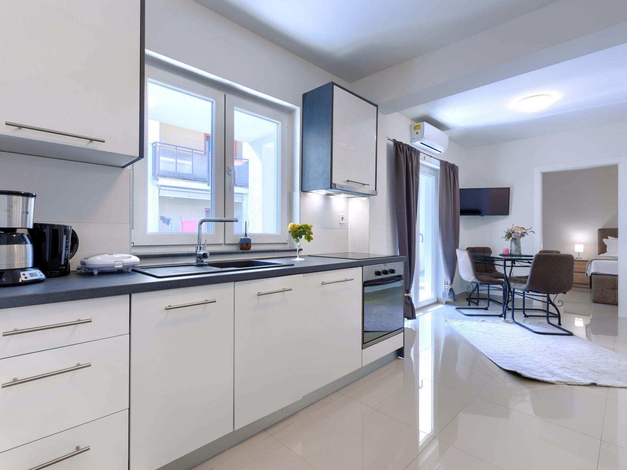 "Amra 5", 3-room apartment 40 m2, on the upper floor. Cosy furnishings: living/dining room with 1 sofabed (120 cm, length 200 cm), satellite TV and air conditioning. Exit to the terrace. 1 room with 1 sofabed (120 cm, length 190 cm). 1 room with 1 french bed (160 cm, length 200 cm). Open kitchen (oven, dishwasher, 4 ceramic glass hob hotplates, toaster, kettle, electric coffee machine). Shower/WC. Forced-air heating. Terrace 12 m2, roofed. Facilities: washing machine, iron, hair dryer. Internet (WiFi, free). Parking (1 car) at the house.