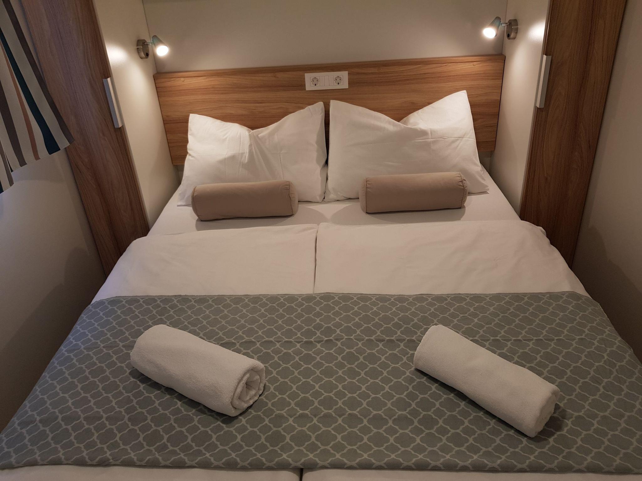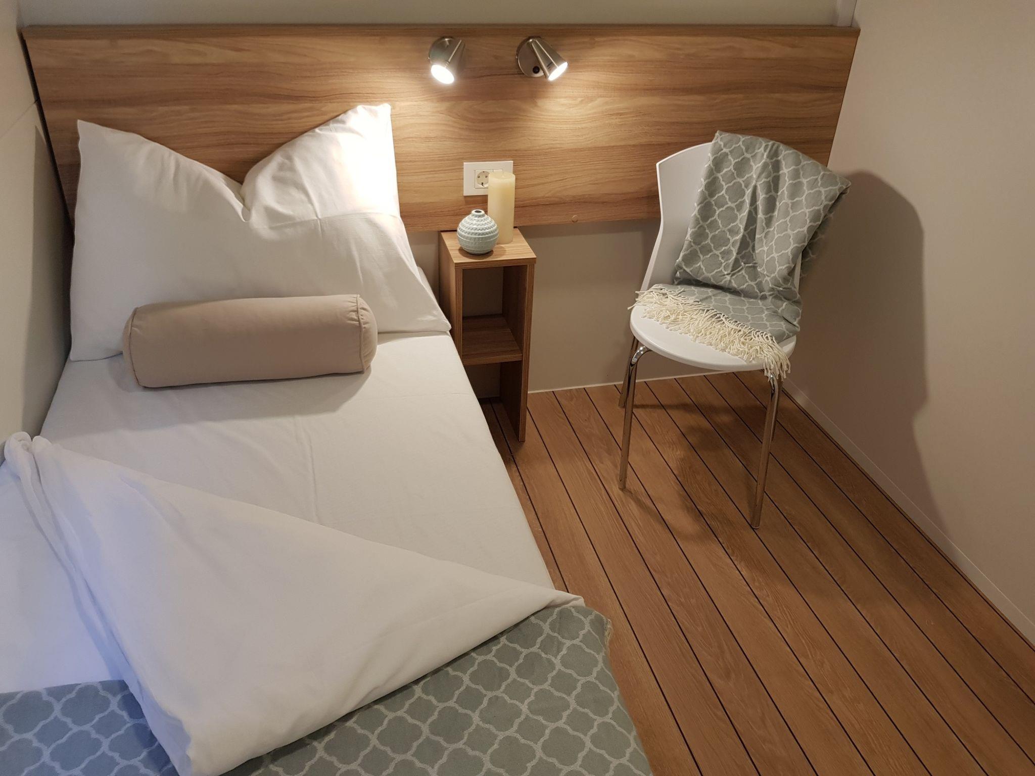 4-room mobile home 32 m2. Living/dining room with satellite TV and air conditioning. Exit to the terrace. 1 room with 1 french bed (1 x 160 cm, length 200 cm). 2 rooms, each room with 2 beds (80 cm, length 200 cm). Open kitchen (2 hot plates, 2 gas rings, kettle, microwave, freezer, electric coffee machine). Shower/WC, sep. WC. Terrace 15 m2. Terrace furniture, deck chairs (2). Facilities: children's high chair (extra). Internet (WiFi, free). Please note: non-smoking house. The property is one of a type of property or apartment. The mobile homes are situated 500 - 550 m from the sea and the beach. Parking for 1 car by the mobile home (incl.), parking for 2nd car to be paid extra.