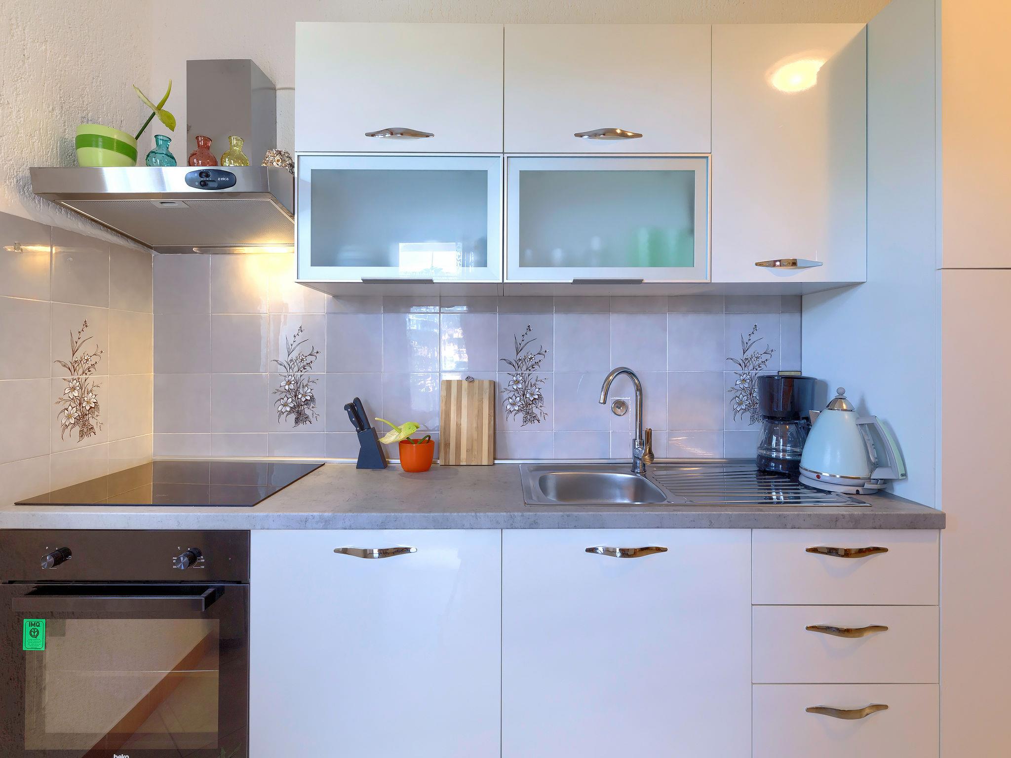 2-room apartment 40 m2 on 1st floor. Living/dining room with satellite TV (flat screen). Exit to the terrace. 1 room with 1 double bed (2 x 90 cm, length 200 cm), air conditioning. Open kitchen (oven, dishwasher, 4 ceramic glass hob hotplates, kettle, microwave, electric coffee machine). Shower/WC. No heating option. Terrace 12 m2 partly roofed. Terrace furniture. Facilities: Internet (WiFi, free).