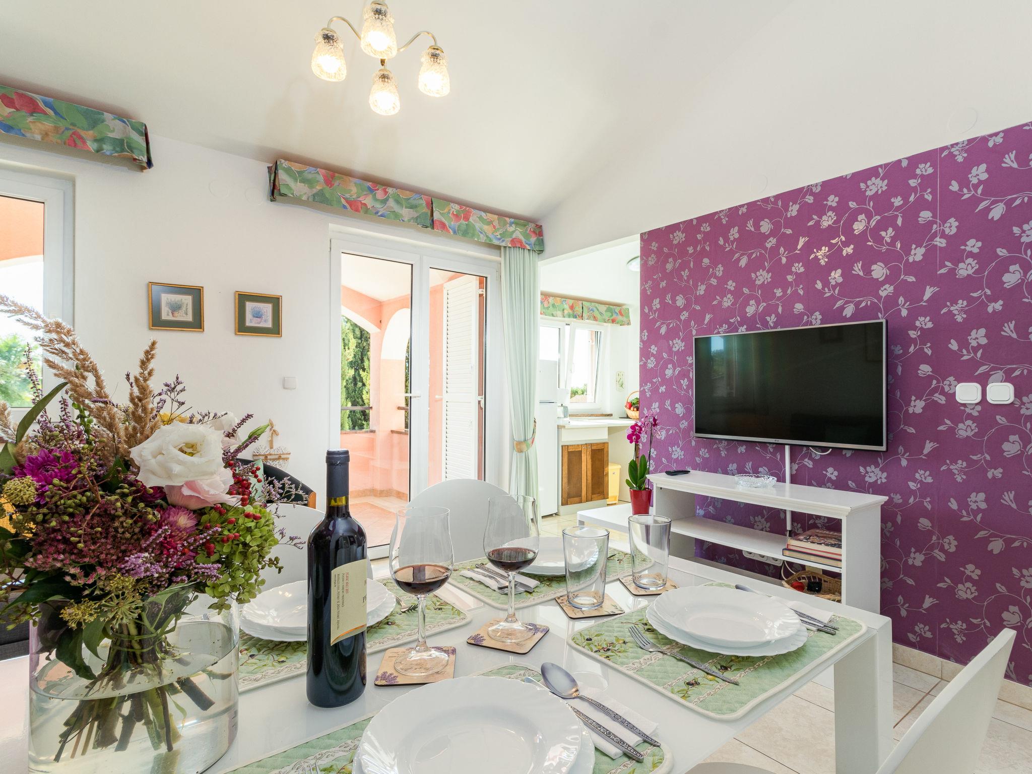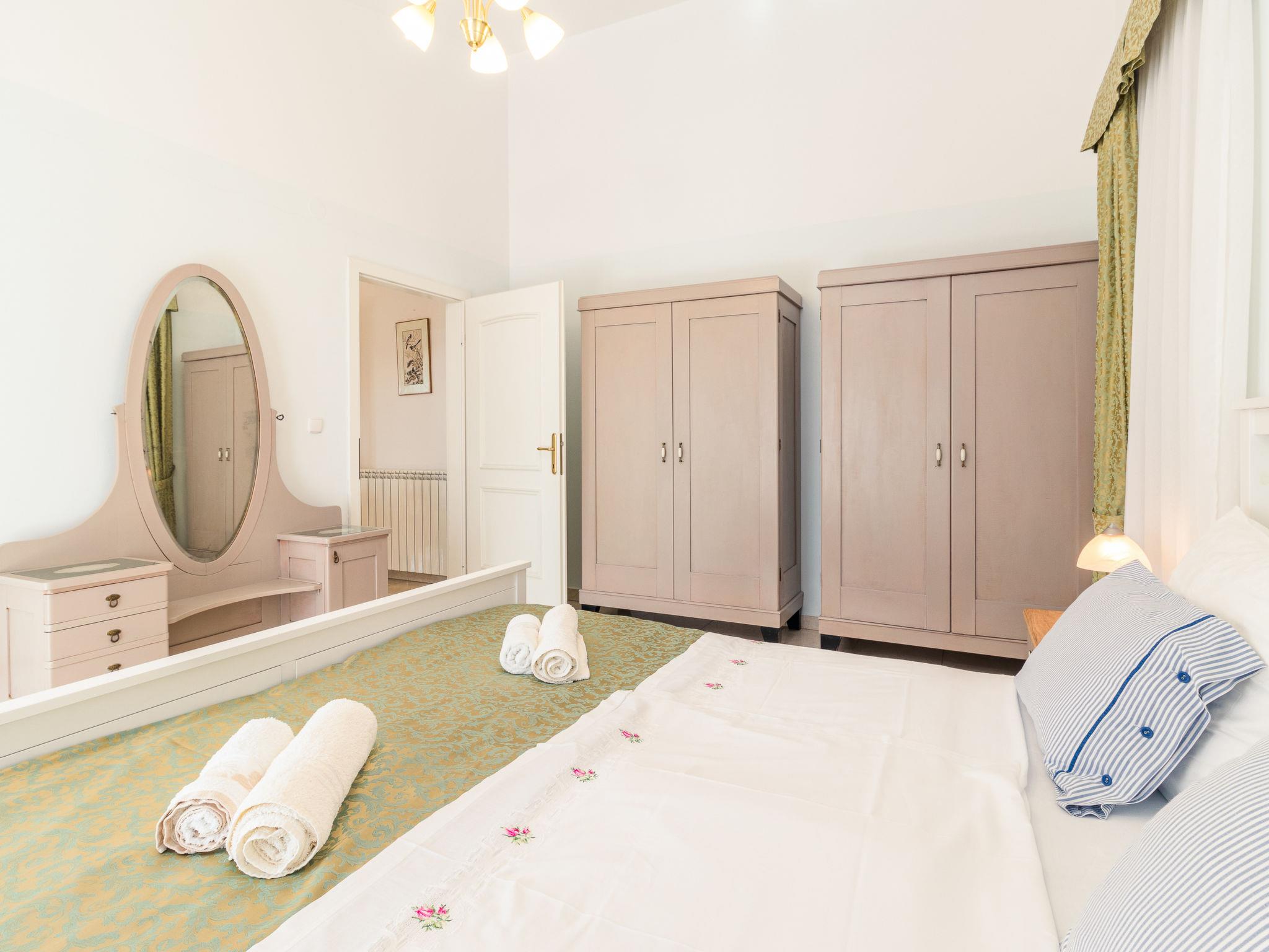 "Viktorija", 2-room apartment 48 m2 on 1st floor. Living/dining room with 1 double sofabed (180 cm, length 200 cm), satellite TV and air conditioning. Exit to the terrace. 1 room with 1 double bed. Exit to the terrace. Open kitchen (4 ceramic glass hob hotplates, toaster, kettle, microwave, electric coffee machine). Bath/bidet/WC. Heating. Terrace 20 m2. Terrace furniture. Facilities: Internet (WiFi, free). Please note: non-smoking house. Maximum 1 pet/ dog allowed.