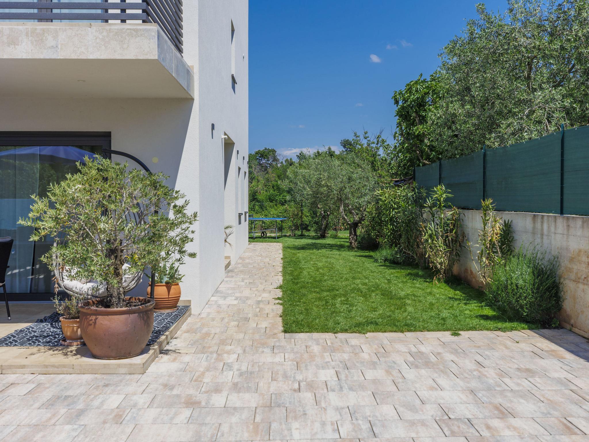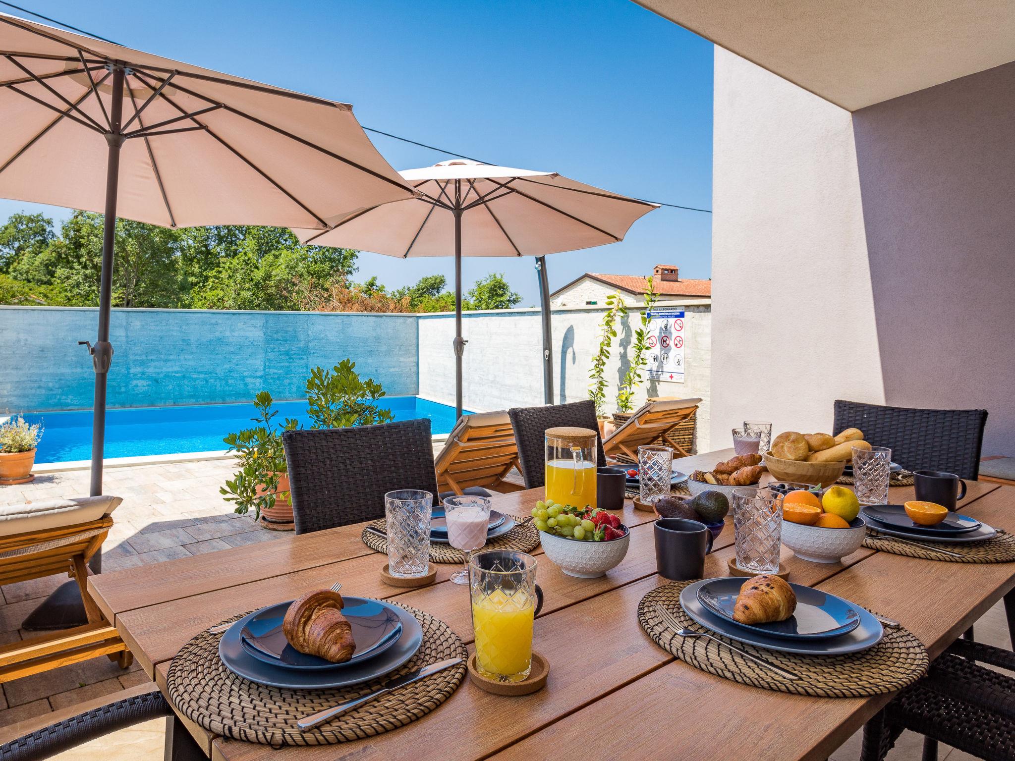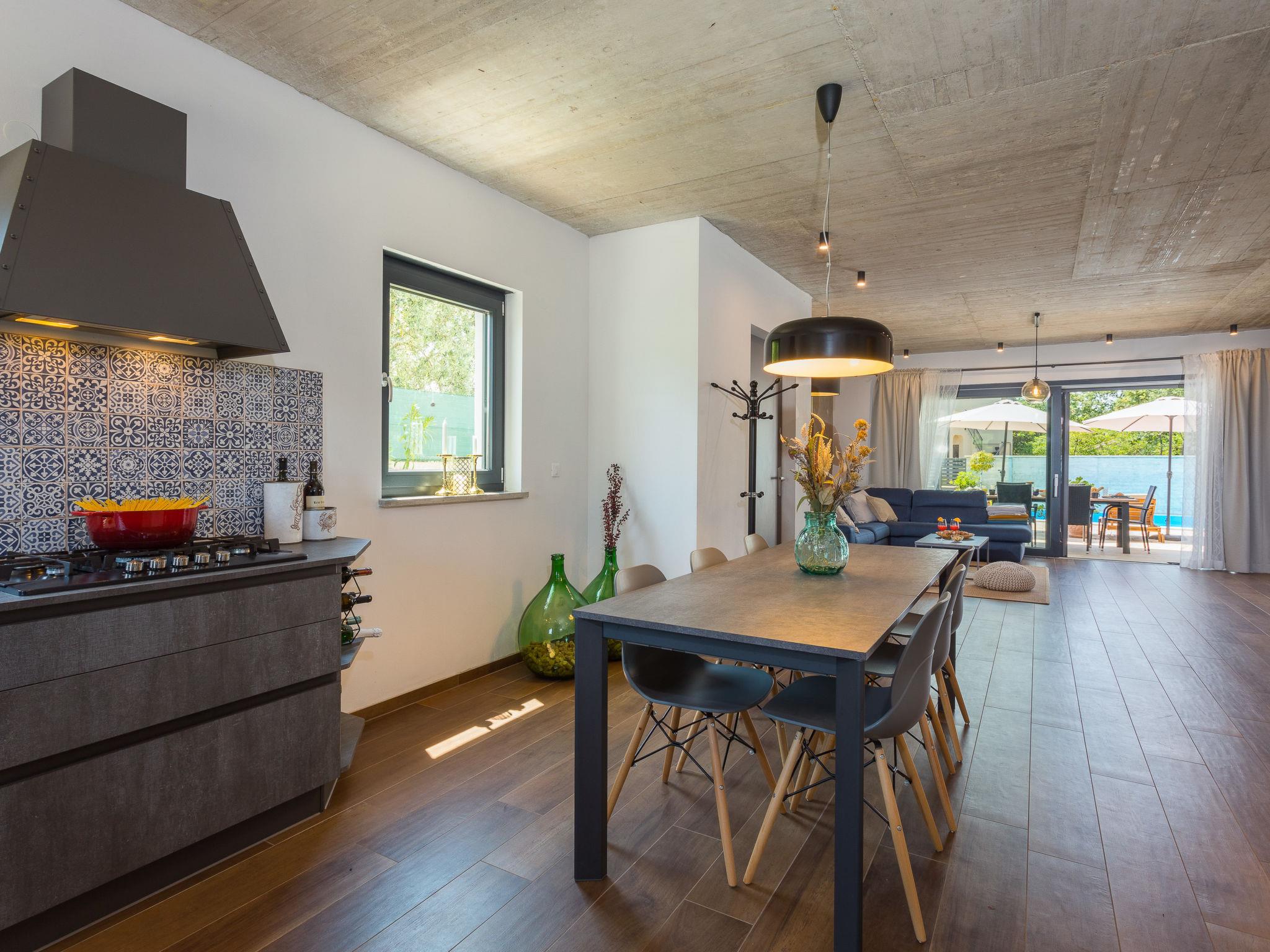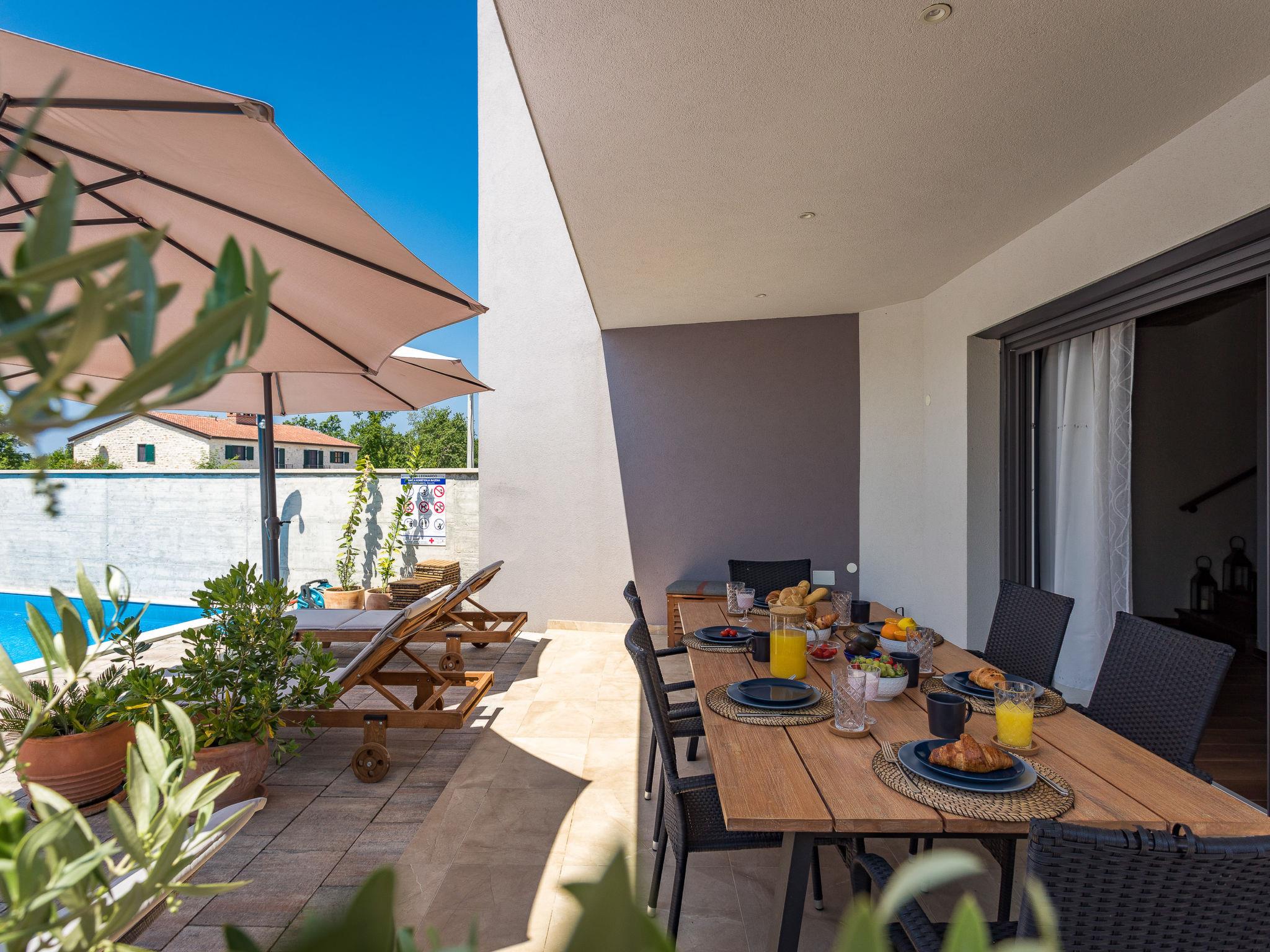 Semi-detached house "Villa Leonardo", 2 storeys, built in 2019. In the hamlet Vežnaveri 4 km from the centre of Porec, 2 km from the centre of Nova Vas, 50 km from the centre of Pula, 4 km from the sea, 4 km from the beach. Private: property 250 m2 (fenced) with lawn, swimming pool (6 x 4 m, depth 150 cm, seasonal availability: 01.May. - 01.Oct.). Outdoor shower, terrace, pool maintenance by the owner/gardener. In the house: internet access, washing machine. Parking (for 2 cars) on the premises. Shop 2 km, supermarket 3 km, bus stop 6 km, pebble beach 4 km, rocky beach 4 km.