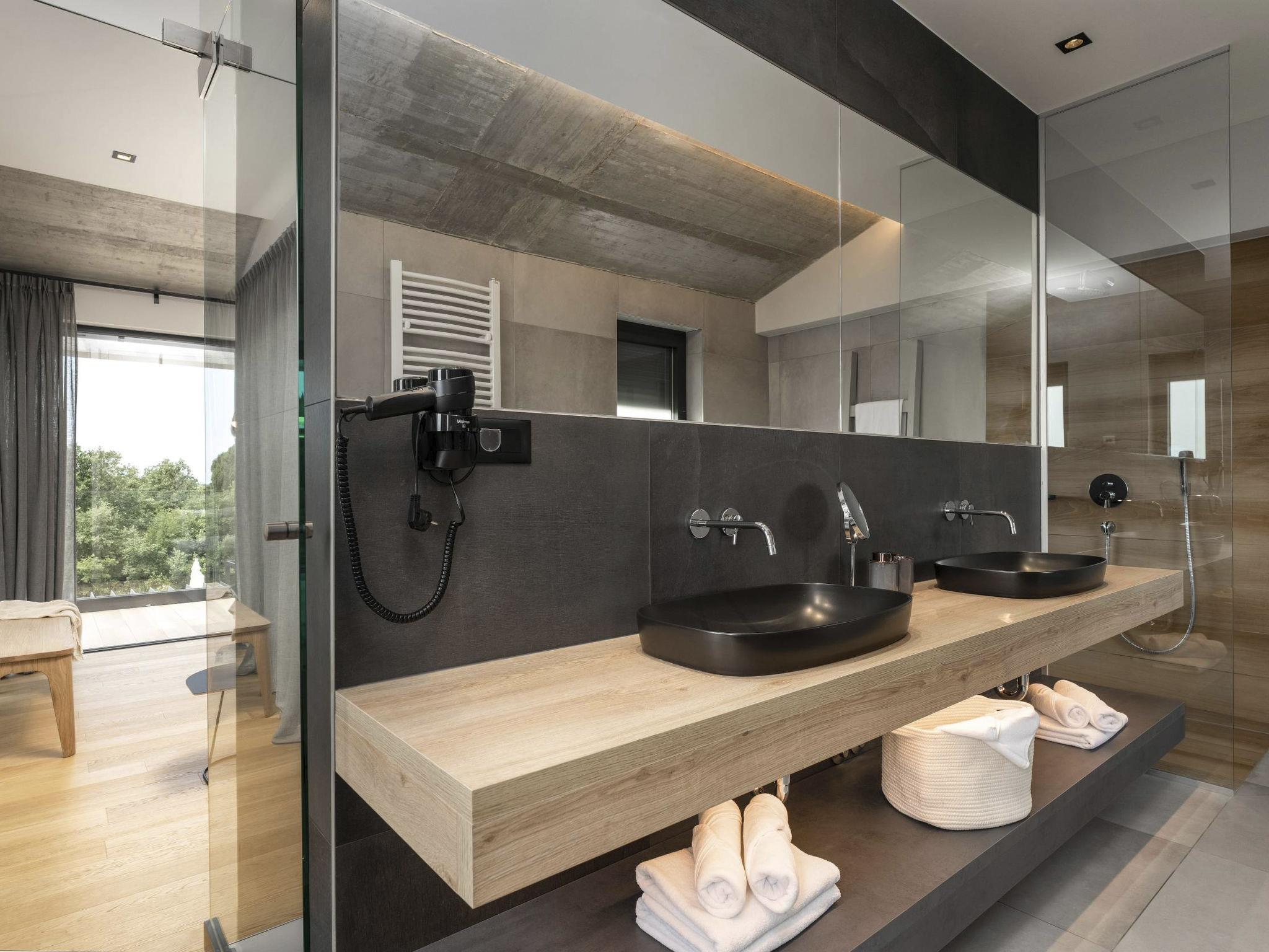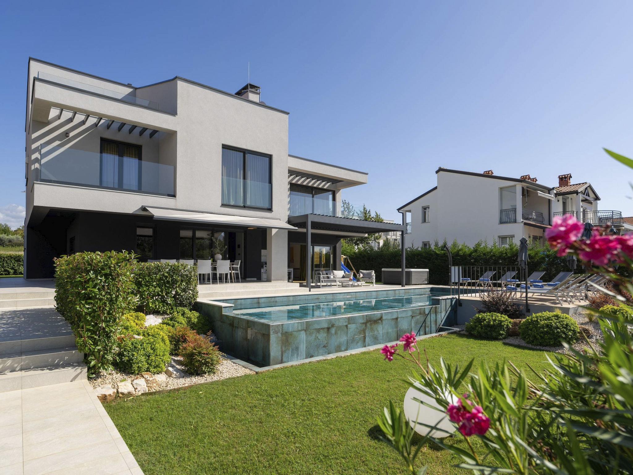 On the fenced and well-kept plot of 950 m² there is a 40 m² infinity pool with a hydromassage corner, jacuzzi, 10 sun loungers, three parasols, an outdoor kitchen with gas barbecue and fridge, a covered terrace with seating and a dining table, children's playground, table tennis and 3 parking spaces.