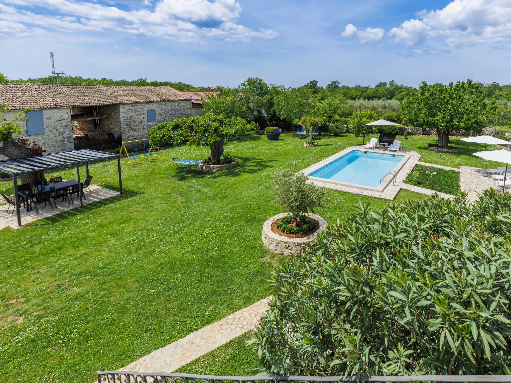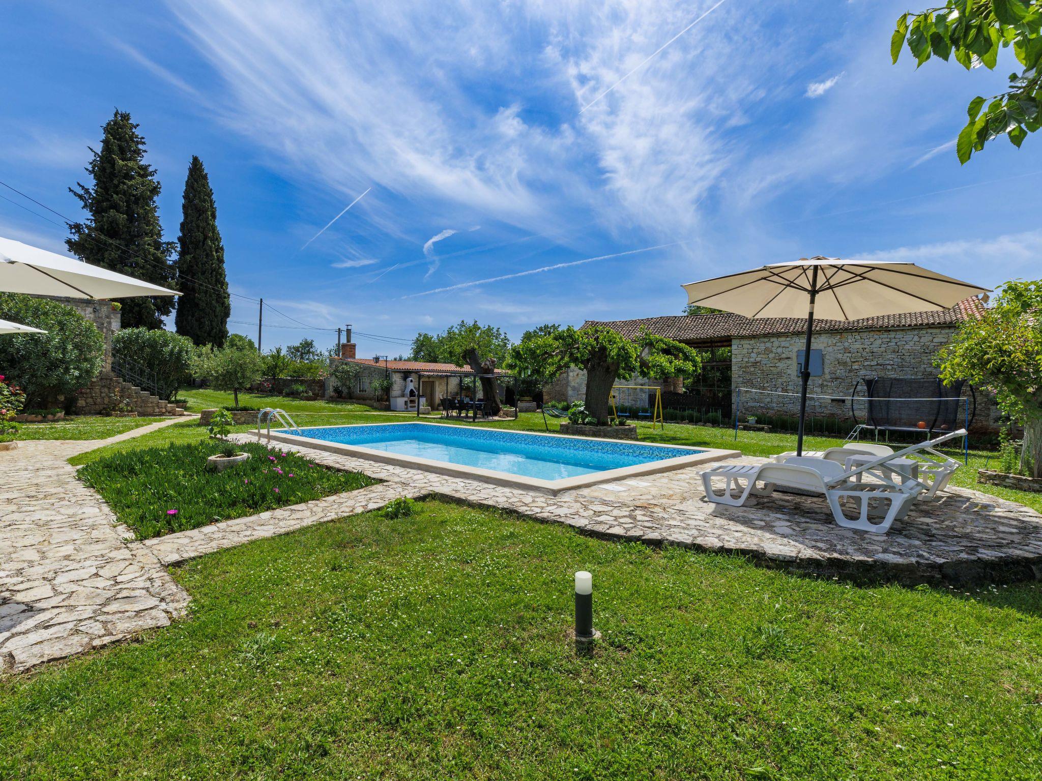 Single-family house "Graziela", 2 storeys. 1 km from the centre of Sveti Lovrec, on the outskirts, 12 km from the centre of Porec, 5 km from the sea. Private: property 1'500 m2 (fenced) with lawn and trees, swimming pool angular (8 x 4 m, depth 150 cm, seasonal availability: 02.May. - 31.Oct.). Outdoor shower, table tennis, volleyball, terrace (20 m2), garden furniture, barbecue (swing). In the house: internet access, trampoline, washing machine. Parking (for 3 cars) on the premises. Shop 1 km, restaurant 1 km, bus stop 4.7 km, pebble beach 12 km. 2nd floor is closed and not occupied.