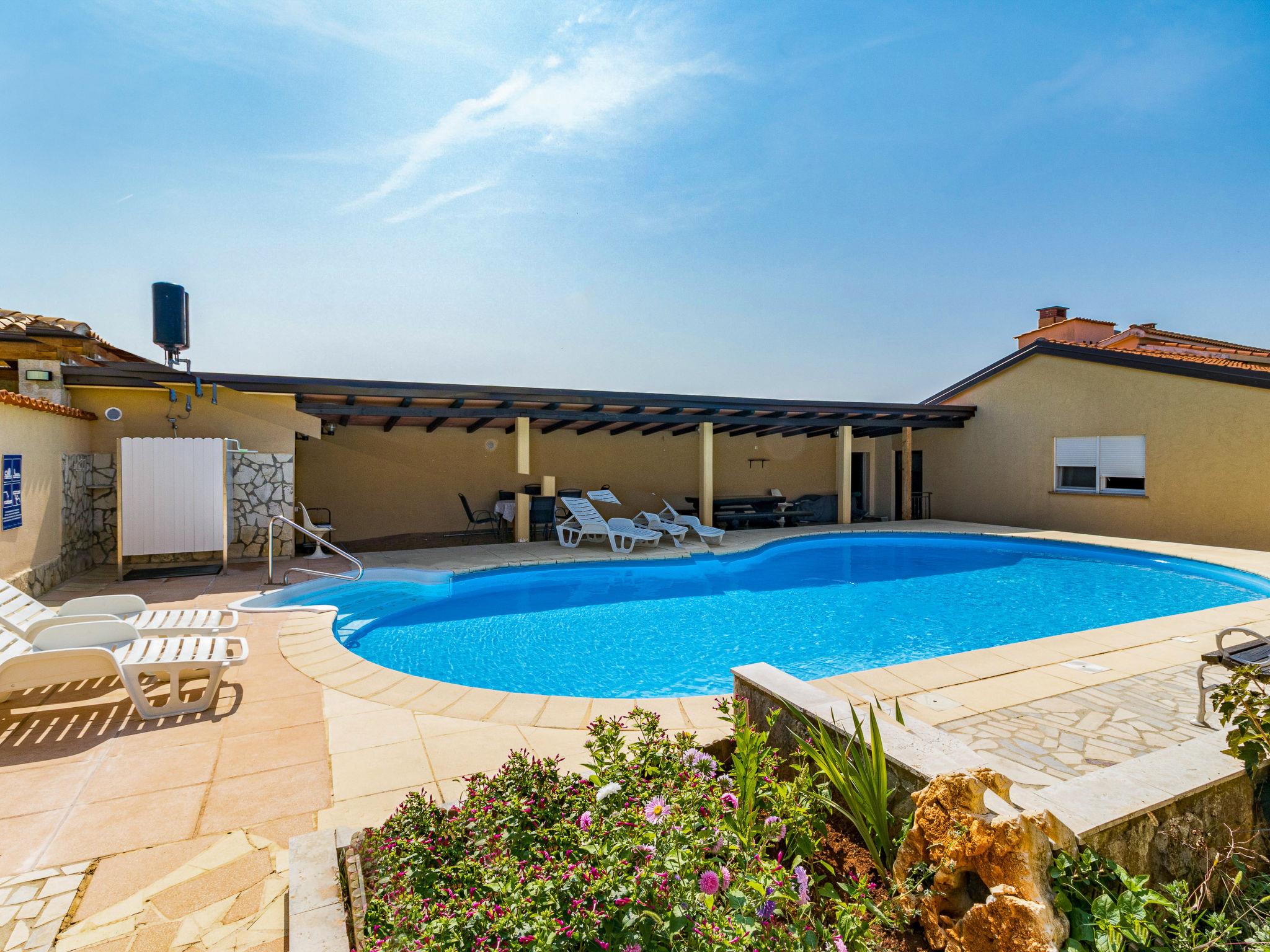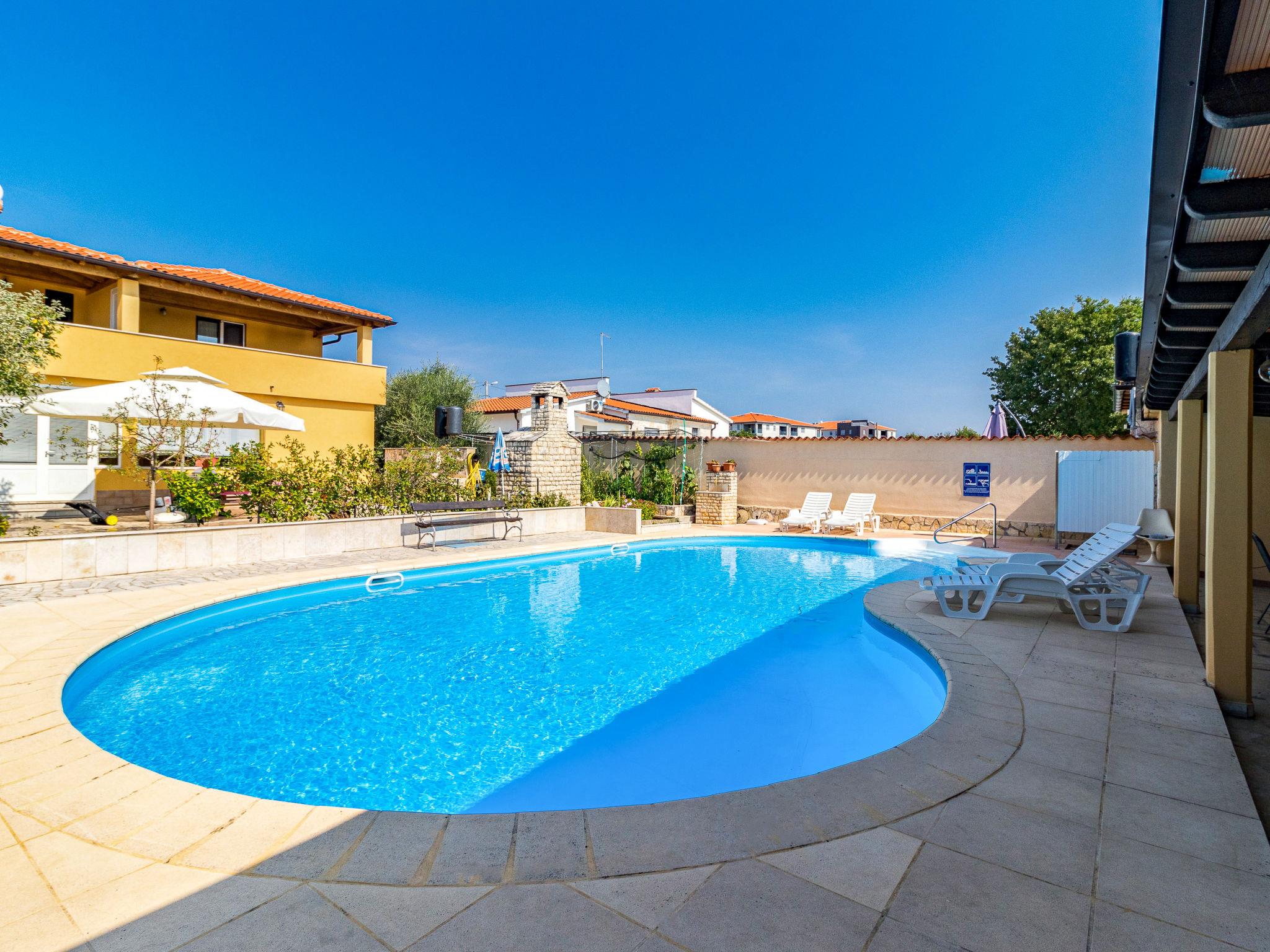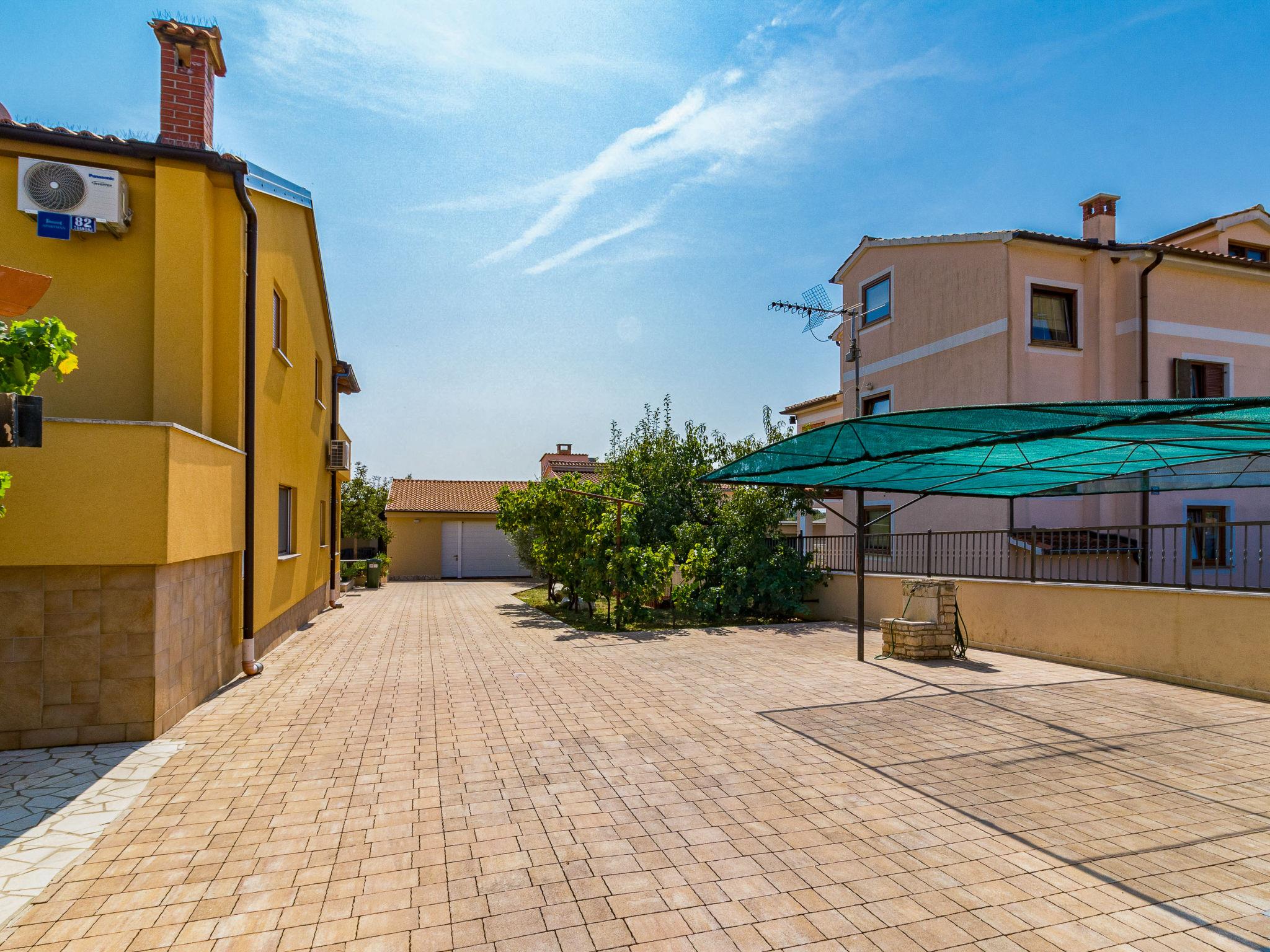 Žbandaj: 3-family house "Dika". 300 m from the centre of Žbandaj, 8 km from the centre of Porec, 8 km from the sea. For shared use: property 1'000 m2 (fenced) with plants and trees, swimming pool (12 x 6 m, depth 100 - 160 cm, seasonal availability: 01.Jun. - 30.Sep.) with internal staircase. Outdoor shower, garden furniture, barbecue, pool maintenance by the owner/gardener. In the house: washing machine (for shared use, extra). Parking at the house on the premises. Shop 300 m, supermarket 1 km, restaurant 200 m, bus stop 8 km, railway station 24 km, pebble beach 8 km.