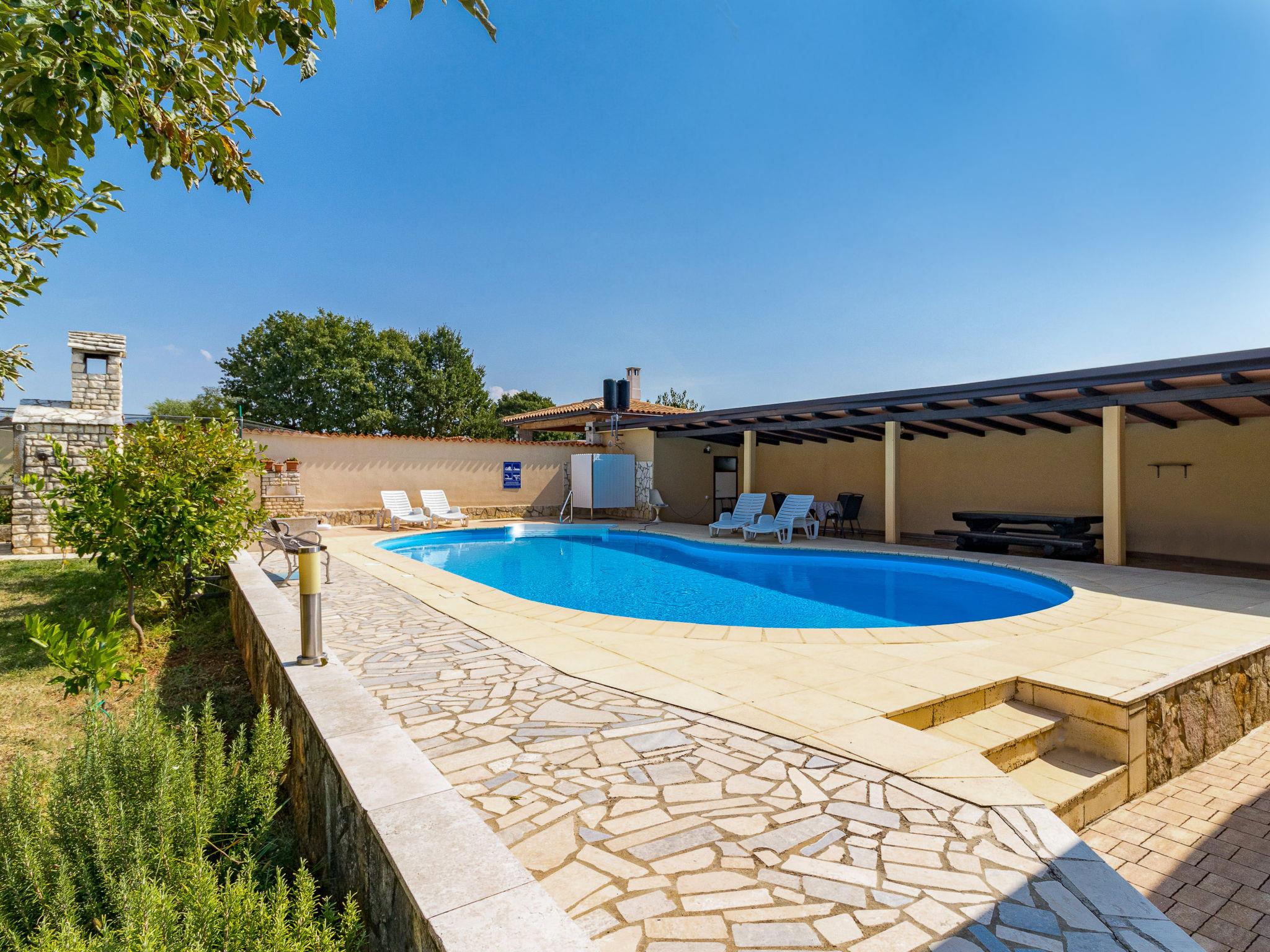 Žbandaj: 3-family house "Dika". 300 m from the centre of Žbandaj, 8 km from the centre of Porec, 8 km from the sea. For shared use: property 1'000 m2 (fenced) with plants and trees, swimming pool (12 x 6 m, depth 100 - 160 cm, seasonal availability: 01.Jun. - 30.Sep.) with internal staircase. Outdoor shower, garden furniture, barbecue, pool maintenance by the owner/gardener. In the house: washing machine (for shared use, extra). Parking at the house on the premises. Shop 300 m, supermarket 1 km, restaurant 200 m, bus stop 8 km, railway station 24 km, pebble beach 8 km.