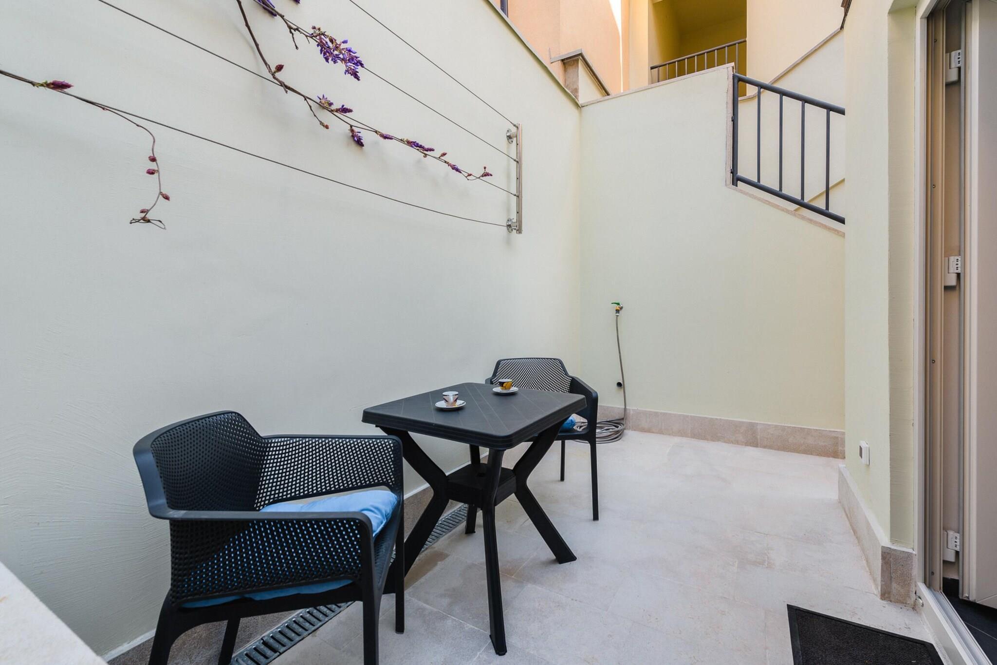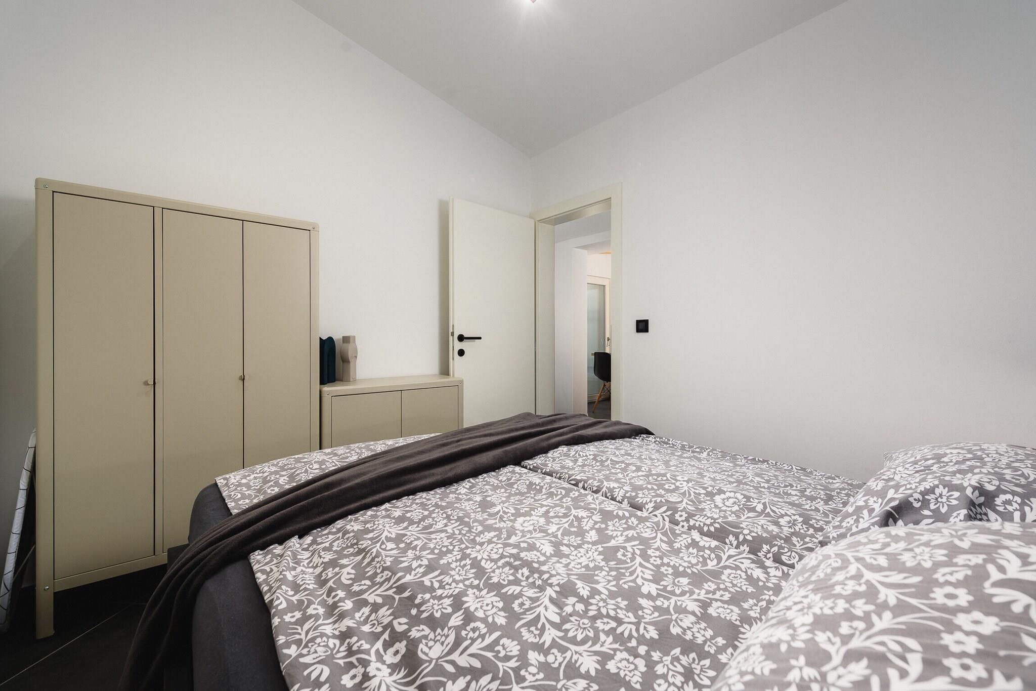 Denne moderne lejlighed i Porec tilbyder et behageligt ophold for op til 4 gæster, med to velindrettede soveværelser og en førsteklasses beliggenhed ved stranden. Indkvarteringen tilbyder alle de nødvendige faciliteter for et afslappende ophold, herunder aircondition, varmepumpe, Wi-Fi og satellit-tv. Gæsterne vil nyde bekvemmeligheden ved en vaskemaskine, strygejern, hårtørrer og en privat balkon, perfekt til at slappe af efter en dag på stranden. Der er udendørs parkering i samme bygning. Ideelt beliggende i et familievenligt område og kun få skridt fra havet, tilbyder denne lejlighed en række nærliggende attraktioner. Det er kun 200 meter fra supermarkedet "Studenac Spadici" til alle dine dagligvarebehov og 280 meter fra den populære "Malu Restaurant" for lokale spisemuligheder. Porecs bymidte ligger 2 km i bil, og offentlig transport er let tilgængelig, og busstationen ligger 3 km væk. Derudover sørger vandlandet "Aquacolors" (5 km) og "Dino Park Funtana" (9 km) for sjov for hele familien. For naturelskere ligger naturreservatet "Fazana - Brijuni Islands" 58 km fra ejendommen, og Pula lufthavn og togstation er bekvemt placeret henholdsvis 59 km og 60 km væk. Lejligheden har et åbent køkken fuldt udstyret med moderne apparater, herunder en glaskeramisk kogeplade, køleskab, mikroovn, ovn og væsentligt køkkenudstyr. For ekstra bekvemmelighed er der en kaffemaskine og elkedel, perfekt til at tilberede drinks og snacks. Med sin kombination af førsteklasses beliggenhed, moderne bekvemmeligheder og nærhed til lokale attraktioner tilbyder denne lejlighed en fantastisk base for at udforske Porec og dens omgivelser.