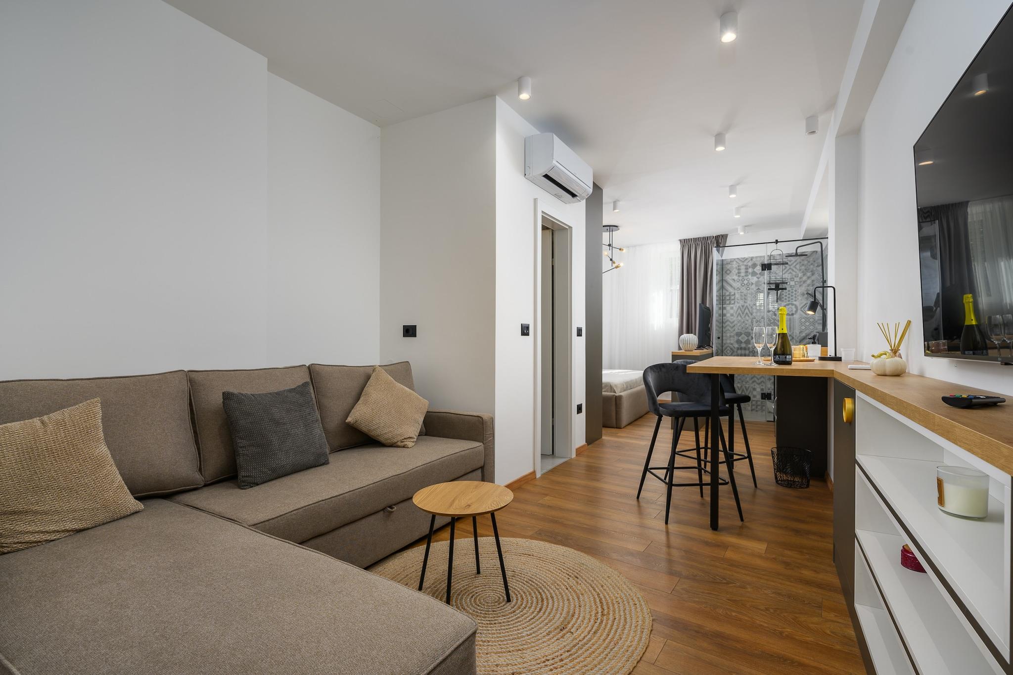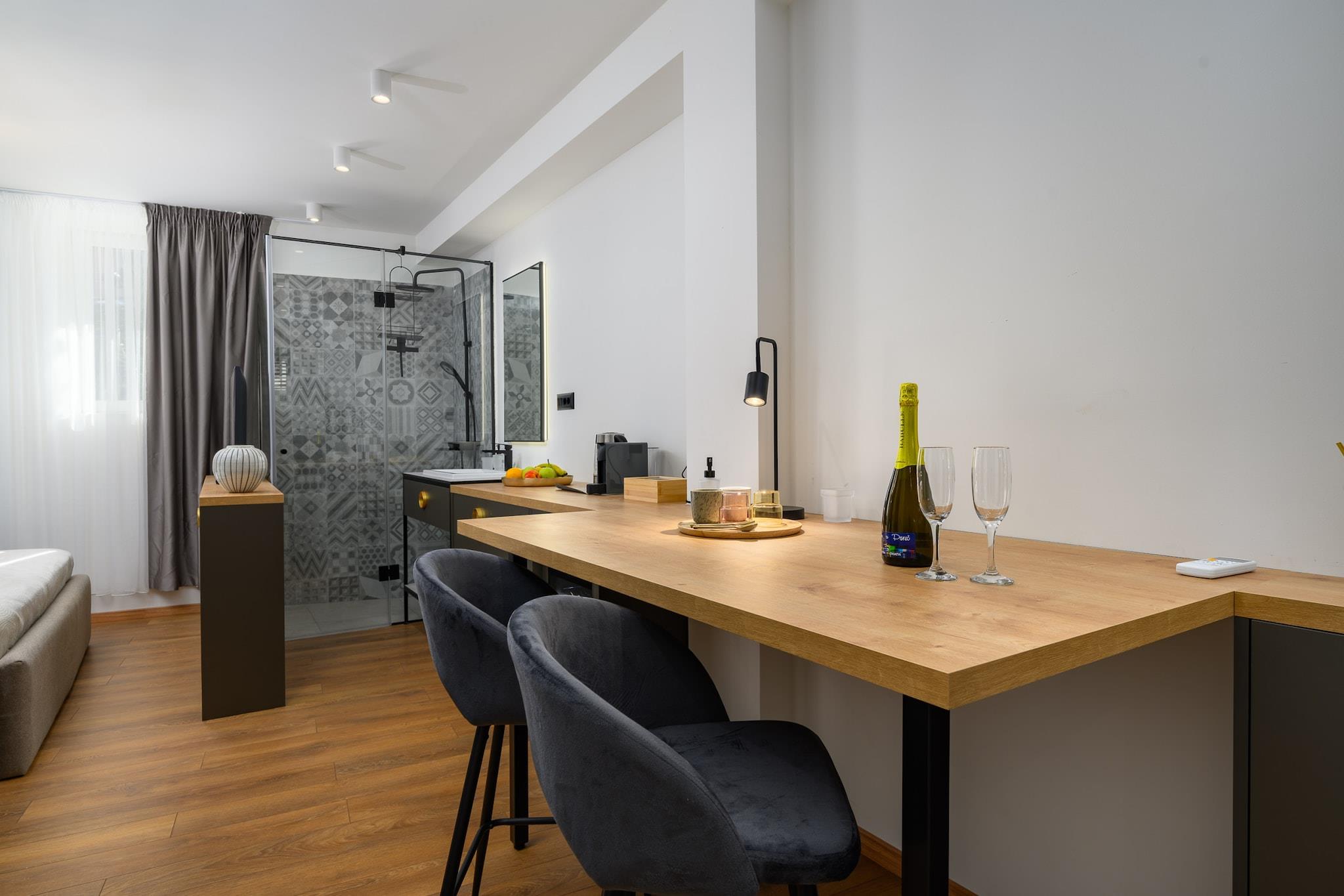 Denne moderne og hyggelige leje-for-værelse indkvartering i Porec tilbyder et perfekt tilflugtssted for op til 4 personer med 32 m² stilfuldt boligareal. Beliggende lige ved havnefronten giver det en unik mulighed for at nyde charmen i Porecs gamle bydel, med nem adgang til alle de lokale attraktioner og faciliteter. Ejendommen ligger kun få skridt fra den gamle bydel (0 m) og 2 meter fra den populære "Restaurant Cardo", hvilket gør det til et fantastisk sted for madelskere. Indkvarteringen er bekvemt placeret i nærheden af flere strande, herunder klippestranden "Old Town beach" (250 m) og sandstranden ved "St. Nicola"s Island" (1 km). Supermarkeder, restauranter og offentlig transport er inden for gåafstand, med "Konzum Supermarket" kun 500 m væk og Porec busstation 800 m fra ejendommen. For dem, der søger mere sjov, er vandparken 4 km. Forlystelsesparken Funtana" ligger 7 km fra ejendommen. Indenfor er værelset udstyret med aircondition, Wi-Fi, et tv med satellitkanaler og en balkon til at nyde den omkringliggende udsigt. Det kompakte køkken har køleskab, kaffemaskine og kedel, hvilket gør det nemt at tilberede lette måltider. Med sin centrale beliggenhed og moderne bekvemmeligheder er denne bolig perfekt for alle, der ønsker at udforske Porec, mens de nyder et behageligt ophold.