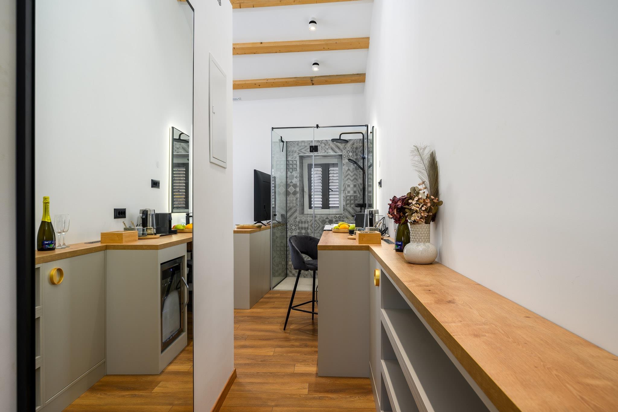 Denne moderne og charmerende lejlighed i et værelse i Porec tilbyder 32 m² plads og er ideel til op til 4 gæster. Det er beliggende i hjertet af Porecs gamle bydel, kun 2 meter fra den berømte "Restaurant Cardo" og 250 meter fra klippestranden "Old Town City Beach". Ejendommen har en beliggenhed ved vandet og er omgivet af et væld af attraktioner. I nærheden kan du besøge "Konzum Supermarket" (500 m), Porec busstation (800 m) og nyde sandkysten af "St Nicola's Island"-stranden, kun 1 km væk. For familievenlig sjov ligger vandlandet "Aquacolors" 4 km derfra, og forlystelsesparken "Dino Park Funtana" ligger 7 km fra ejendommen. Indkvarteringen ligger også tæt på "Mirna-floden" (15 km), "Pazin Train Station" (33 km) og "Pula Lufthavn" (50 km). Det berømte naturreservat "Fazana – til Brijuni Islands" er også let tilgængeligt. Værelset er udstyret med moderne bekvemmeligheder såsom aircondition, Wi-Fi, pengeskab, satellit-tv (på engelsk og tysk), hårtørrer og balkon. Køkkenet er veludstyret med køleskab, kaffemaskine og elkedel. Denne centralt beliggende og fuldt udstyrede indkvartering tilbyder den perfekte base for at udforske Porec og dets omkringliggende attraktioner, mens du nyder et behageligt og afslappende ophold.