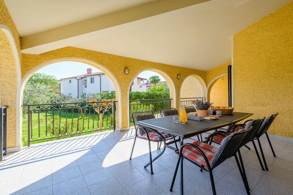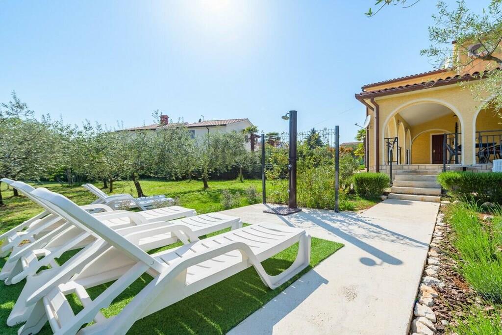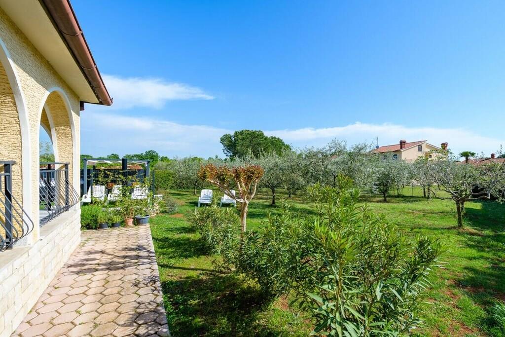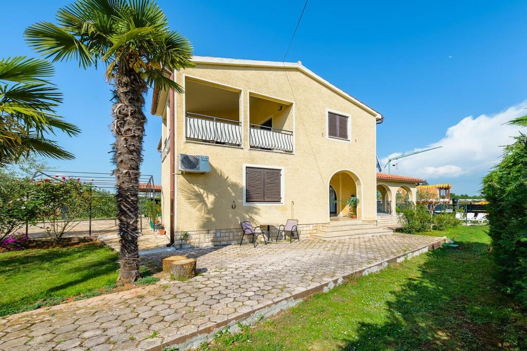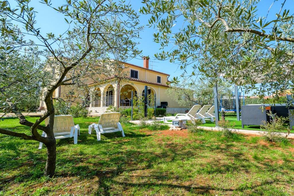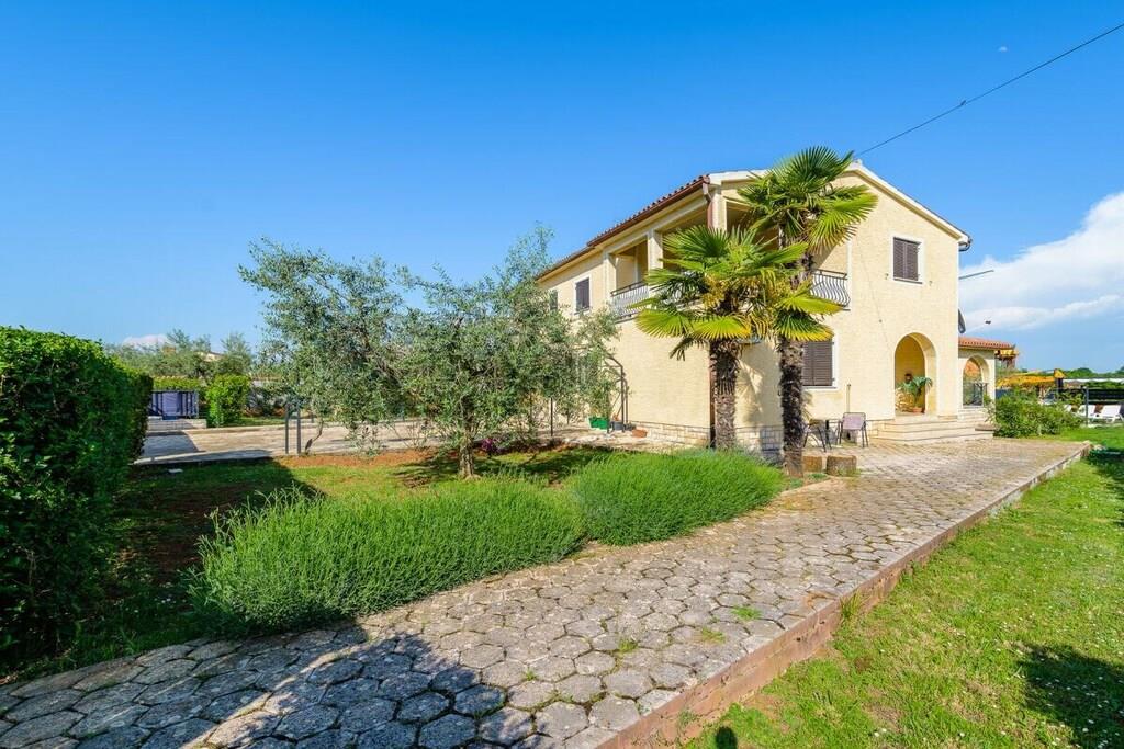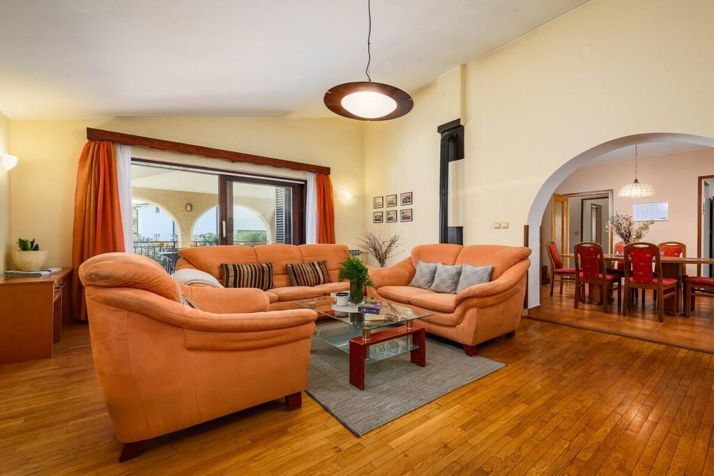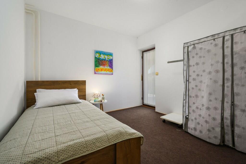 Den består af tre soveværelser, to dobbeltværelser og et enkeltværelse. Der er en rummelig stue med udsigt over en stor terrasse og haven. Der er to badeværelser, et fuldt udstyret køkken. Der er gratis WiFi og parkering på ejendommen. Grillpladsen i haven deles med lejligheden på anden sal. Dette er et familiehus med to lejligheder.