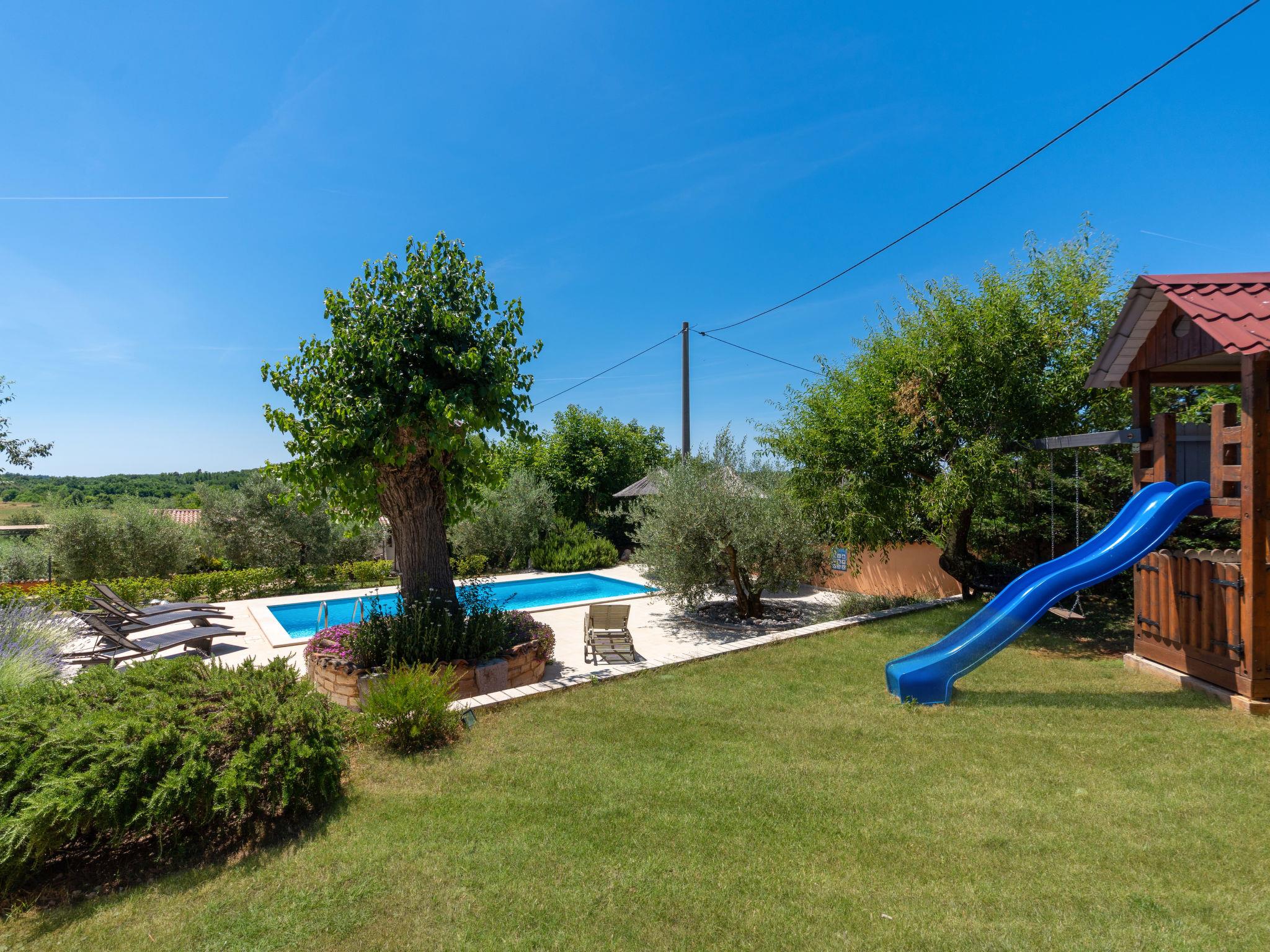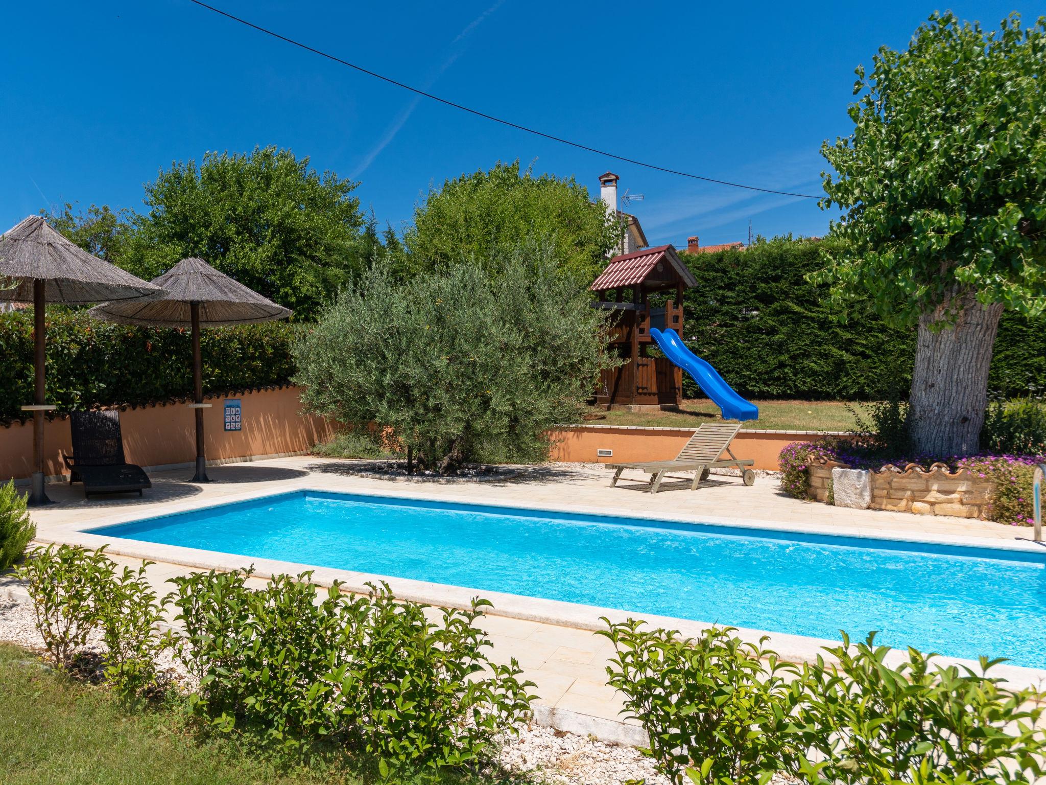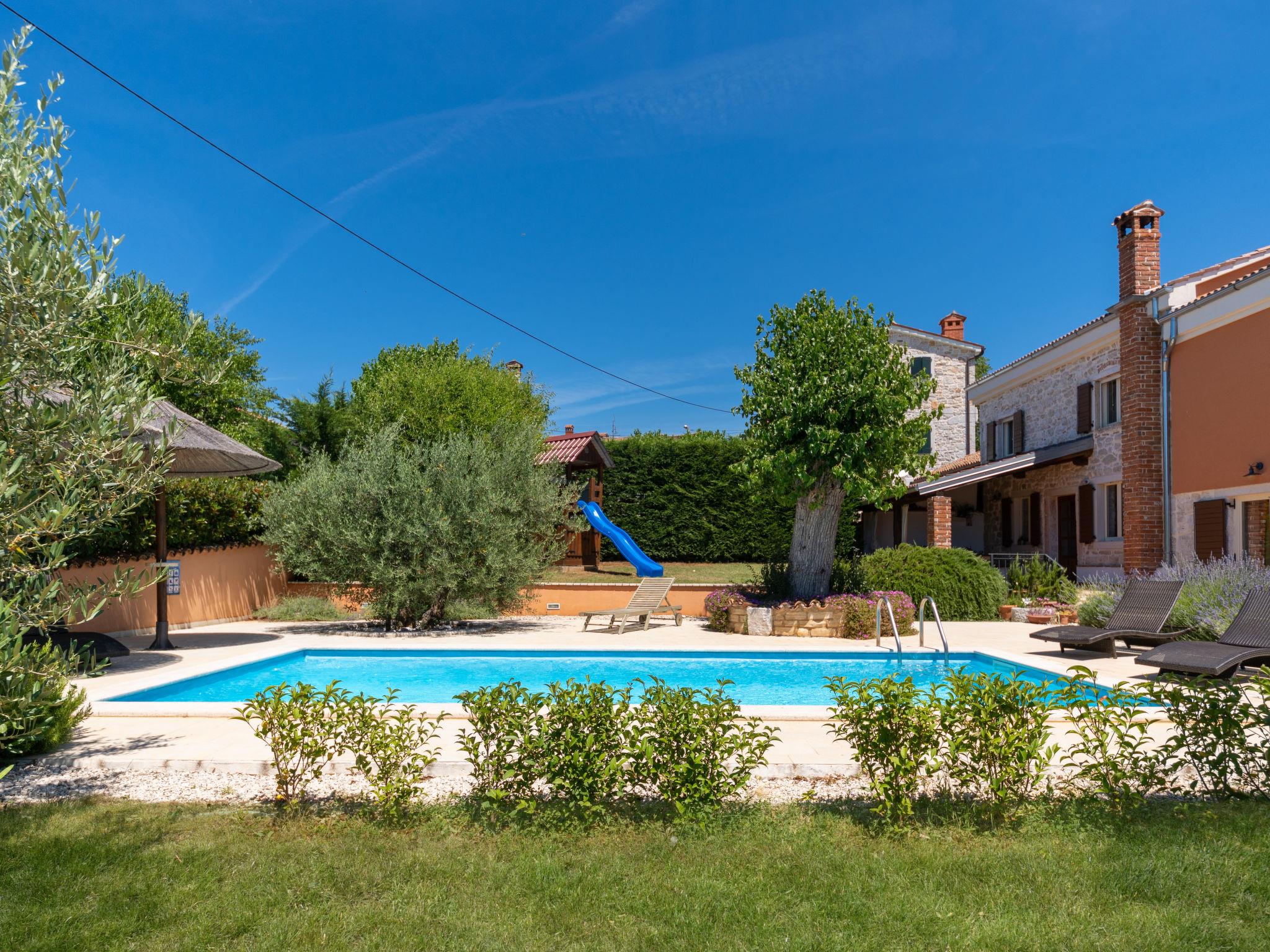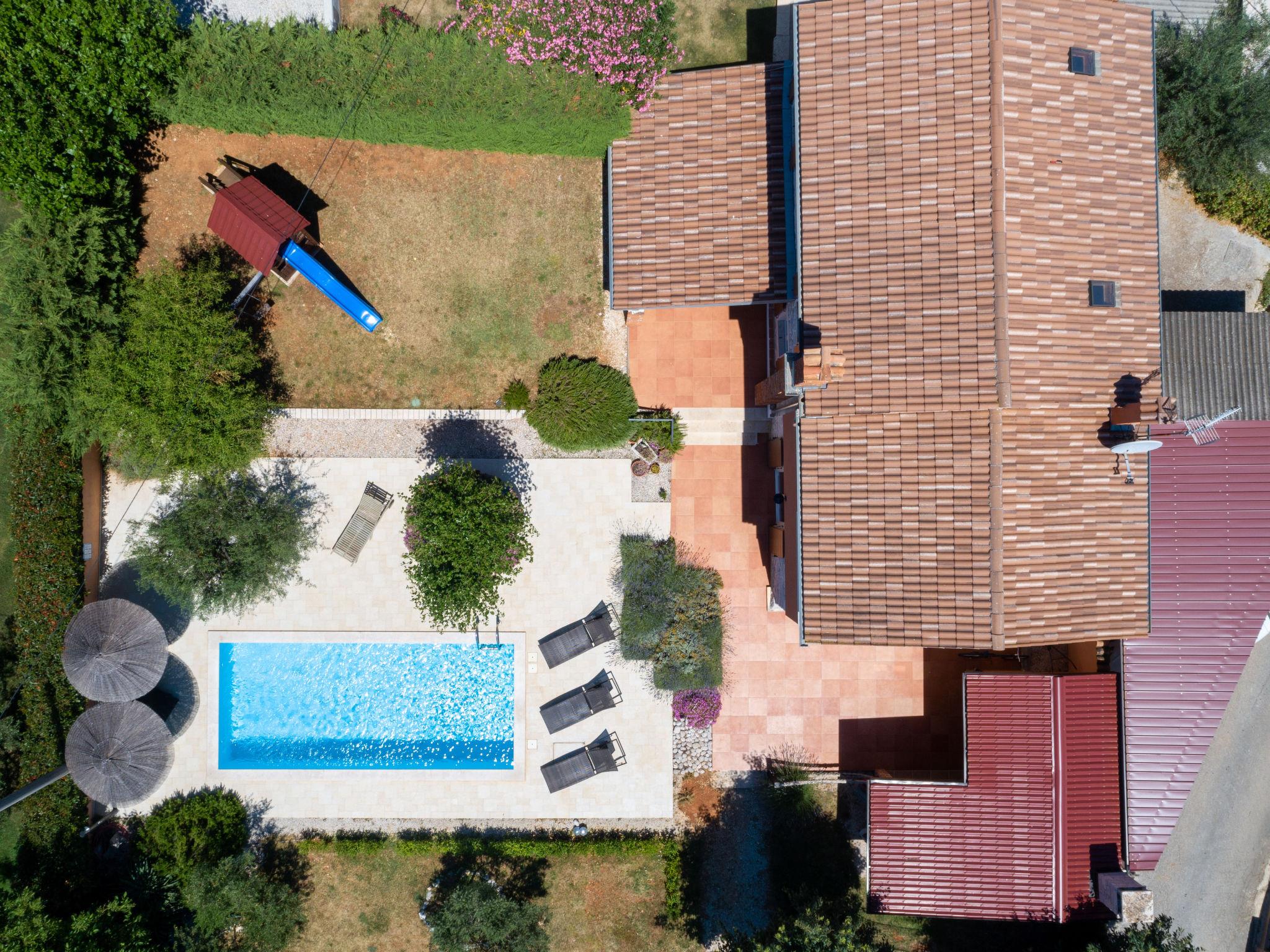 Single-family house "Petra", 2 storeys. In the hamlet Dracevac 3 km from the centre of Žbadanj, 8 km from the centre of Porec, in a quiet, sunny position, 9 km from the sea, in a cul-de-sac. Private: property 930 m2 with lawn 280 m2 wildlife garden, swimming pool angular (6 x 4 m, depth 140 cm, seasonal availability: 01.May. - 31.Oct.). Outdoor shower, terrace (20 m2), garden furniture, barbecue, children's playground (slide, swing), pool maintenance by the owner/gardener. In the house: internet access, washing machine. Roofed, parking (for 2 cars) at the house on the premises. Shop 3 km, supermarket 8 km, restaurant 3 km, bus stop 2.8 km. Private: outdoor kitchen.