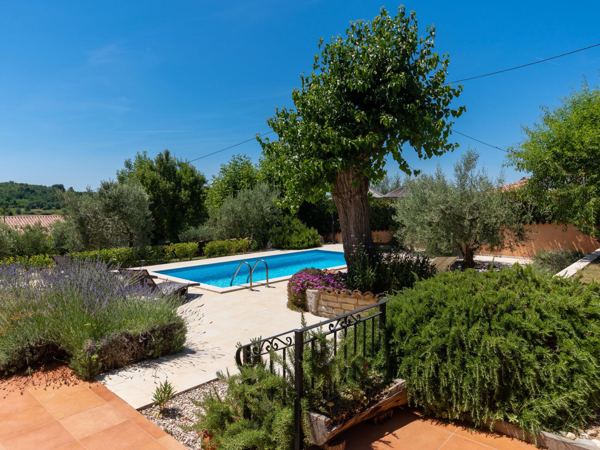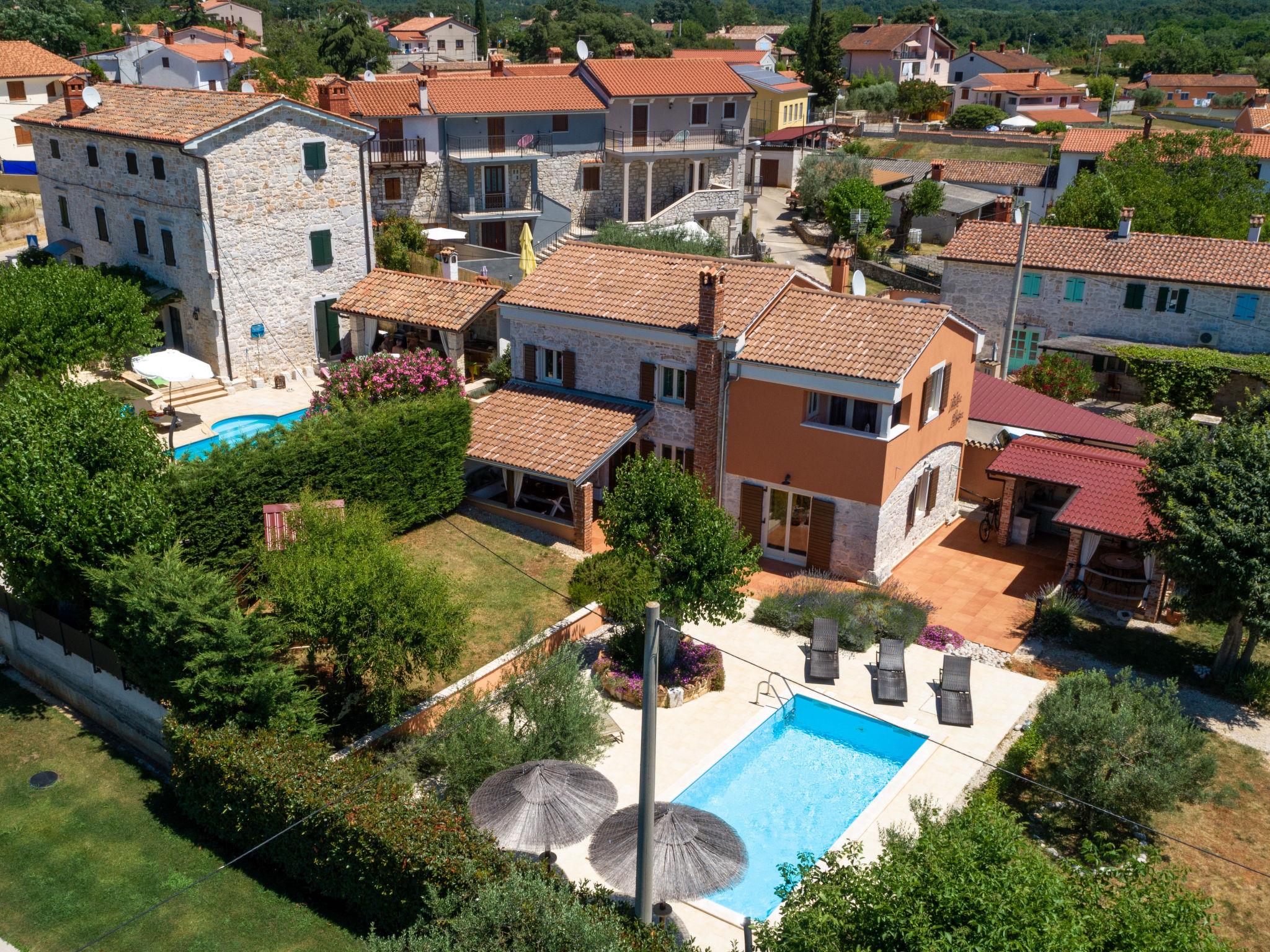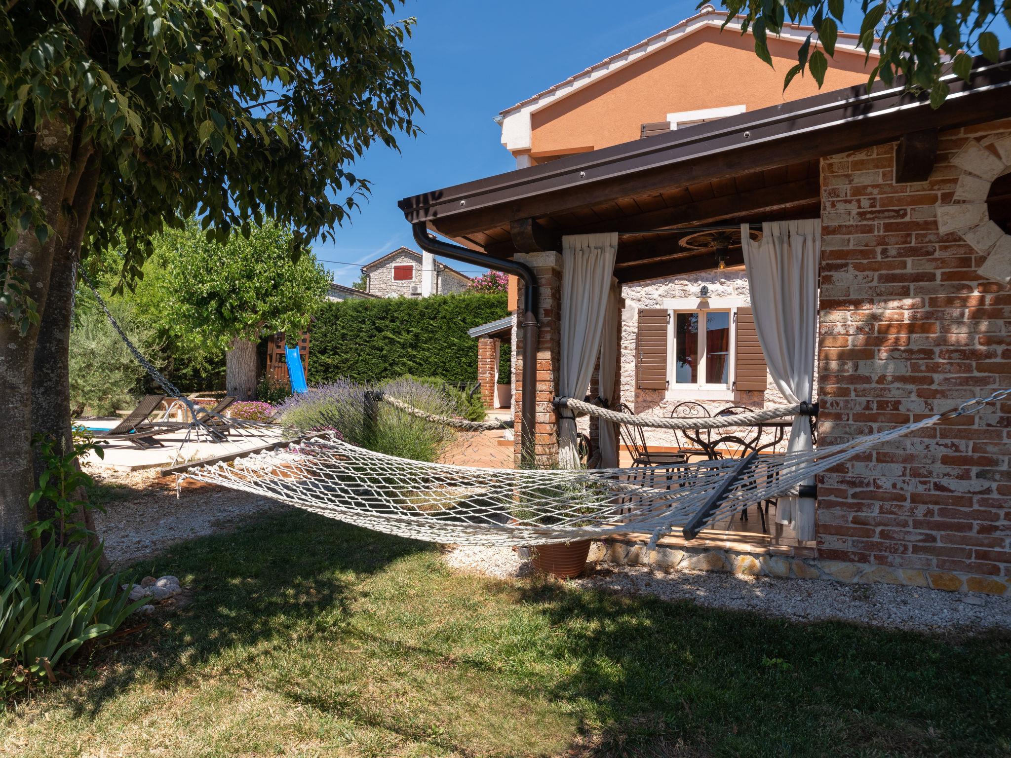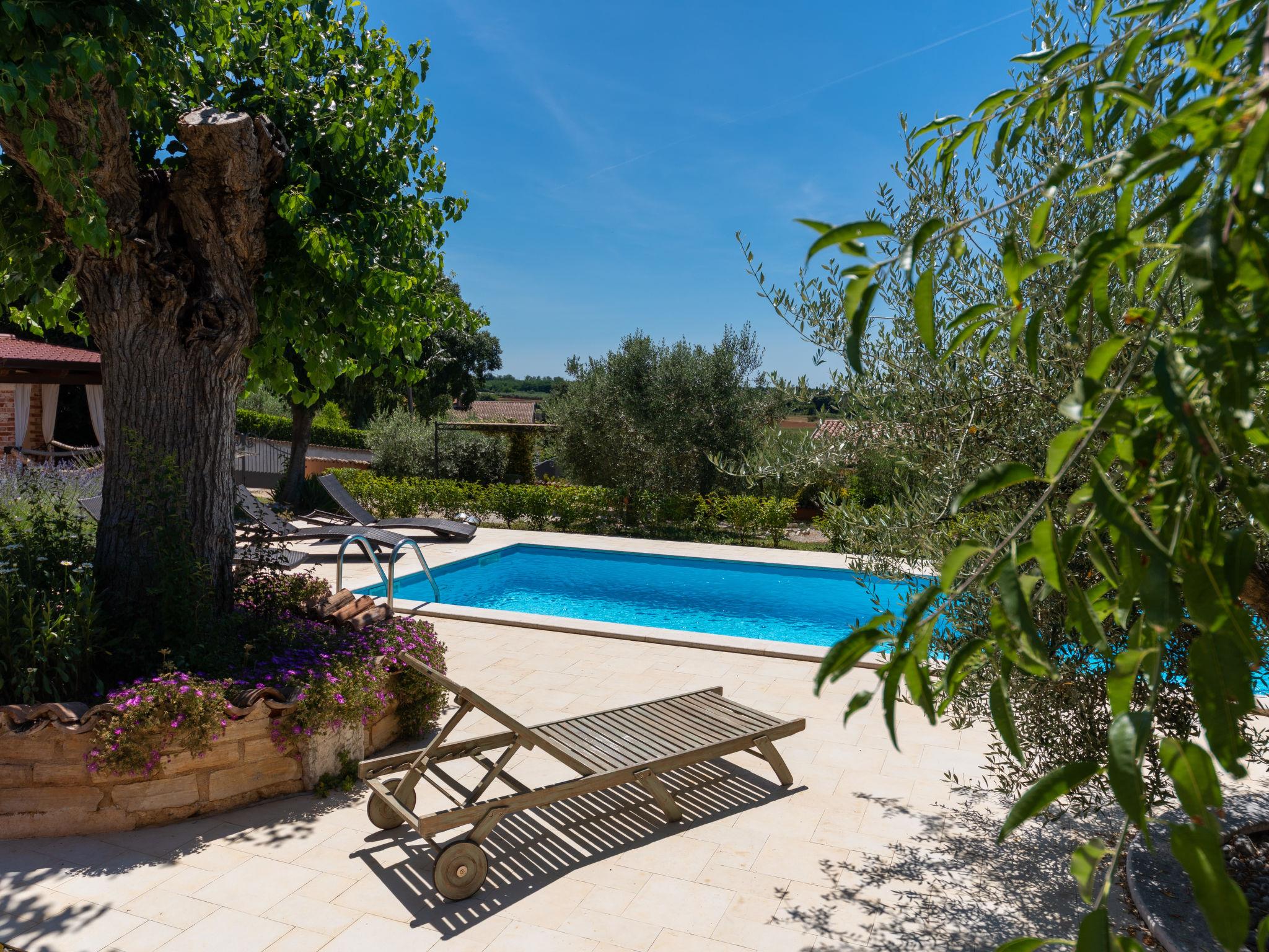 Single-family house "Petra", 2 storeys. In the hamlet Dracevac 3 km from the centre of Žbadanj, 8 km from the centre of Porec, in a quiet, sunny position, 9 km from the sea, in a cul-de-sac. Private: property 930 m2 with lawn 280 m2 wildlife garden, swimming pool angular (6 x 4 m, depth 140 cm, seasonal availability: 01.May. - 31.Oct.). Outdoor shower, terrace (20 m2), garden furniture, barbecue, children's playground (slide, swing), pool maintenance by the owner/gardener. In the house: internet access, washing machine. Roofed, parking (for 2 cars) at the house on the premises. Shop 3 km, supermarket 8 km, restaurant 3 km, bus stop 2.8 km. Private: outdoor kitchen.