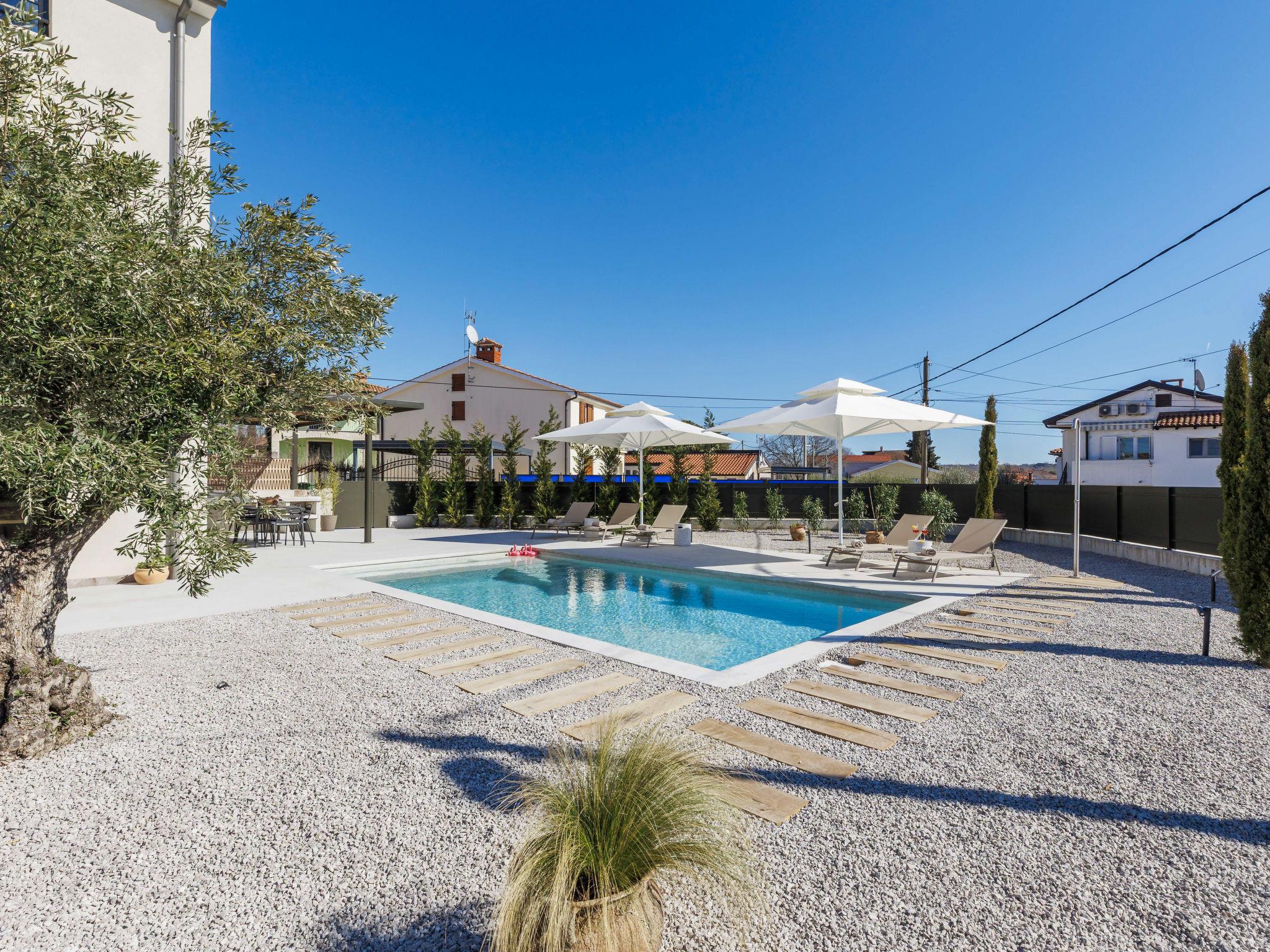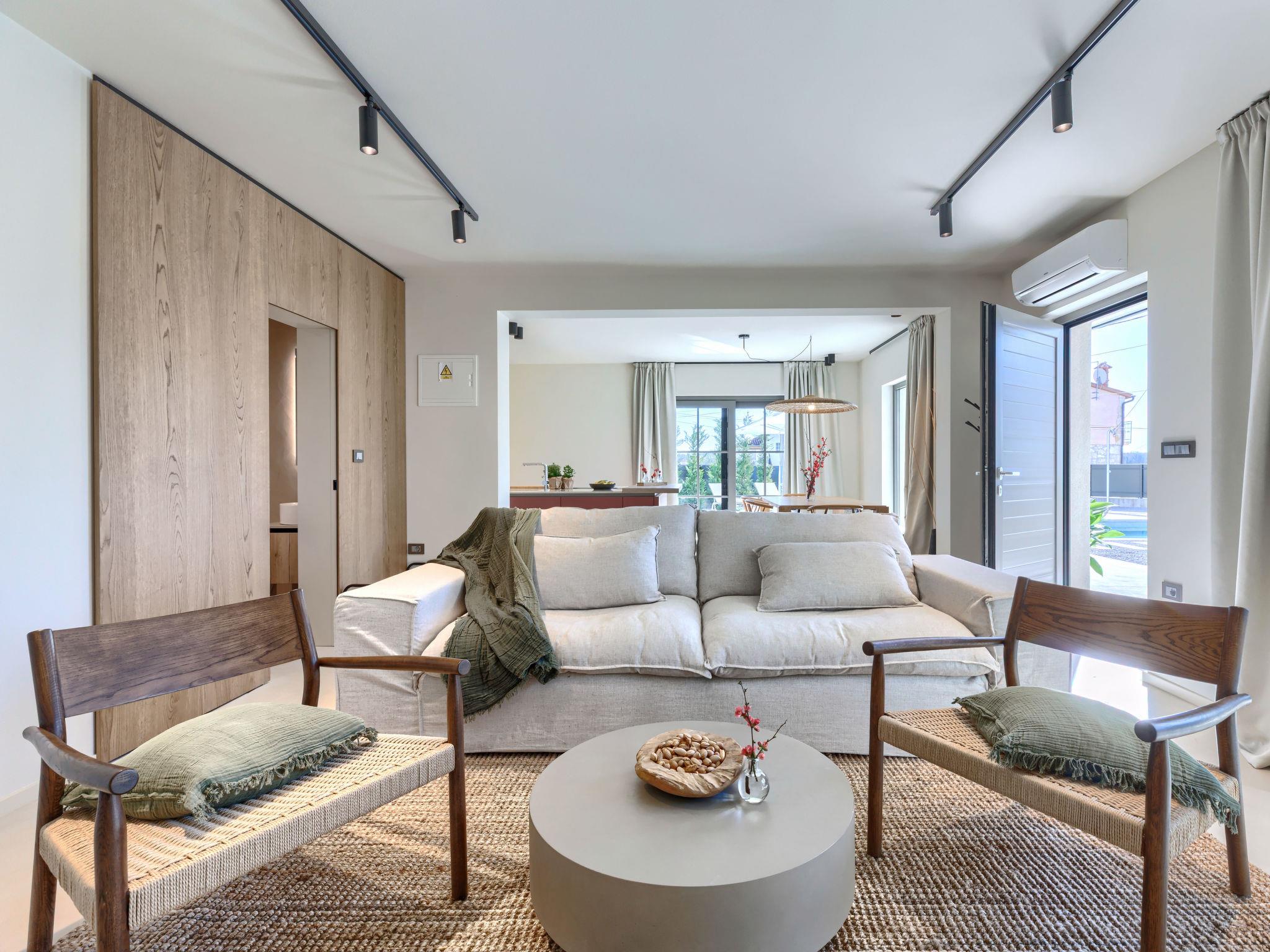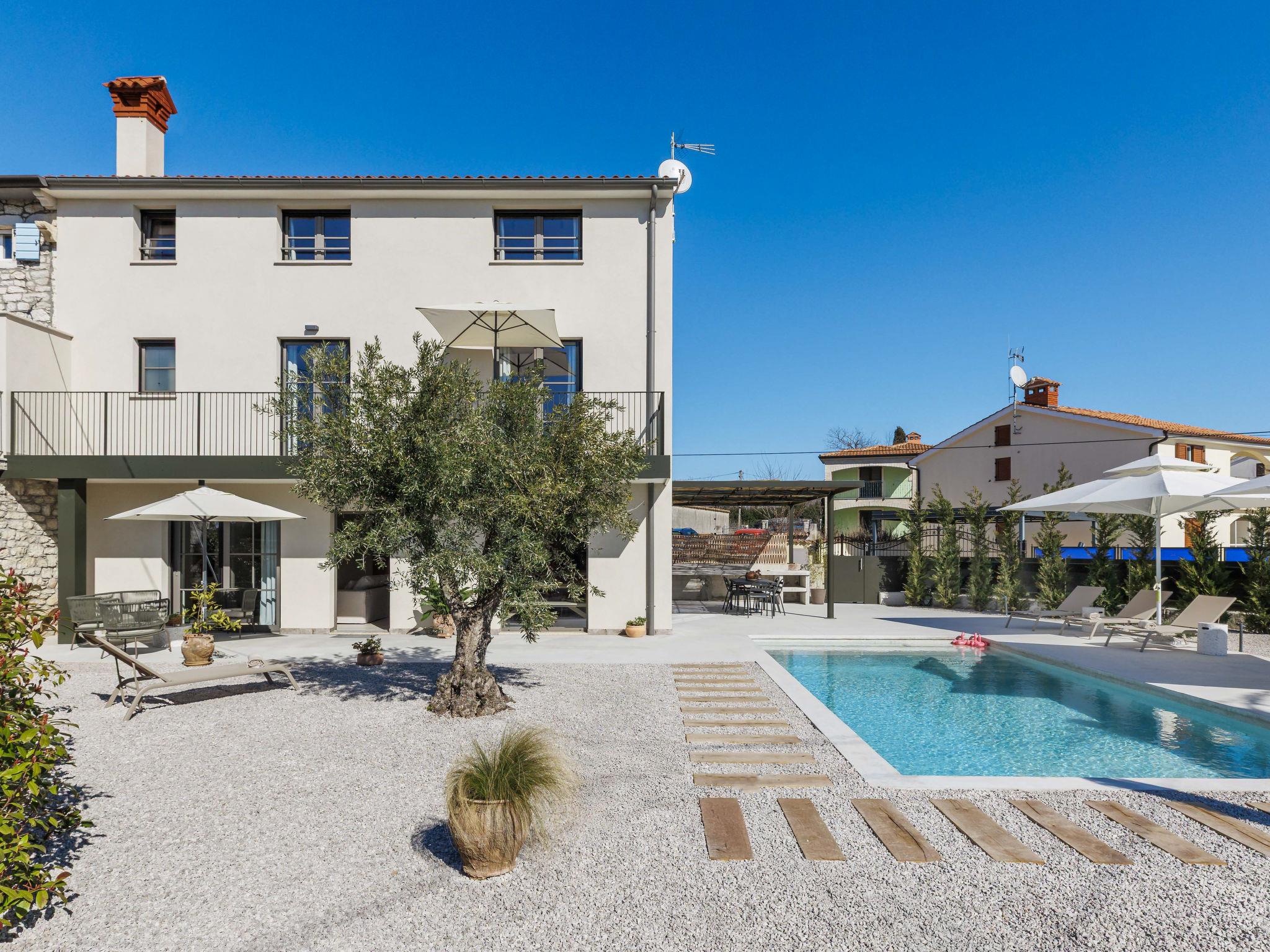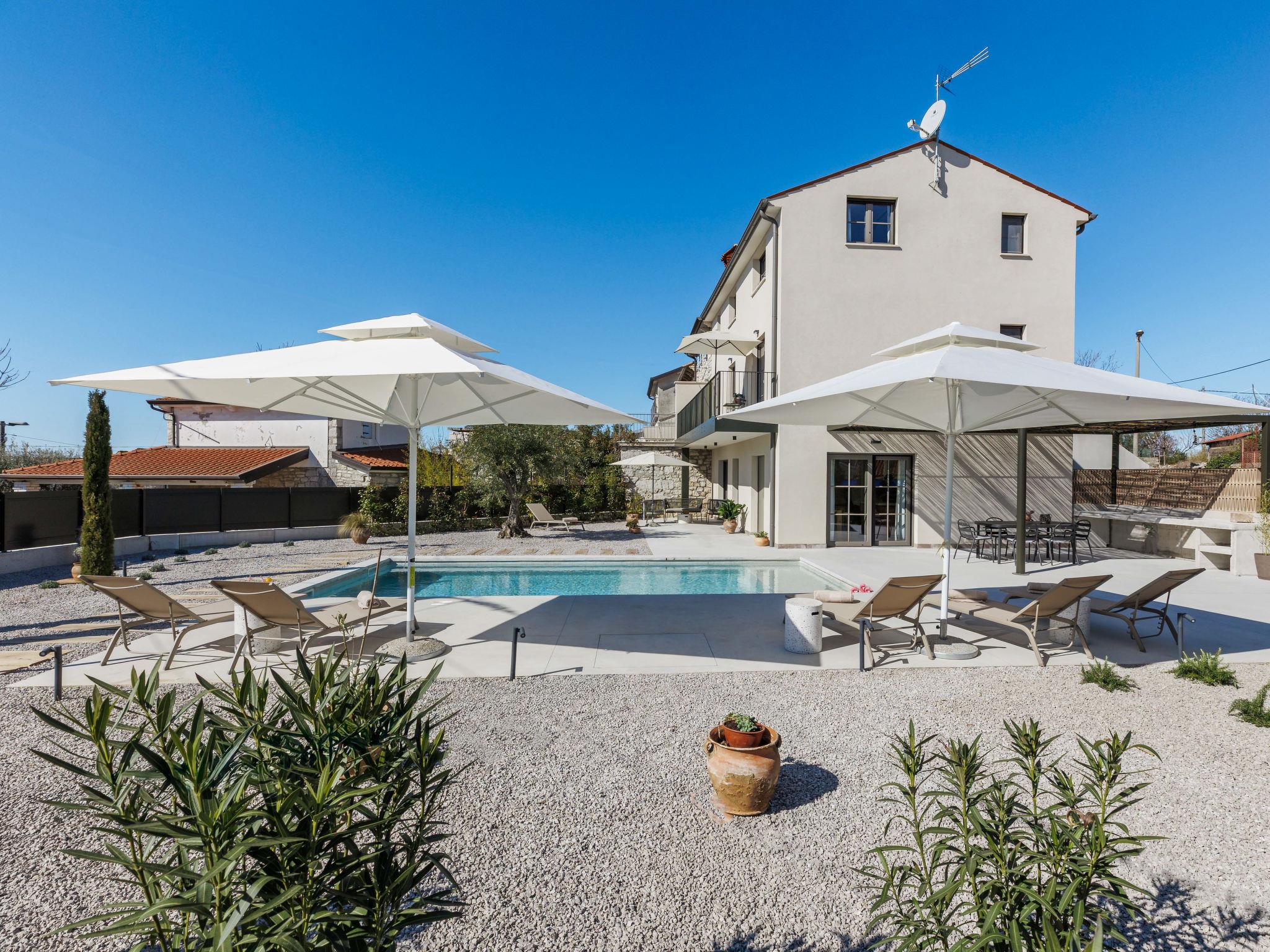 Very beautiful semi-detached house "Minda", 3 storeys, built in 2024. In the hamlet Dracevac, 8 km from the centre of Porec, in a quiet, sunny position, 9 km from the sea. Private: property 580 m2 (fenced), swimming pool angular (8 x 4 m, depth 145 cm, seasonal availability: 01.May. - 31.Oct.). Outdoor shower, terrace (20 m2), garden furniture, barbecue, pool maintenance by the owner/gardener. In the house: internet access, sauna, washing machine. Parking (for 2 cars) at the house on the premises. Shop 3 km, supermarket 8 km, restaurant 3 km, bus stop 2.8 km. Please note: airfield 50 km from the property.