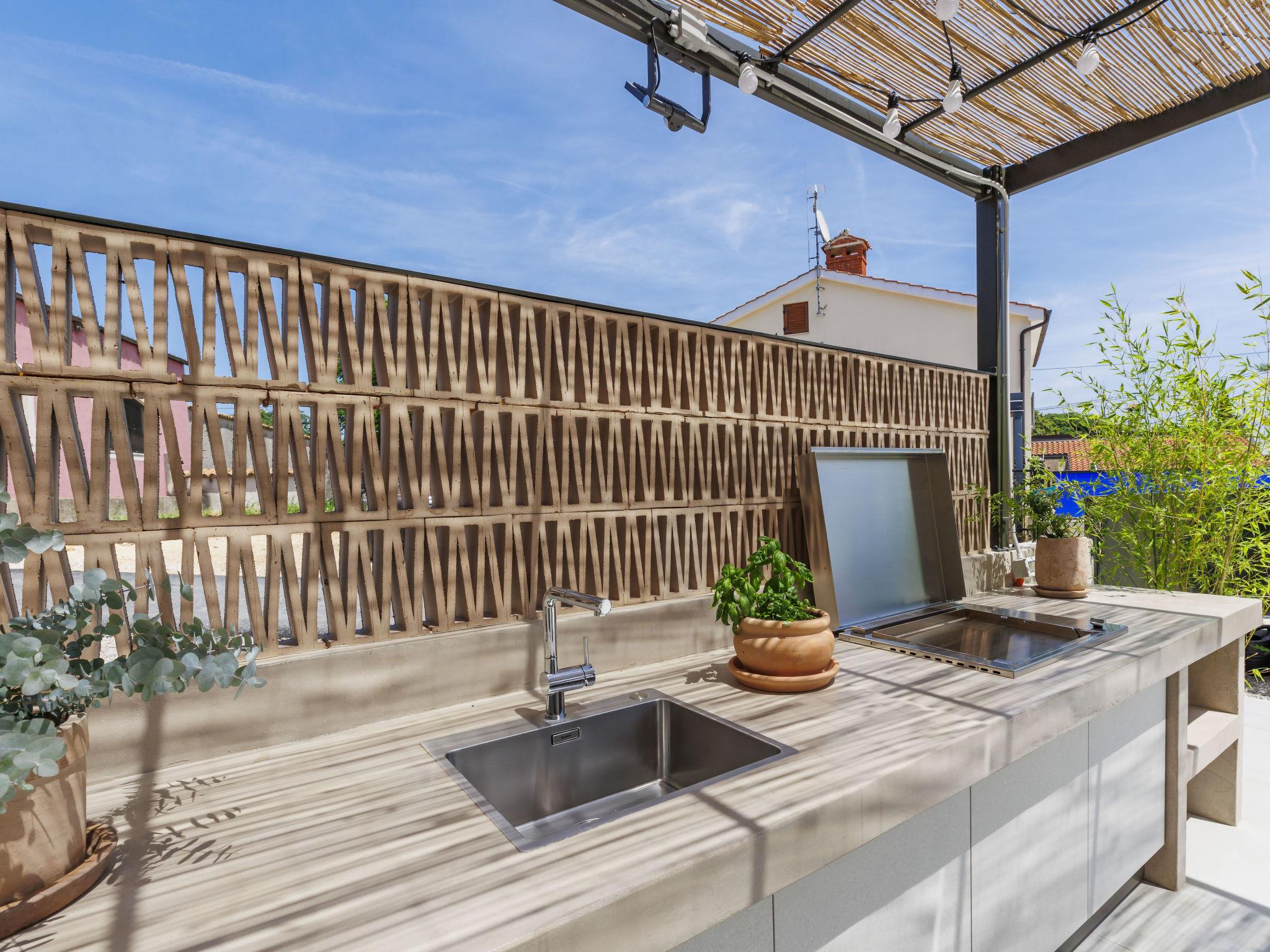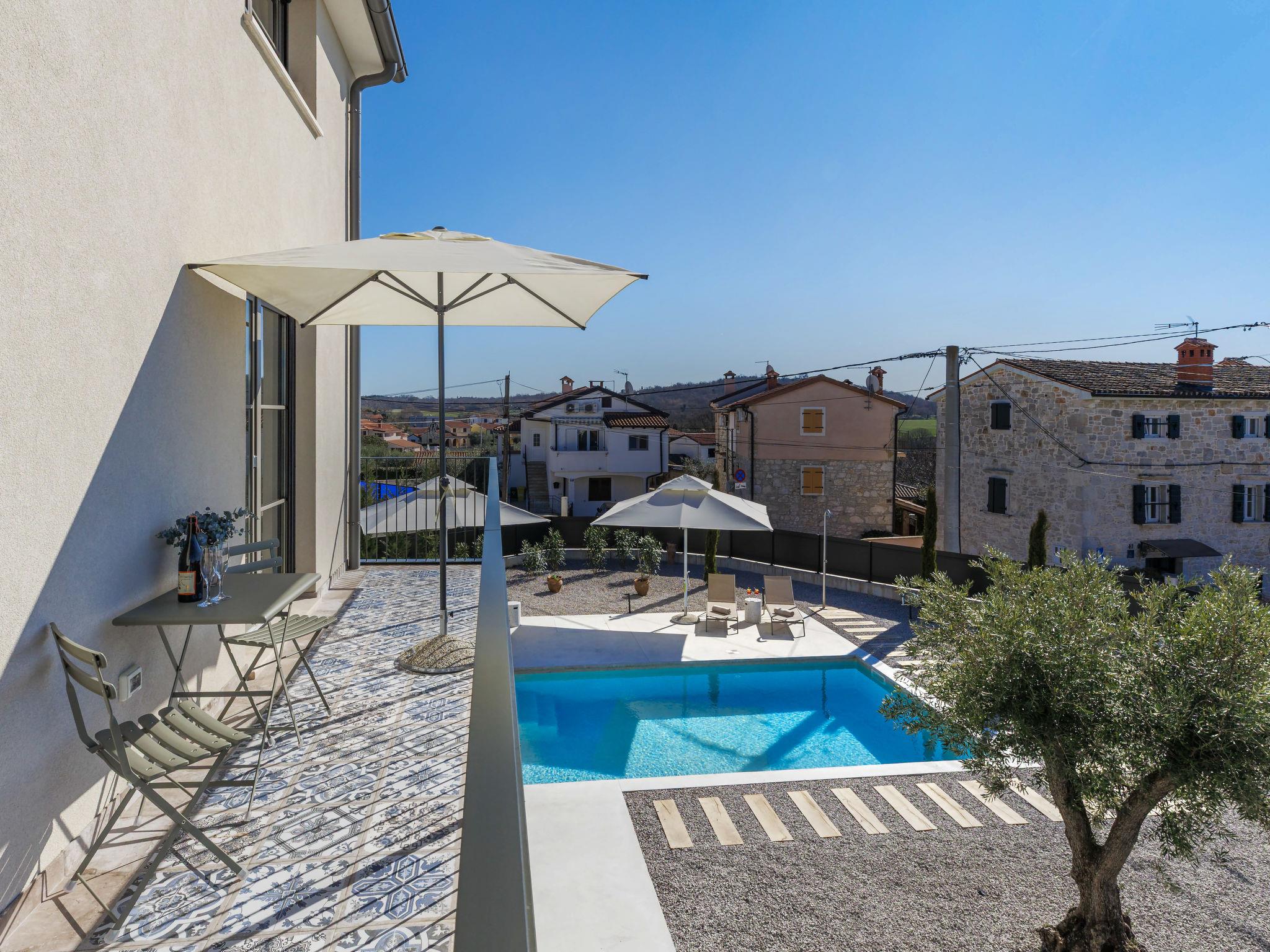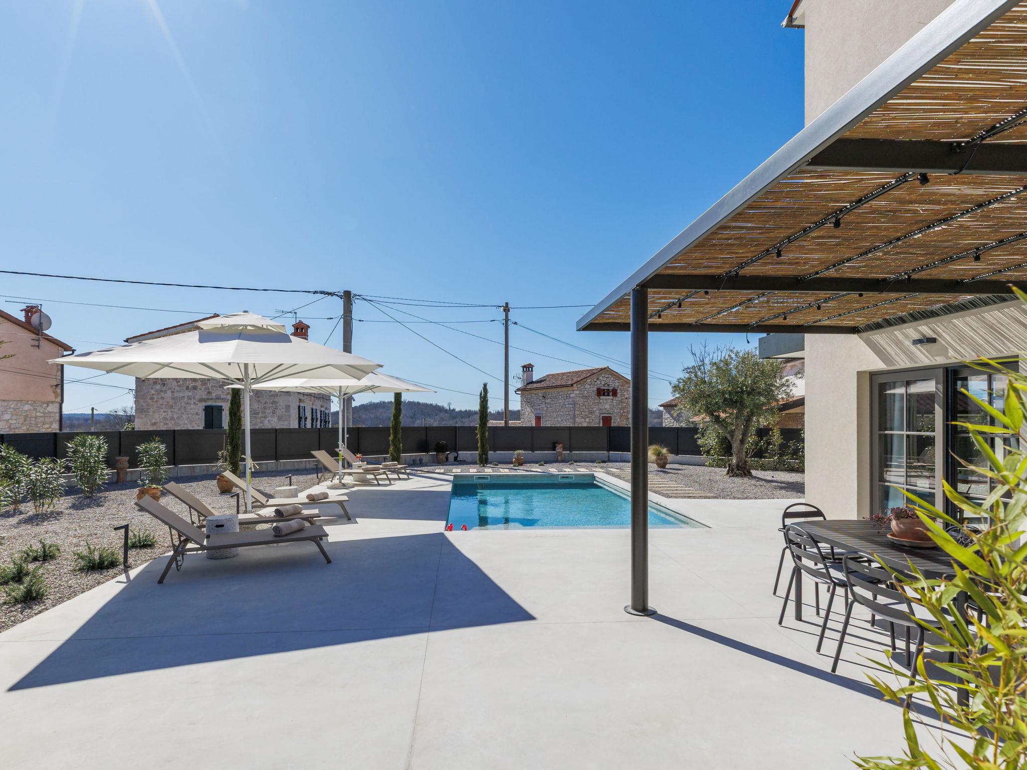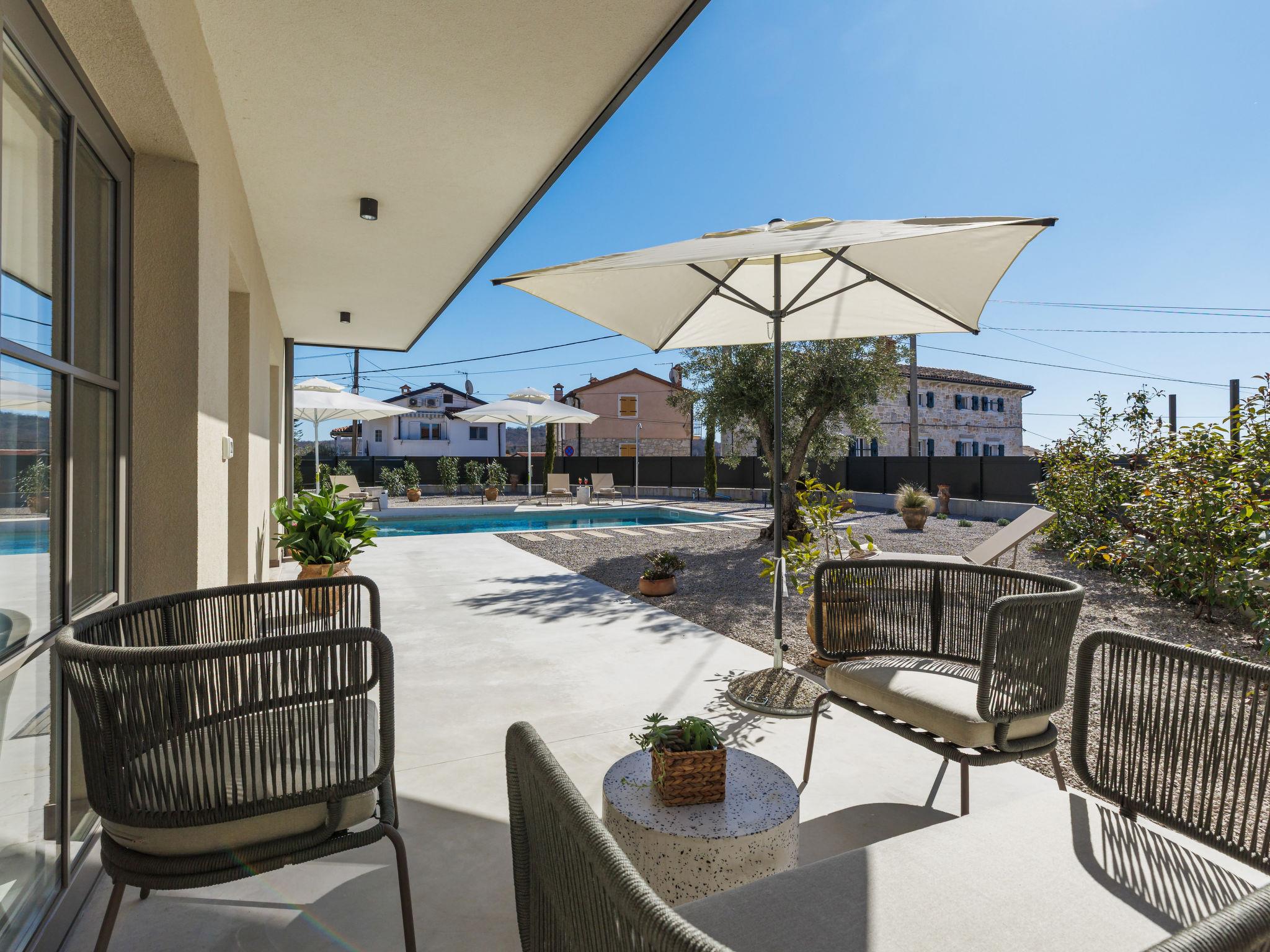Very beautiful semi-detached house "Minda", 3 storeys, built in 2024. In the hamlet Dracevac, 8 km from the centre of Porec, in a quiet, sunny position, 9 km from the sea. Private: property 580 m2 (fenced), swimming pool angular (8 x 4 m, depth 145 cm, seasonal availability: 01.May. - 31.Oct.). Outdoor shower, terrace (20 m2), garden furniture, barbecue, pool maintenance by the owner/gardener. In the house: internet access, sauna, washing machine. Parking (for 2 cars) at the house on the premises. Shop 3 km, supermarket 8 km, restaurant 3 km, bus stop 2.8 km. Please note: airfield 50 km from the property.